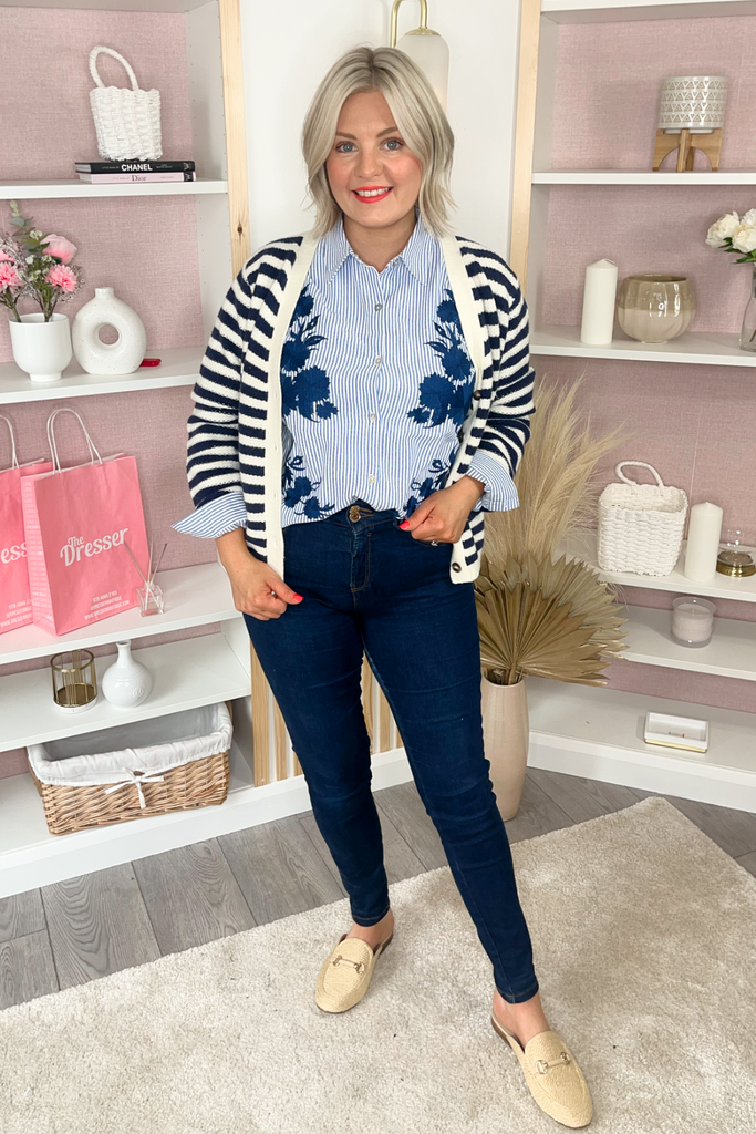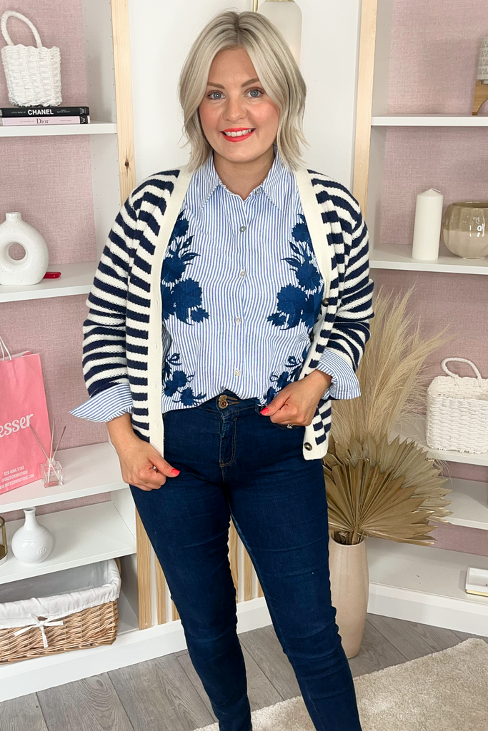 Striped blue and white oversized blouse with stunning embroidery detail down both fronts. With collar and dipped hemline to the back