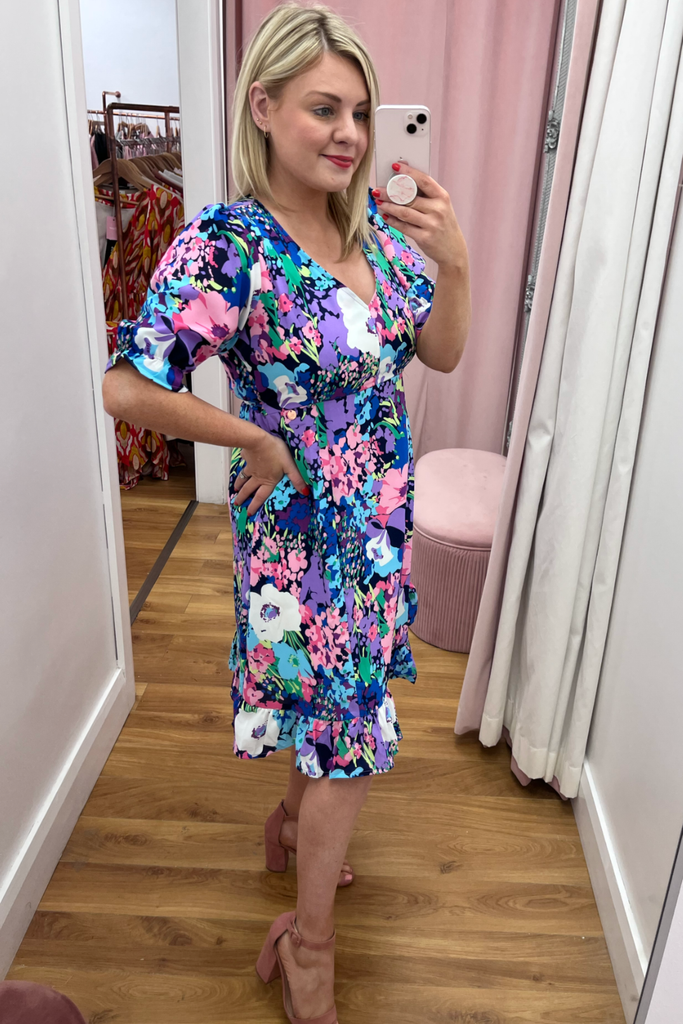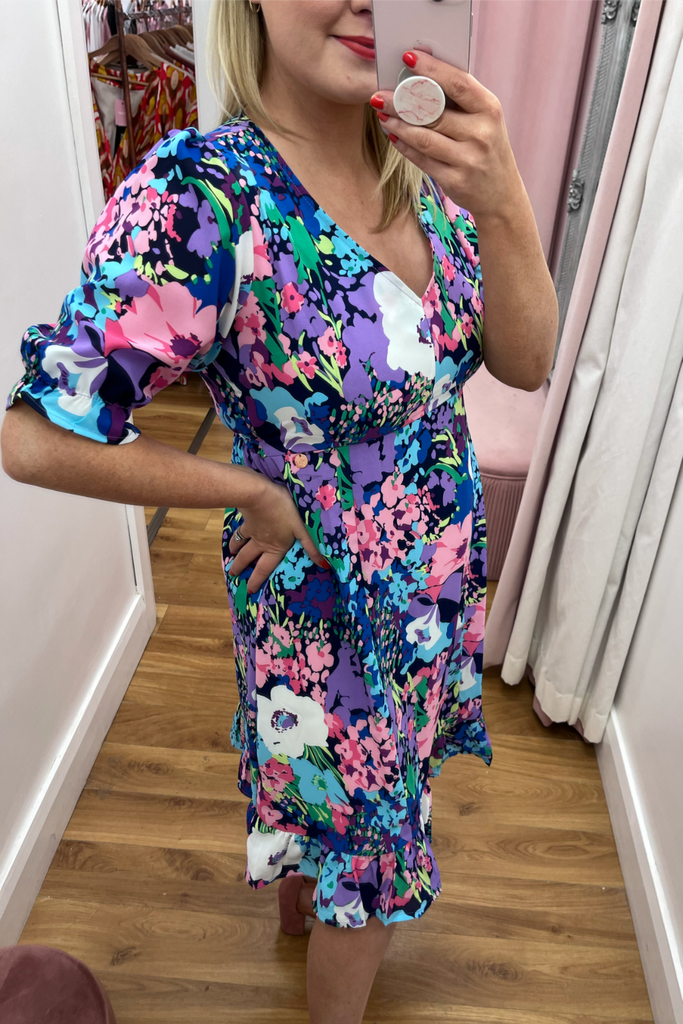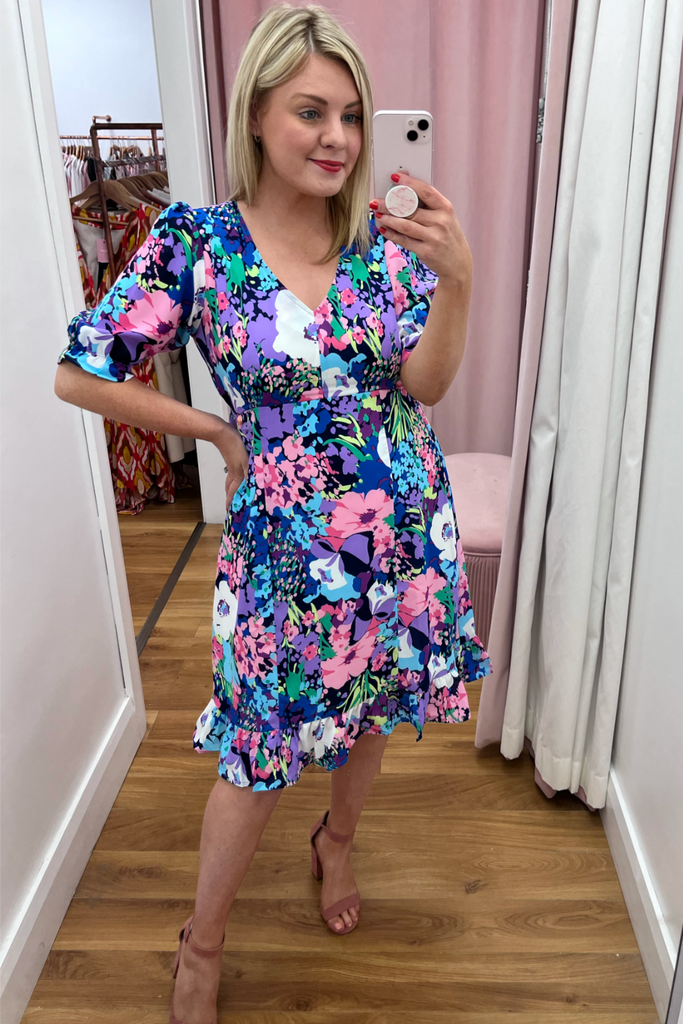 Knee-length V-neck dress with fitted waist, tie belt and half puff sleeves with peplum cuff. Features a vibrant floral print and delicate frilled hemline