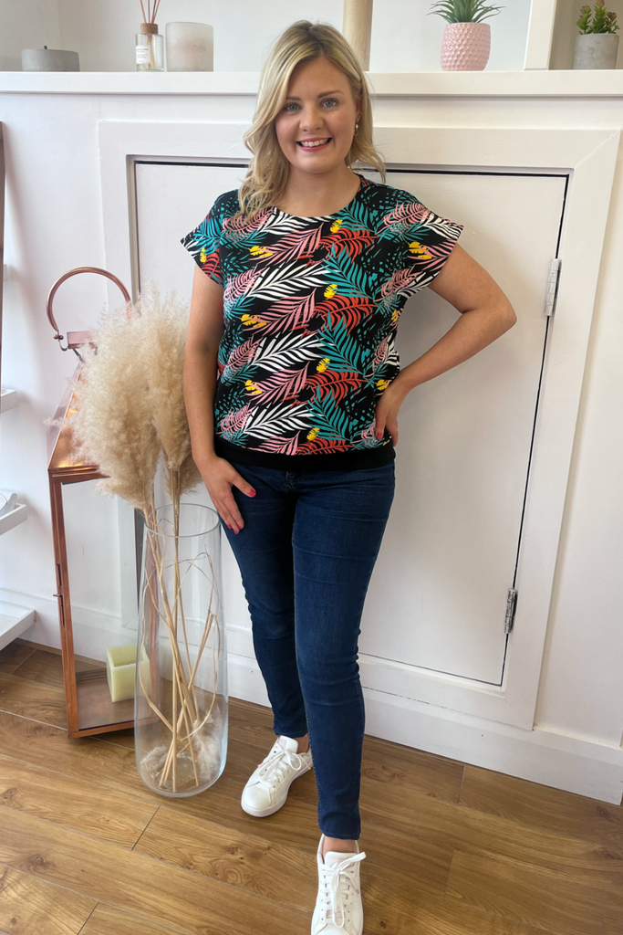 In a mix of tropical colours on a black base, with a black sporty waistband for comfort and style!