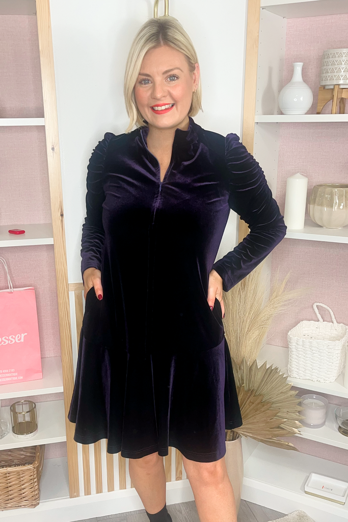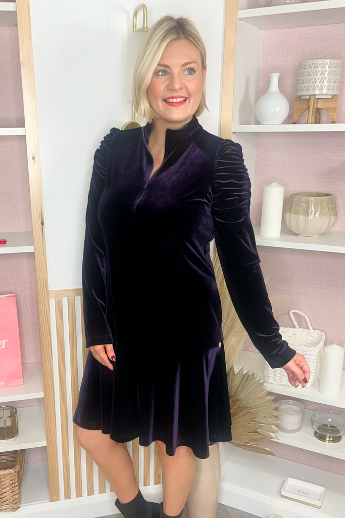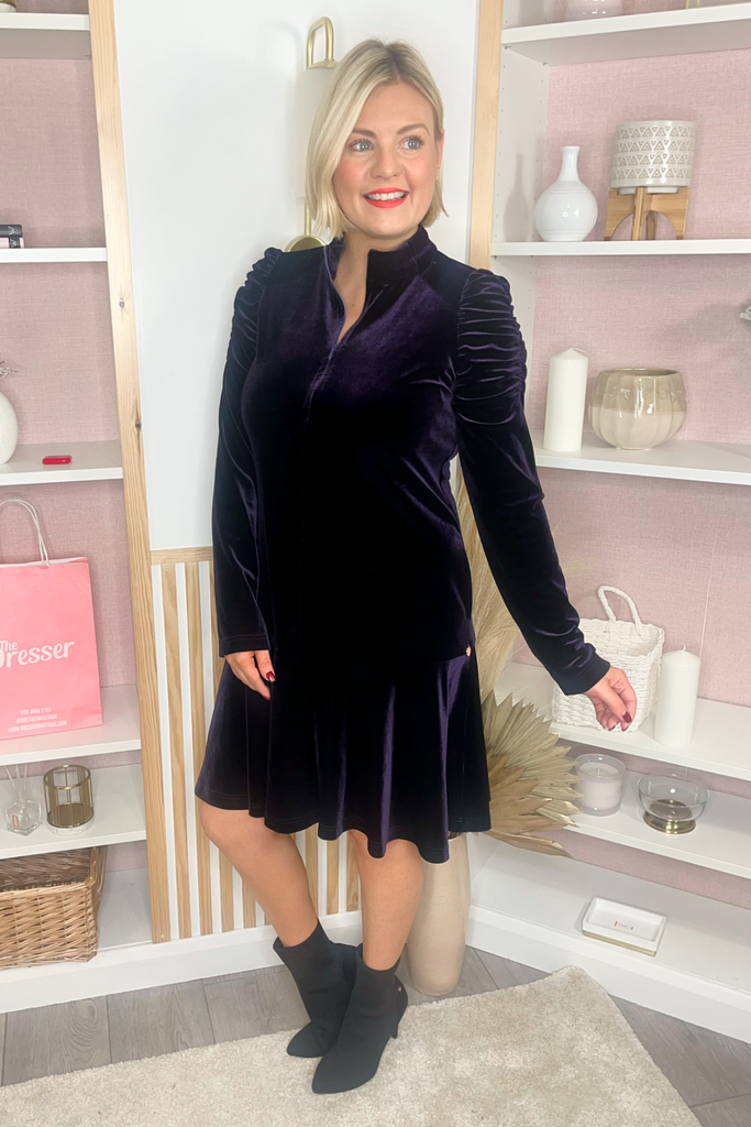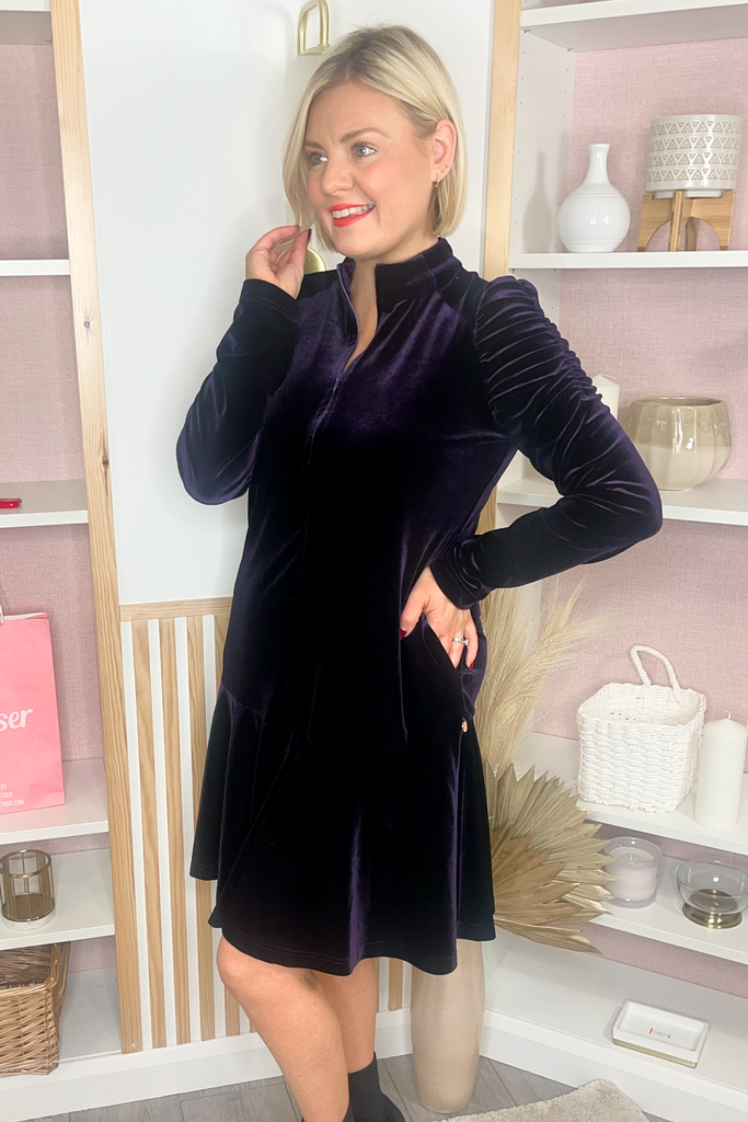 Knee-length velvet fit-and-flare style with statement sleeve. This style zips to the front
