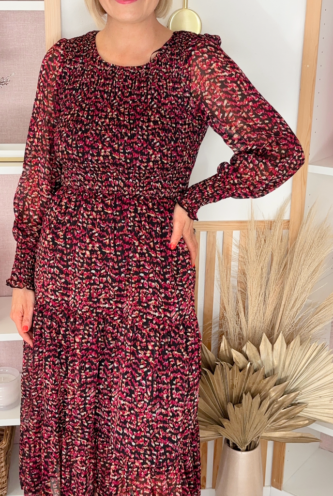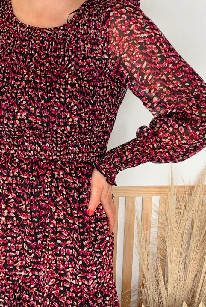 Chiffon style midi dress with ruched bodice and tiered skirt. The body is lined and the sleeve sheer, with deep ruched cuff