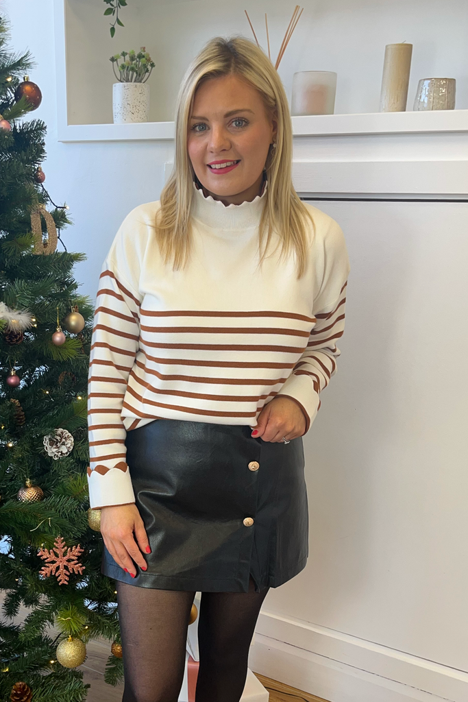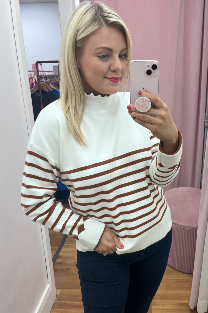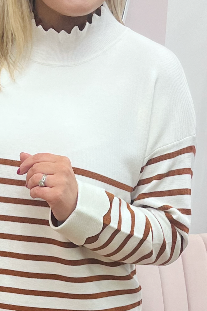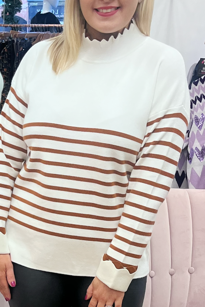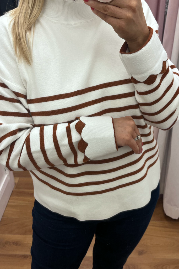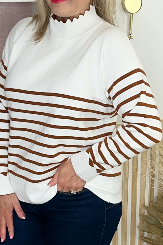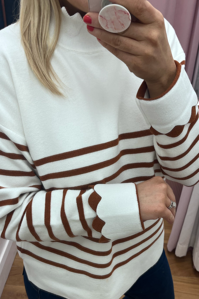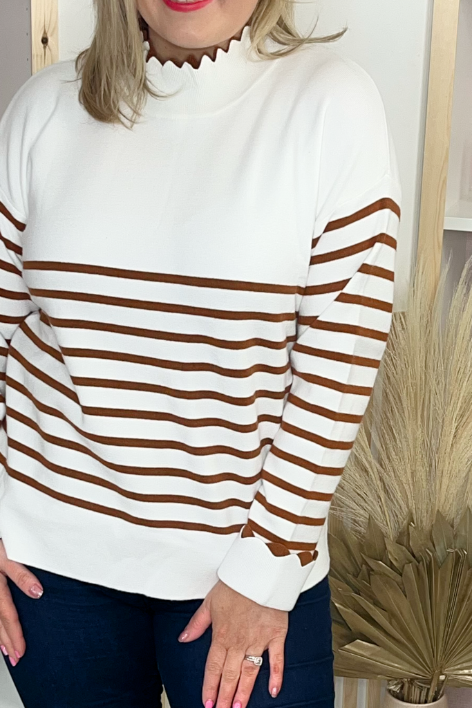 Super soft, quilted feel knit in Winter white with chocolate brown stripe. Features a raised scalloped neckline and turned back scalloped cuffs.