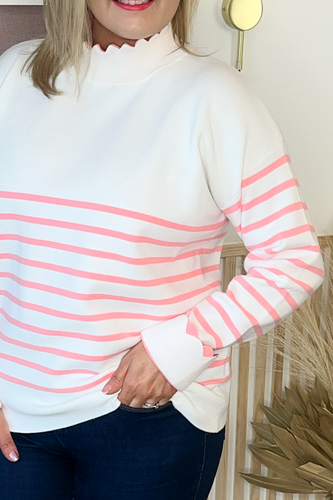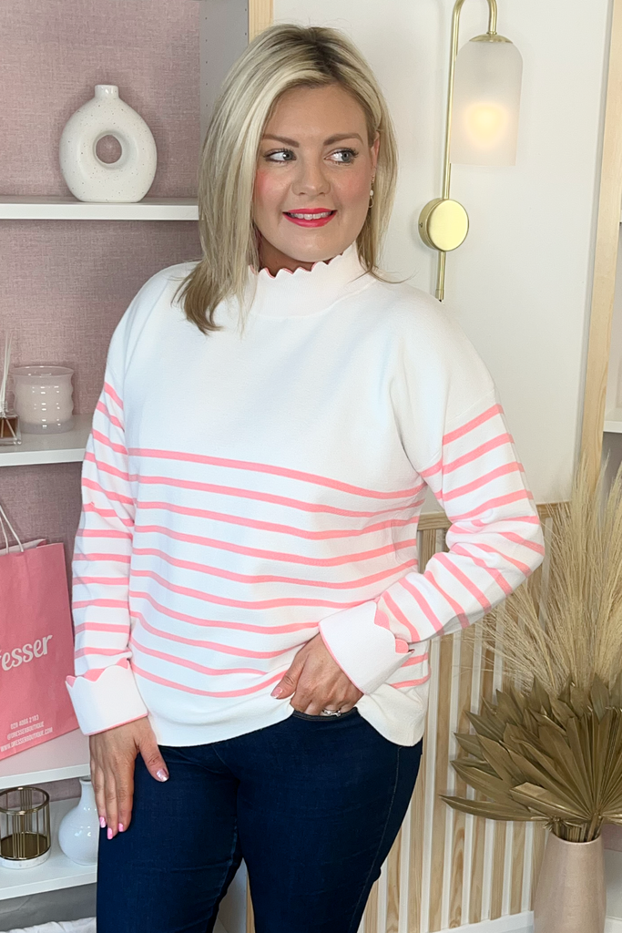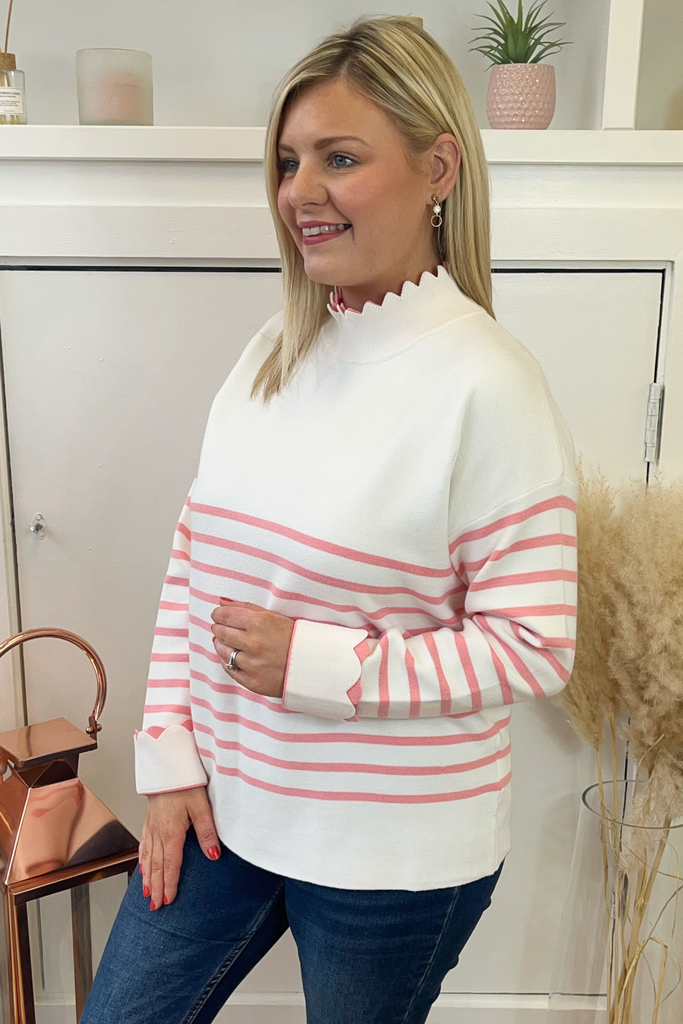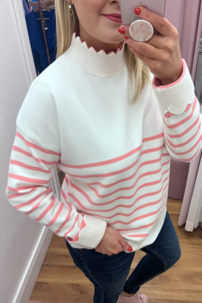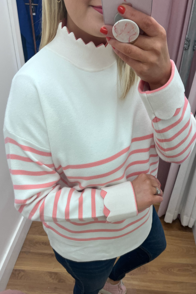 *BESTSELLER RESTOCKED*. Super soft, quilted feel knit in white with a soft pink stripe. Features a raised scalloped neckline and turned back scalloped cuffs.