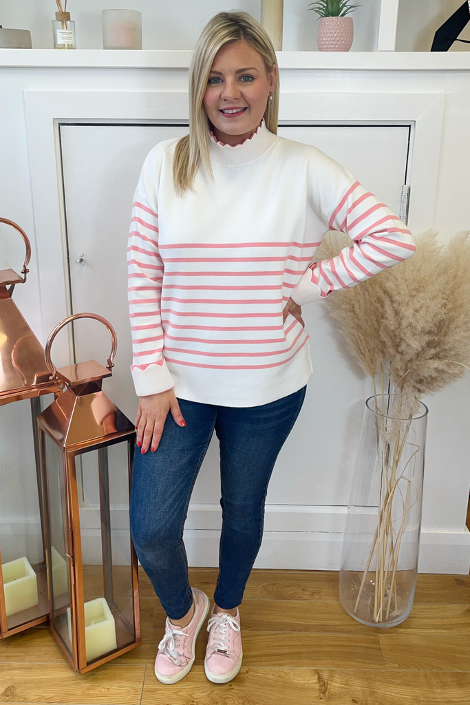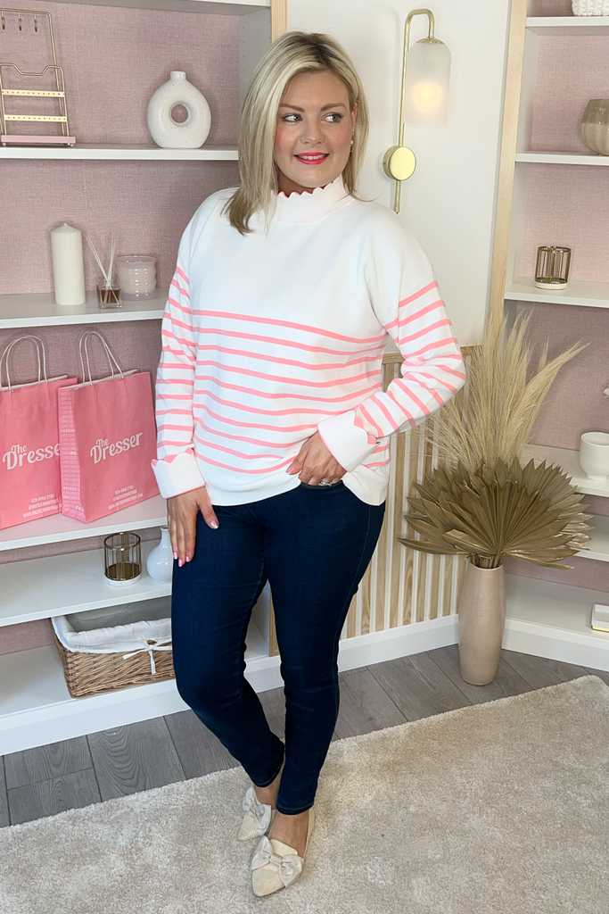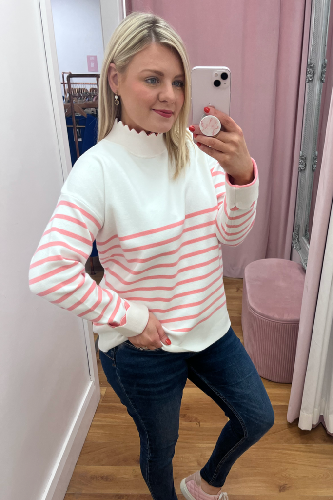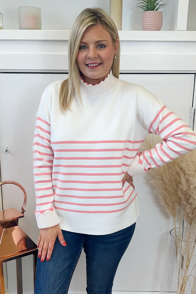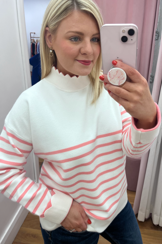 *BESTSELLER RESTOCKED*. Super soft, quilted feel knit in white with a soft pink stripe. Features a raised scalloped neckline and turned back scalloped cuffs.