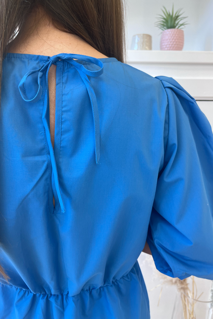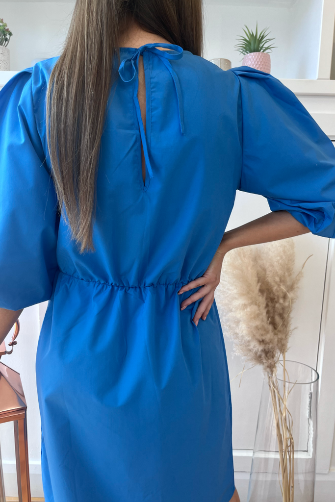 Vibrant blue tunic style dress with round neckline, dramatic half puff sleeves with elasticated cuffs and elasticated waist to give definition.