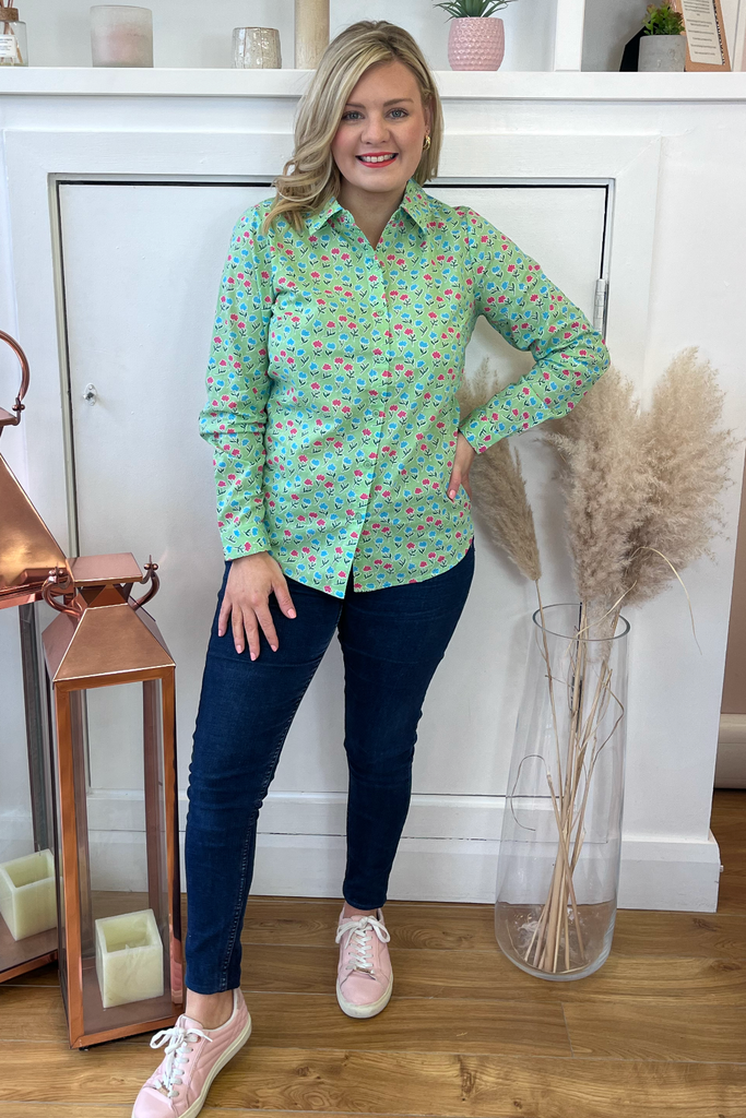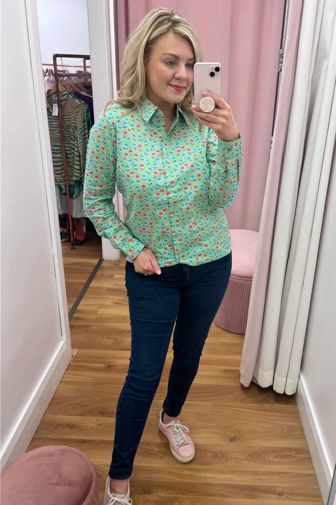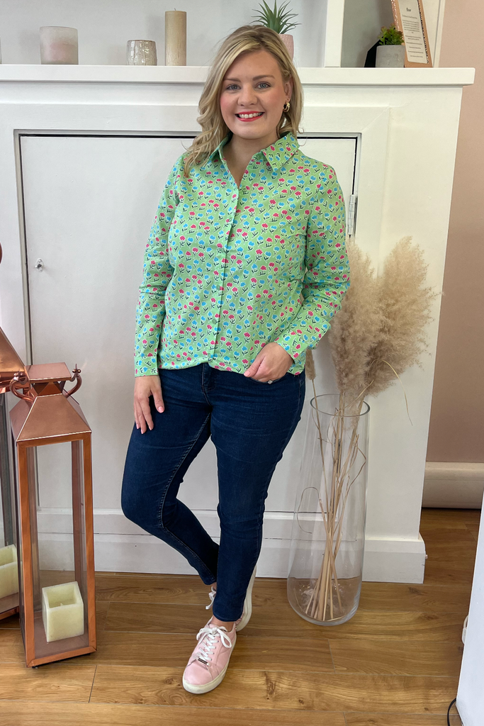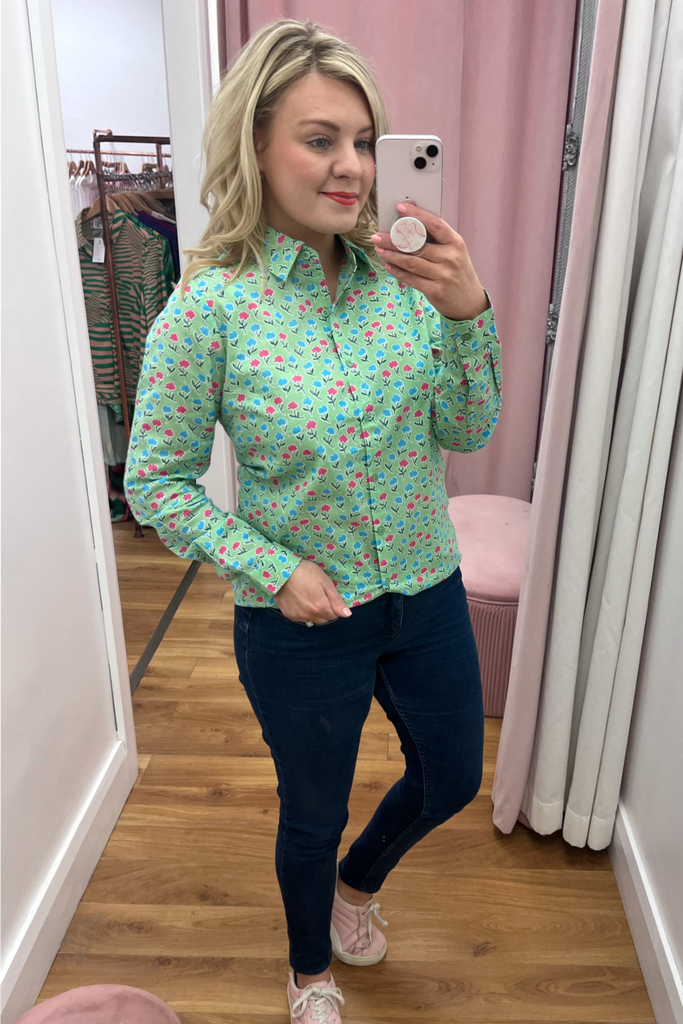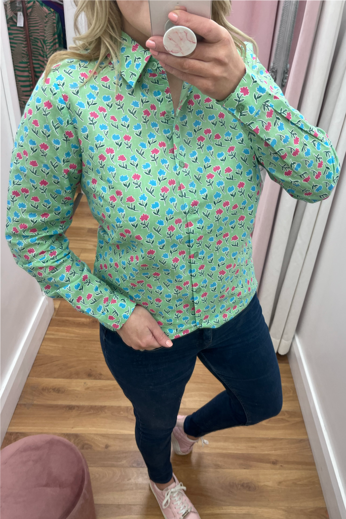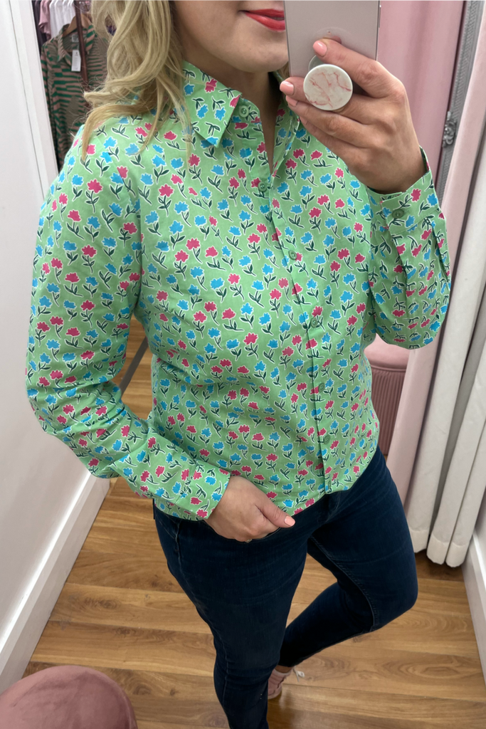 Soft green buttoned blouse with pink and blue floral print. Perfect for a pretty work wardrobe or perfectly paired with denims and a trainer, wedge or heel.