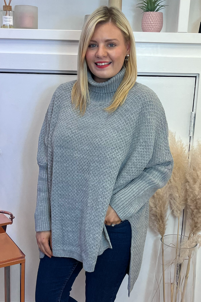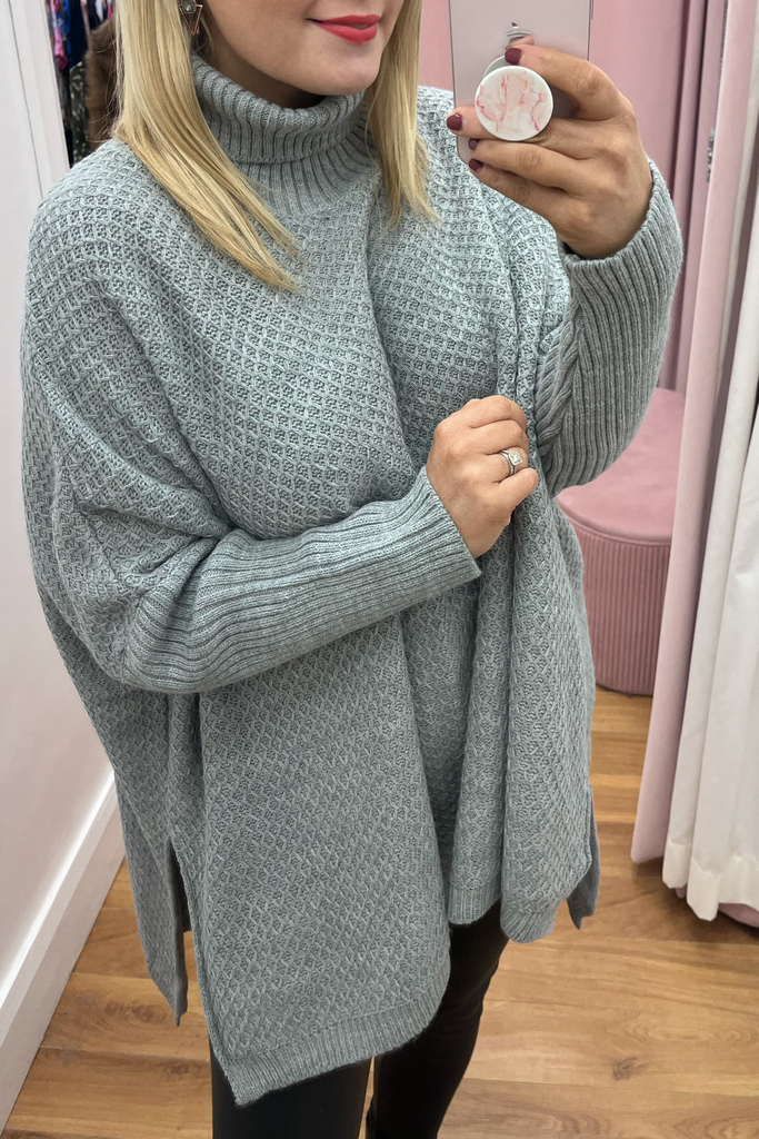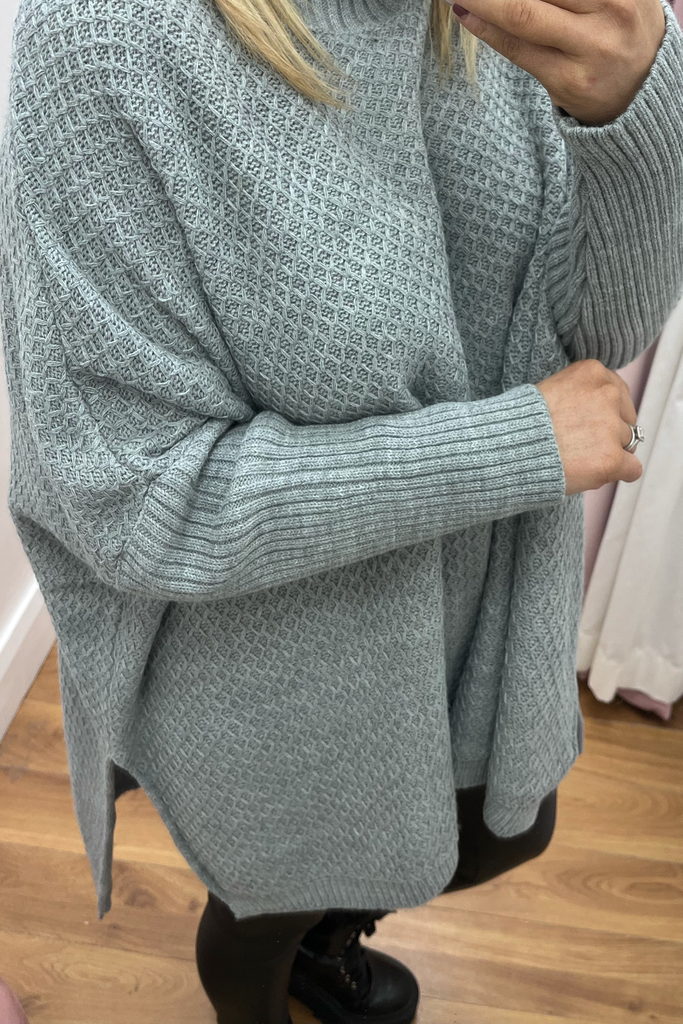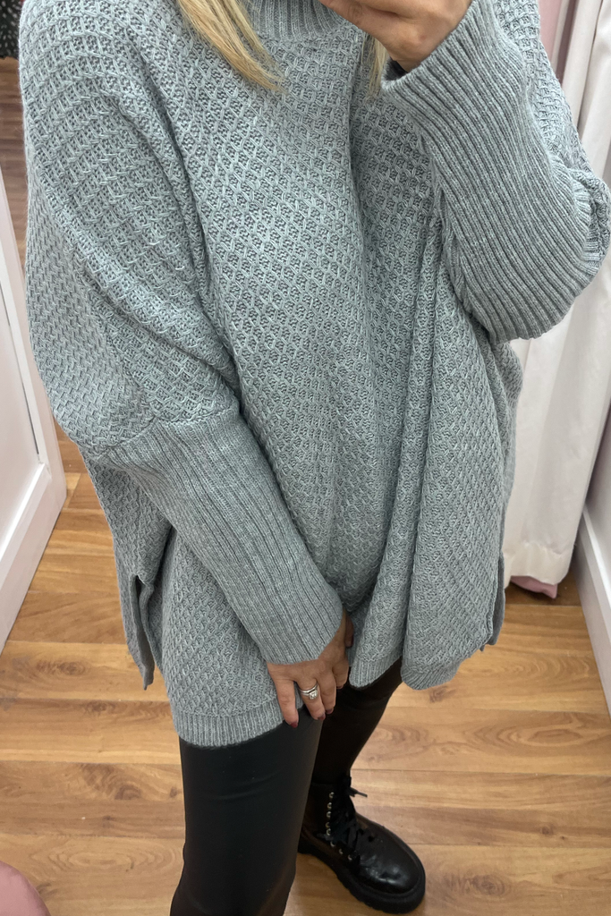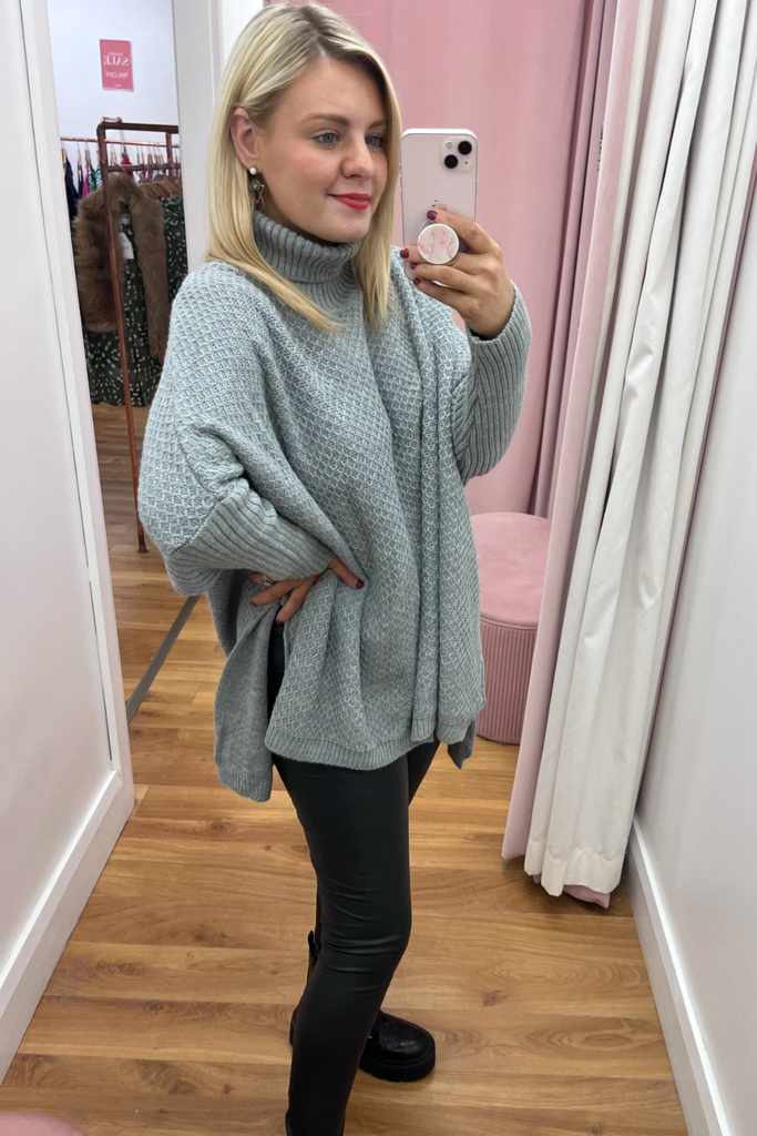 A super cosy luxurious feel poncho knit in a soft grey. It is the ultimate in stylish but comfortable layering! Featuring fitted sleeve, wide bodice, and slightly raised neckline.