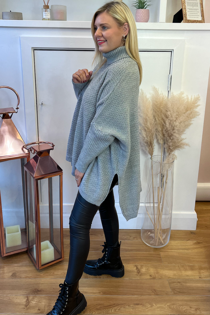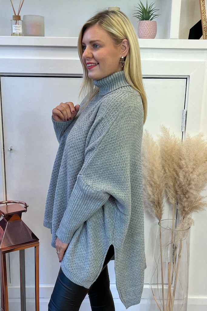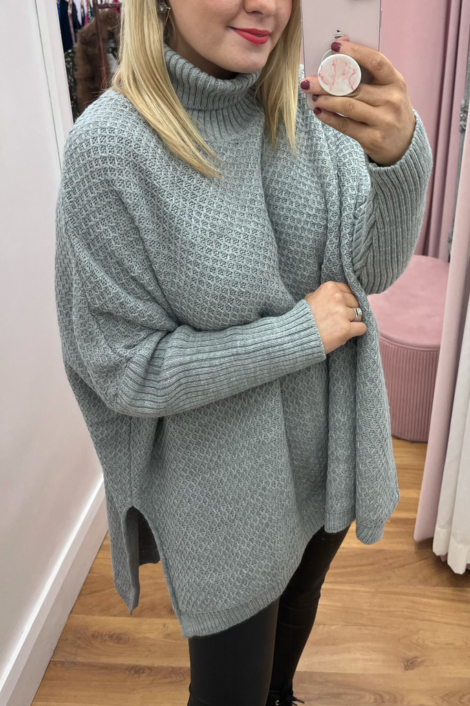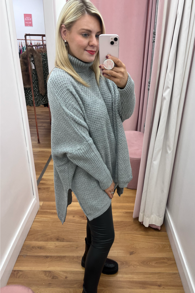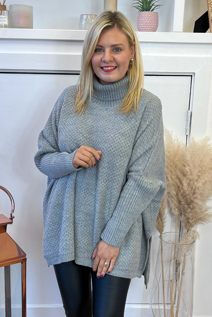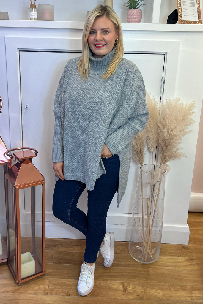 A super cosy luxurious feel poncho knit in a soft grey. It is the ultimate in stylish but comfortable layering! Featuring fitted sleeve, wide bodice, and slightly raised neckline.