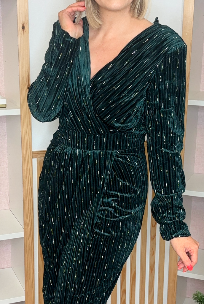False wrap-over style at the neckline and skirt, with fitted waist and zips to the back