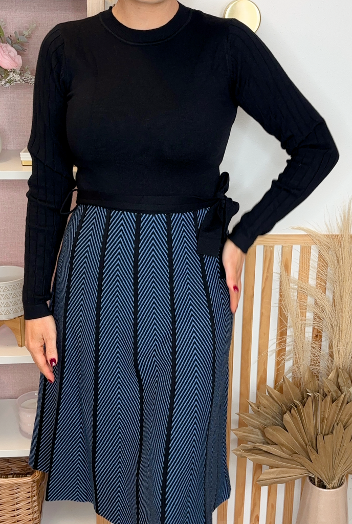 Thick knitted dress with a contrasting ribbed top and printed skirt, with tie belt
