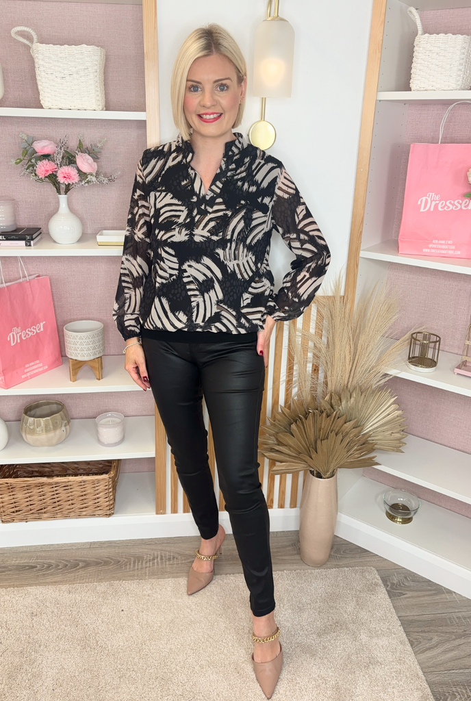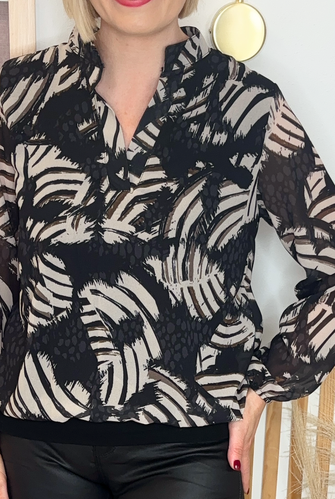 Chiffon blouse style top with V-neck and material banded bottom. With sheer sleeve and elasticated cuff. The body is lined.