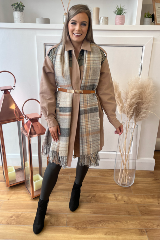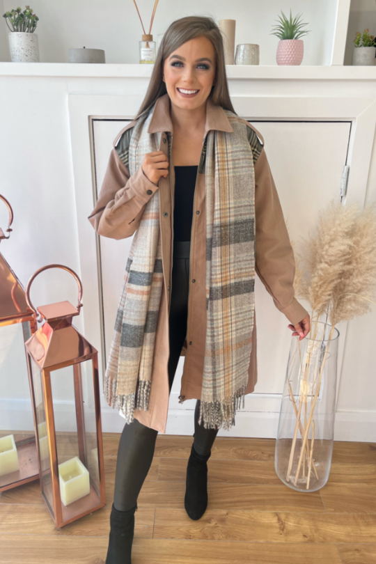Super soft, mid weight check print scarf in tan and grey tones with tassels. A blanket style scarf to keep you nice and cosy into the cooler months.