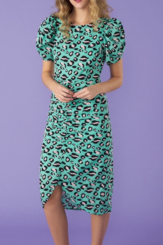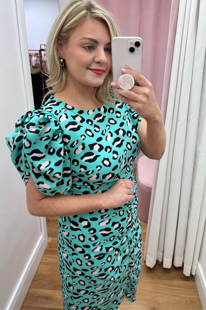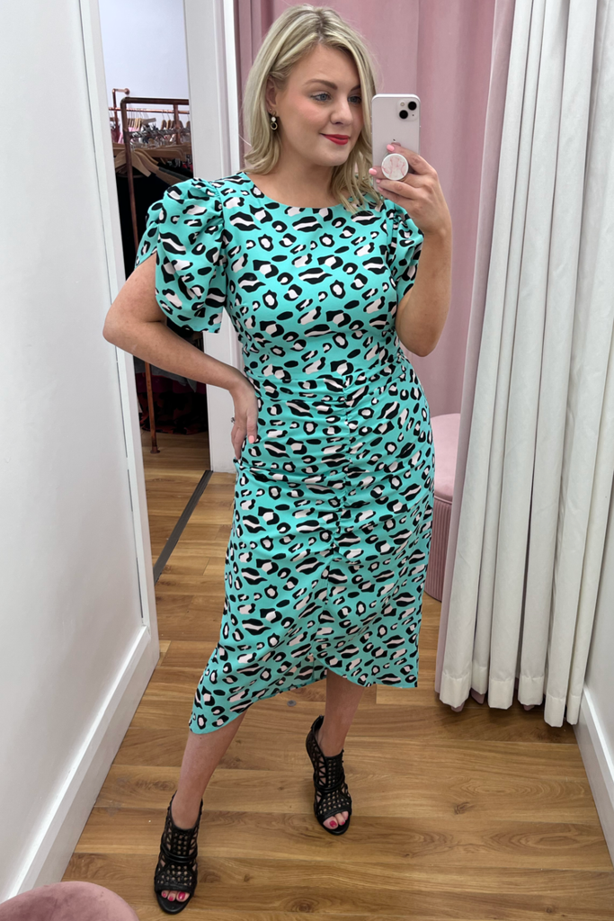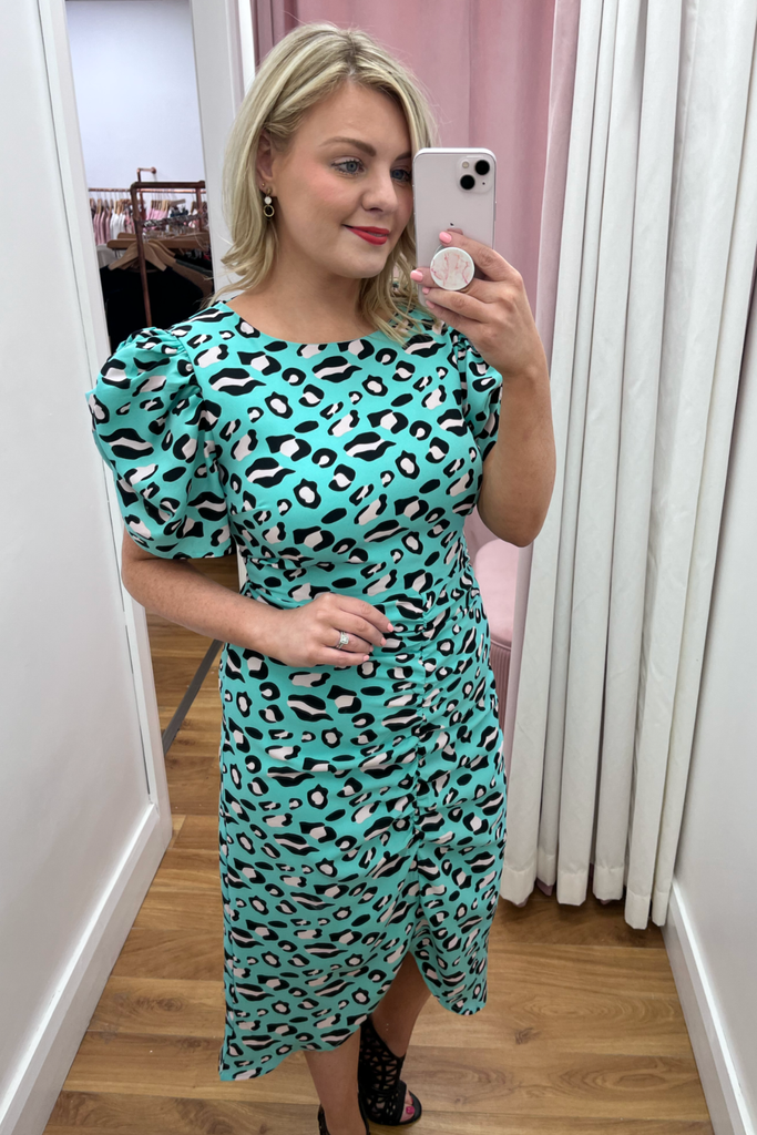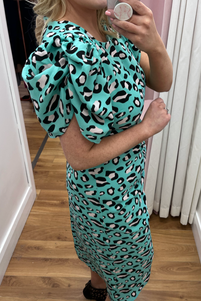 Pretty pastel mint dress with pink leopard print. Featuring round neckline, half puff sleeve and ruched side detail. With asymmetric hemline