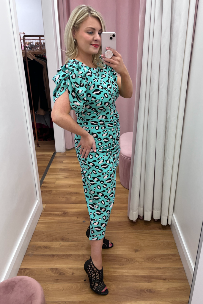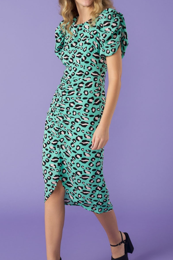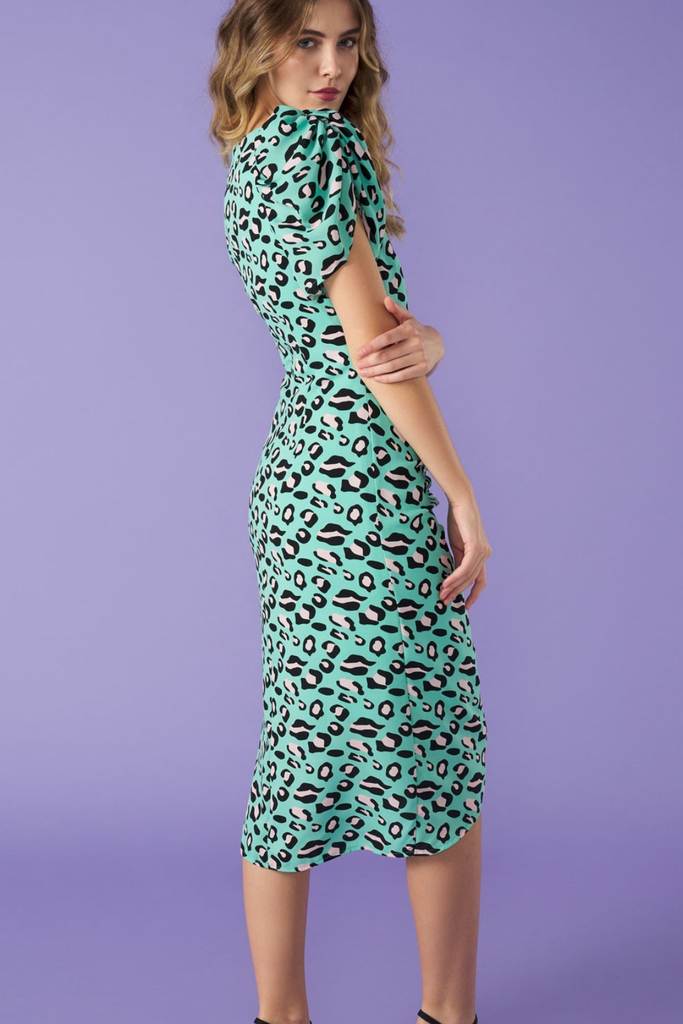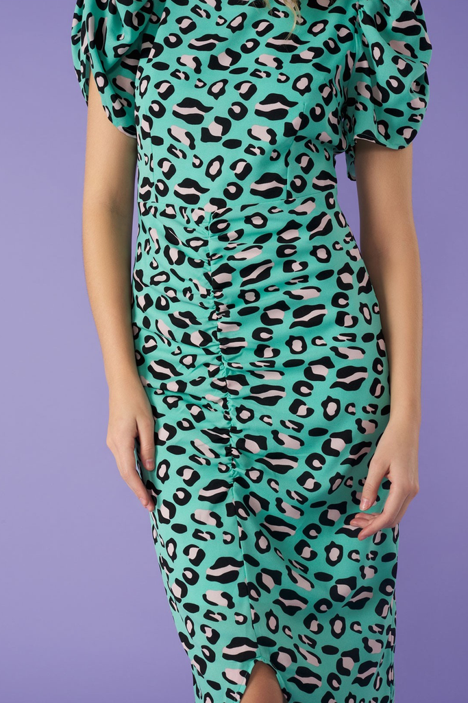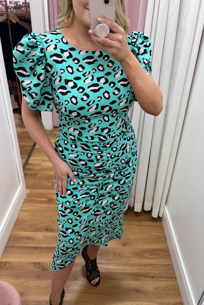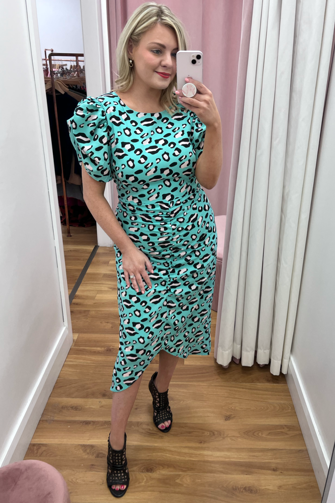 Pretty pastel mint dress with pink leopard print. Featuring round neckline, half puff sleeve and ruched side detail. With asymmetric hemline