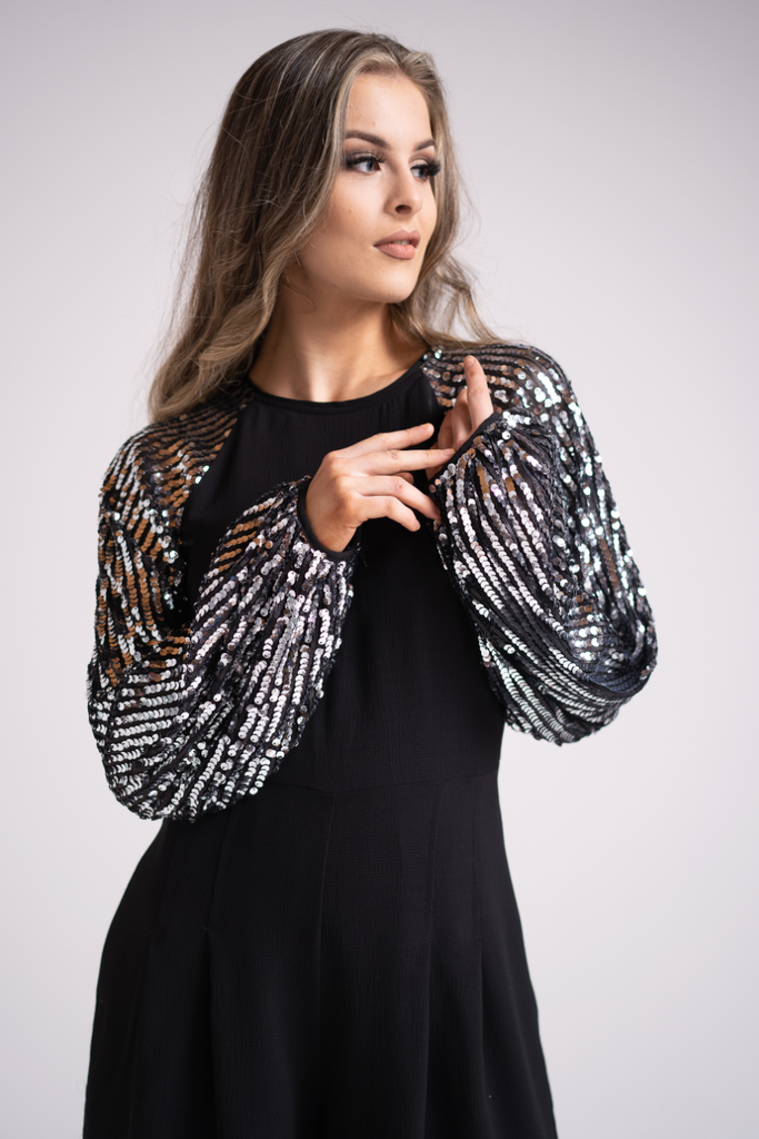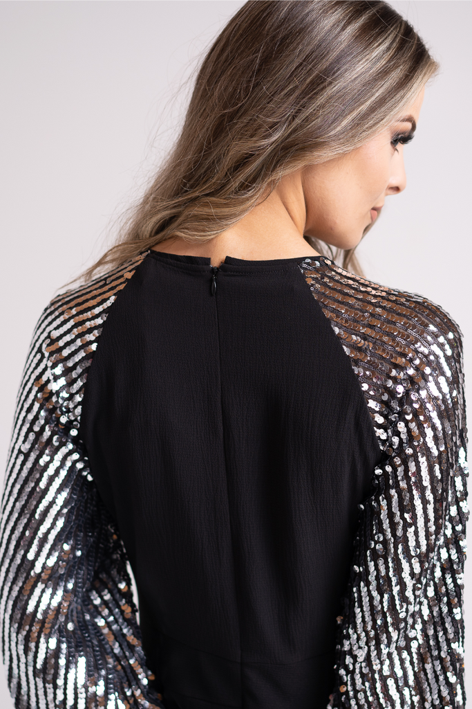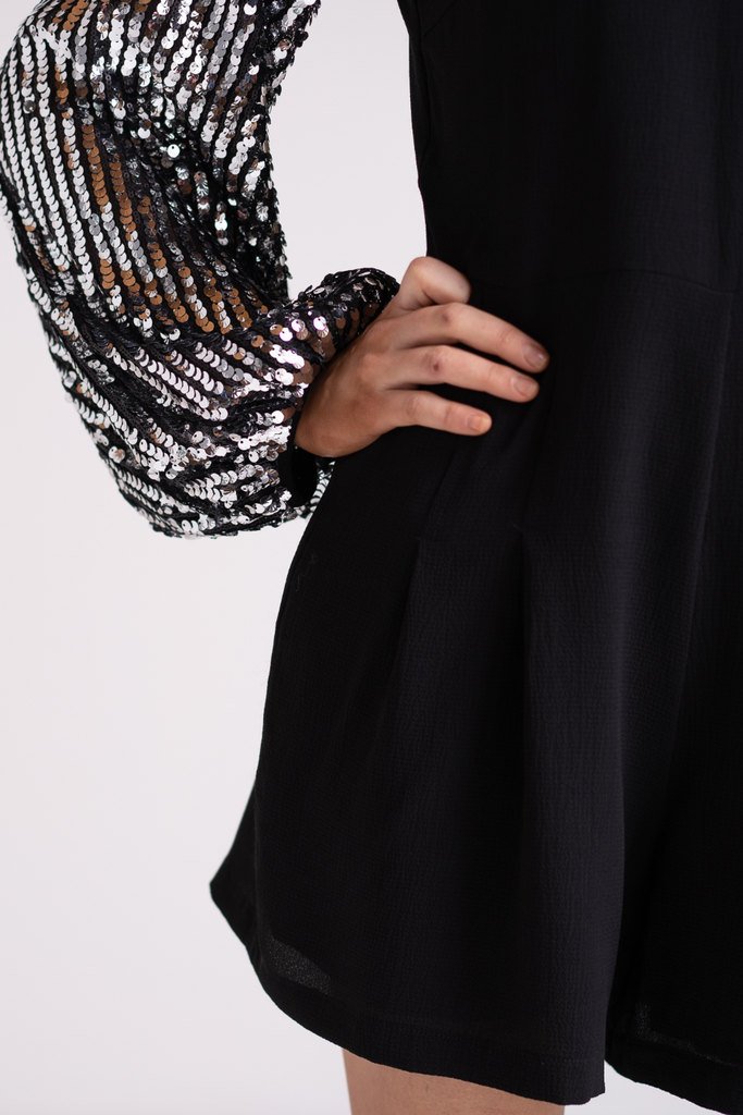 Swap your party dress for something more dramatic this season! This black playsuit features a fitted waist and floaty shorts complete with full length balloon sleeves adorned with silver sequins. it has a concealed back zip and flattering round neckline.