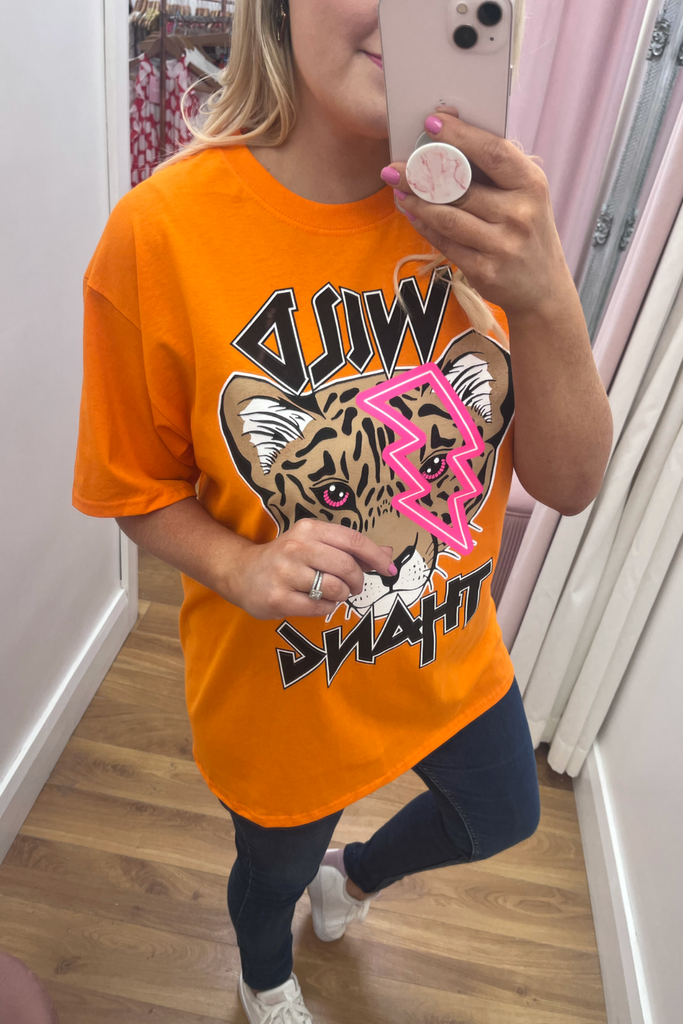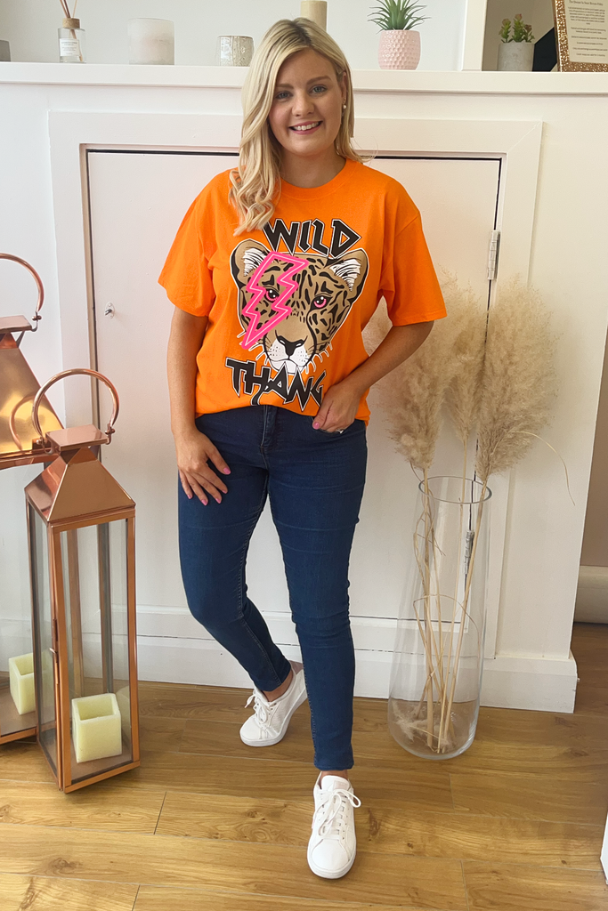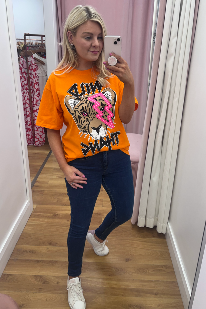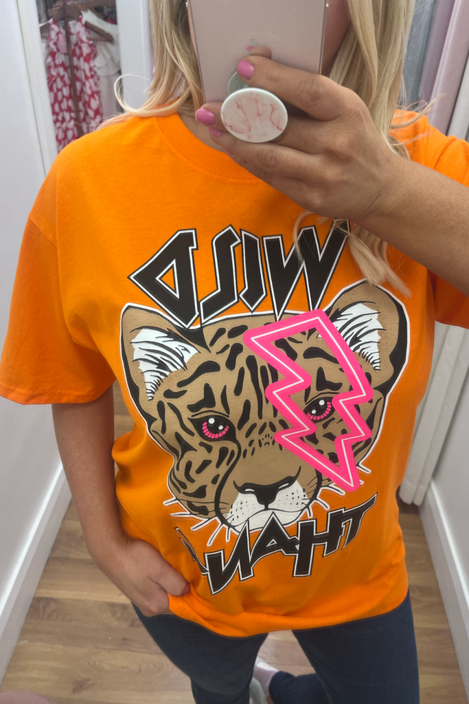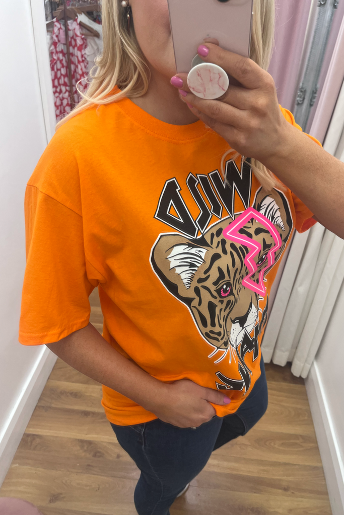 Vibrant tee with printed motif. Features round neckline, half sleeve and plain back.
