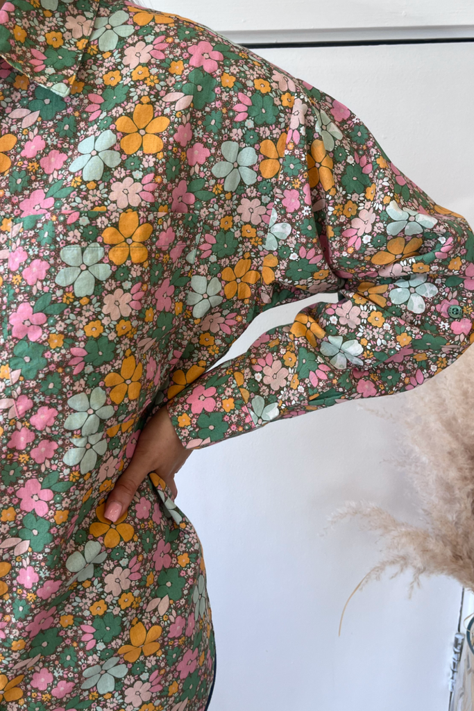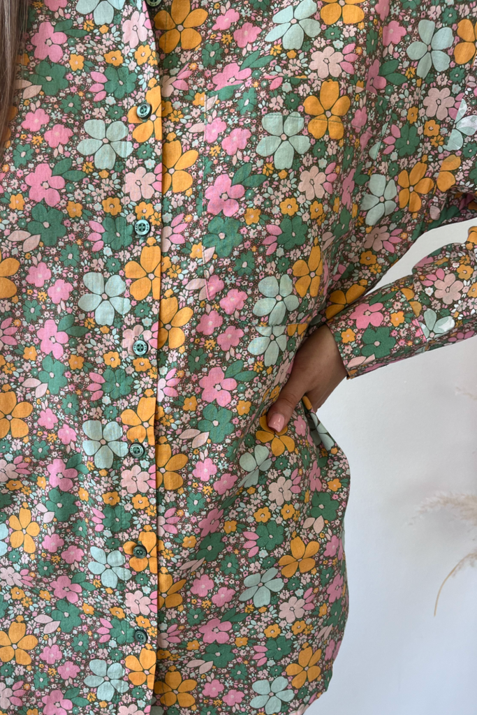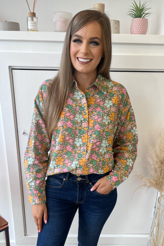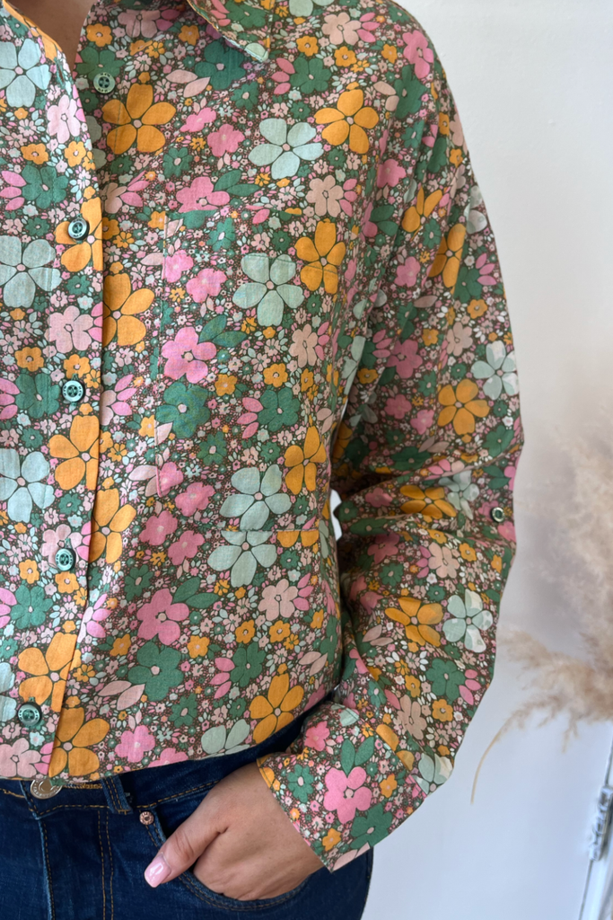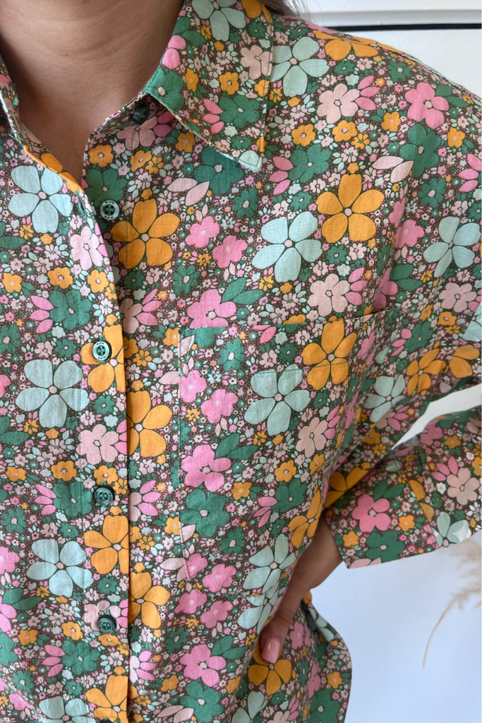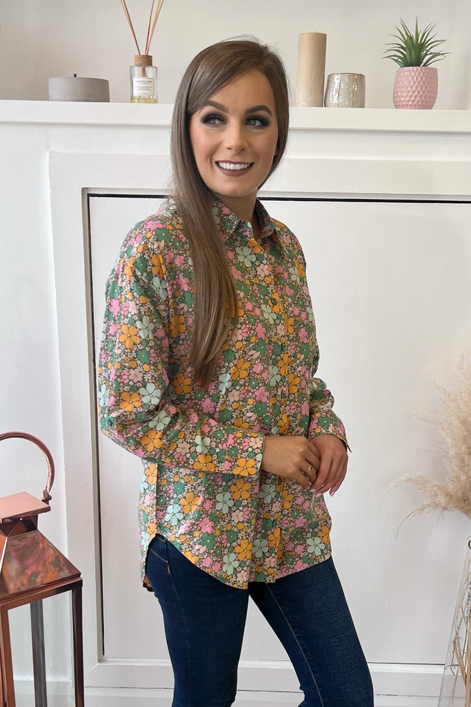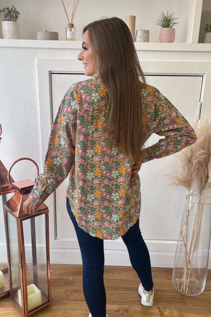 Vibrant green blouse with bold floral print in pink, blue and orange tones. Features collared neckline, full button down front and dipped hem at the back.