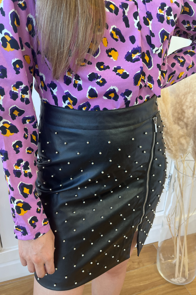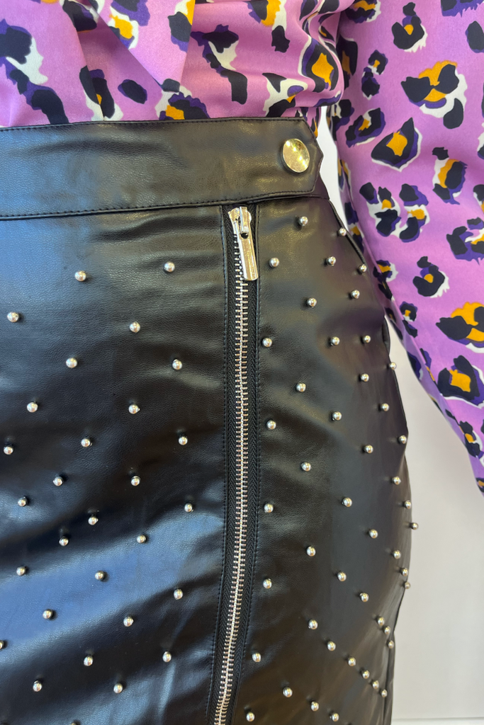Faux leather, shorter length skirt with a bit of drama. Features a studded front with plain back, front zip detail with small slit and snap fasten button on the waistband.