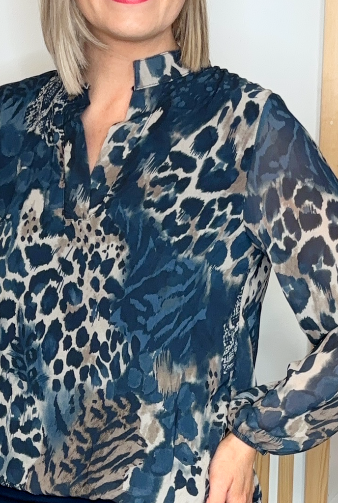 Chiffon blouse style top with V-neck and material banded bottom. With sheer sleeve and elasticated cuff. The body is lined.