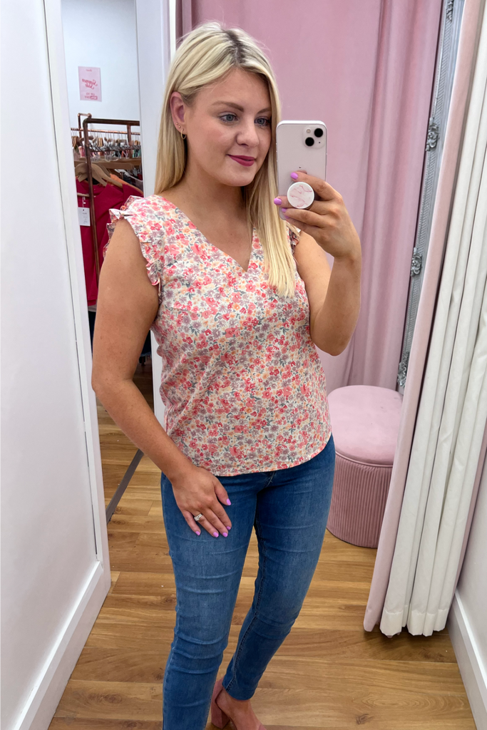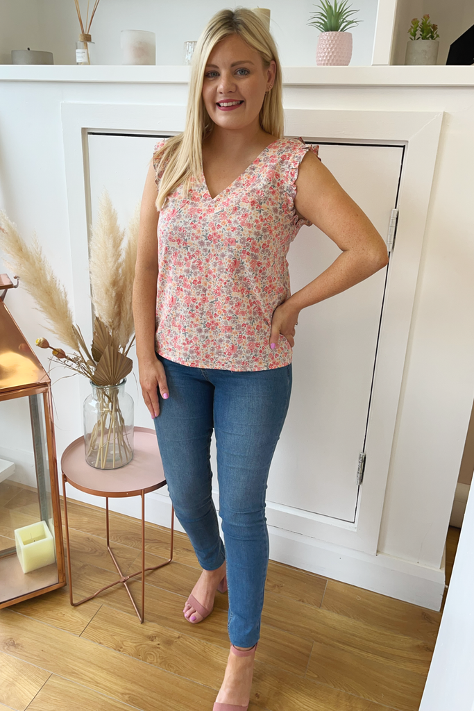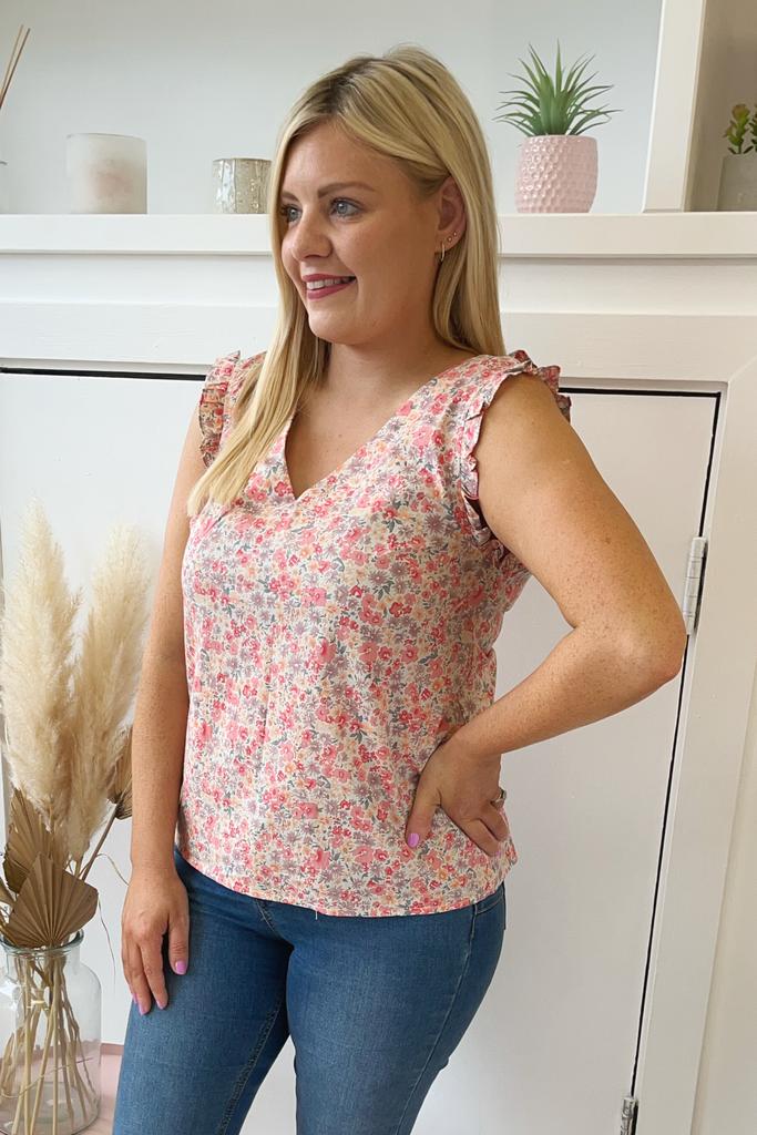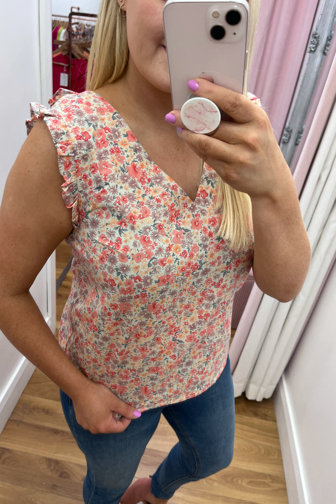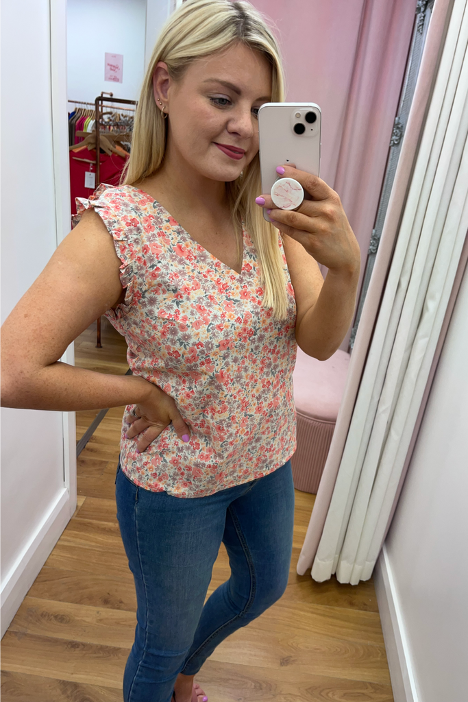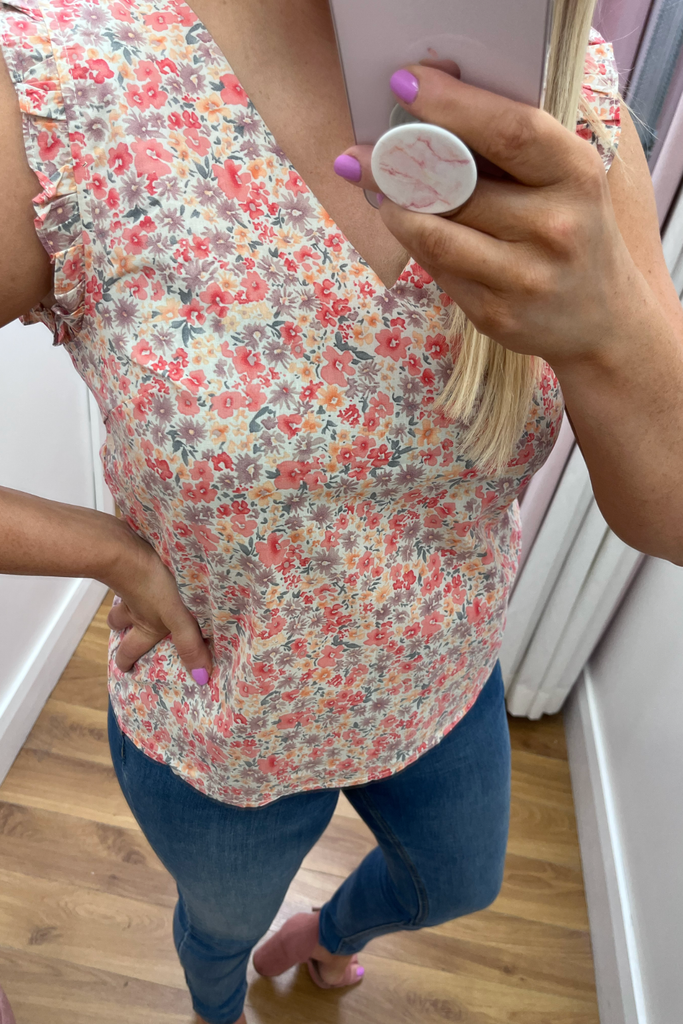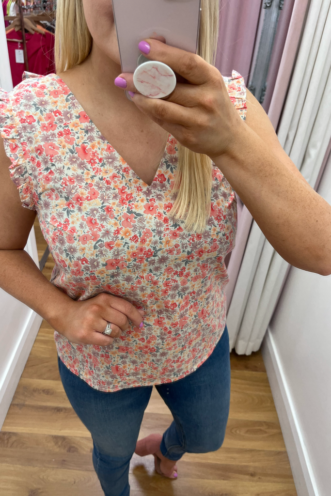 A simple but feminine floral top in neutral tones, peach and coral. Features a V-neckline, sleeveless design with subtle ruffle and tie closure at the back. Pair with denims or shorts for a fresh look this summer!