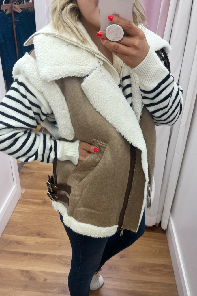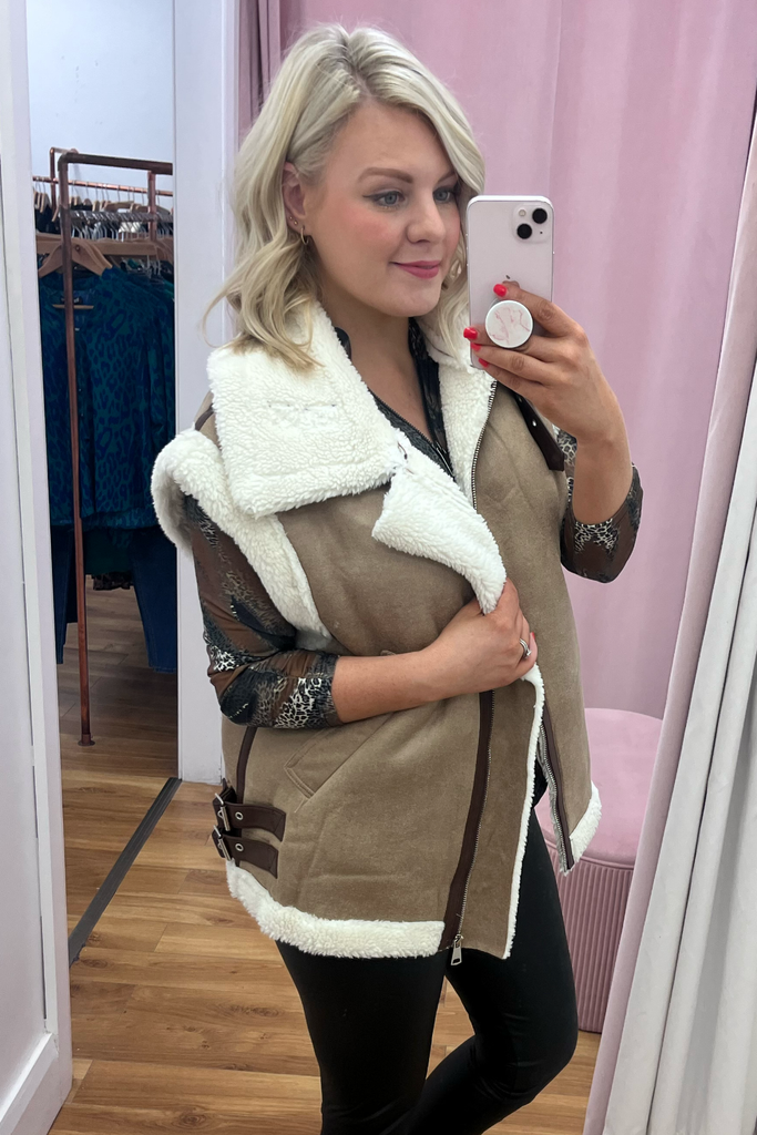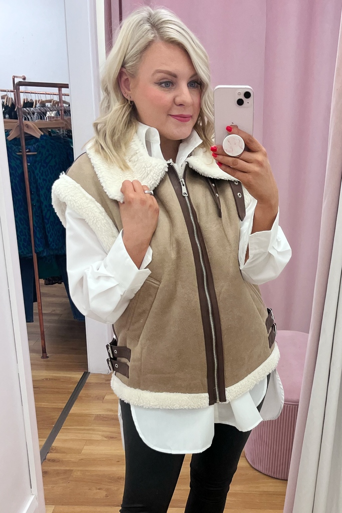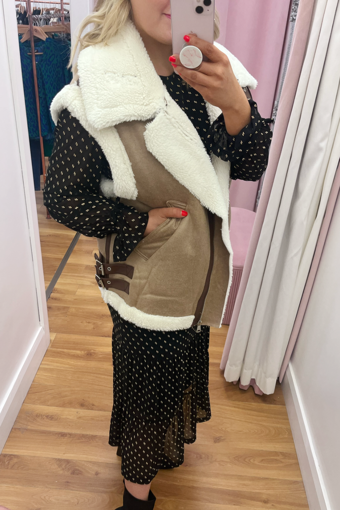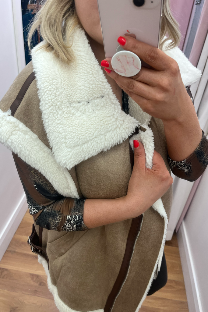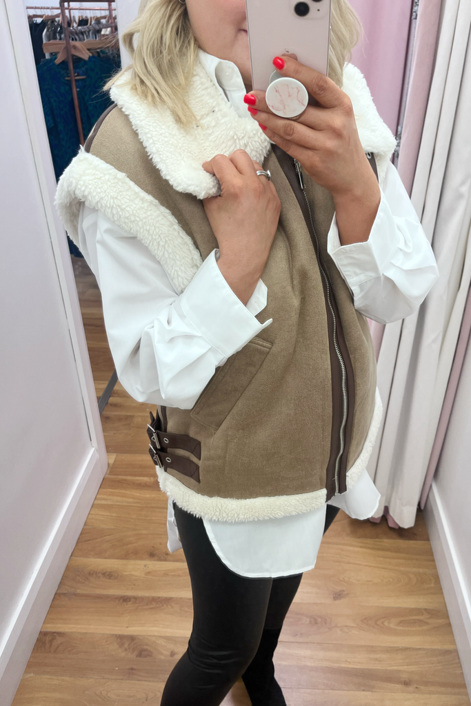 Faux suede shearling gilet with buckle detail. Features oversized fleeced collar and pockets. Closes with a zip to the front.