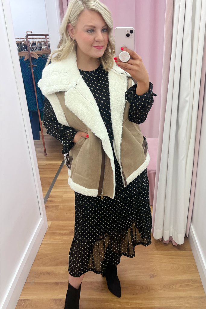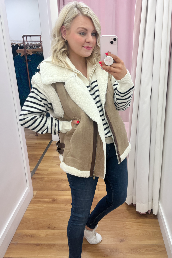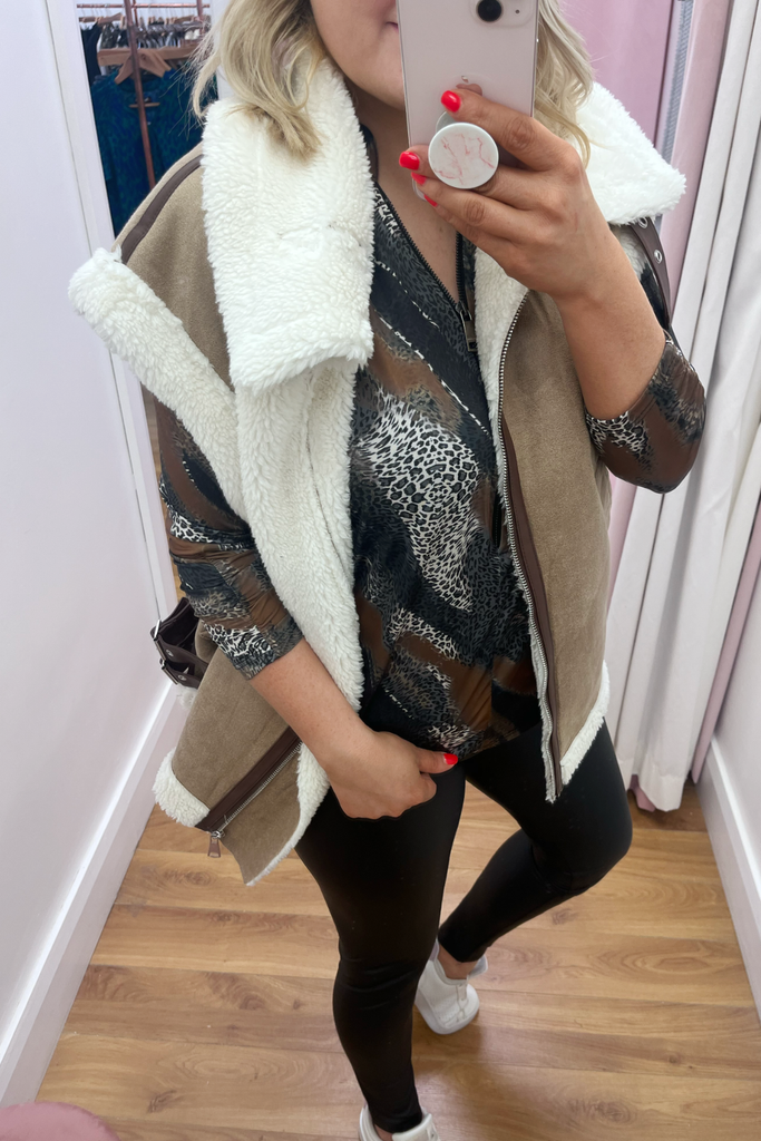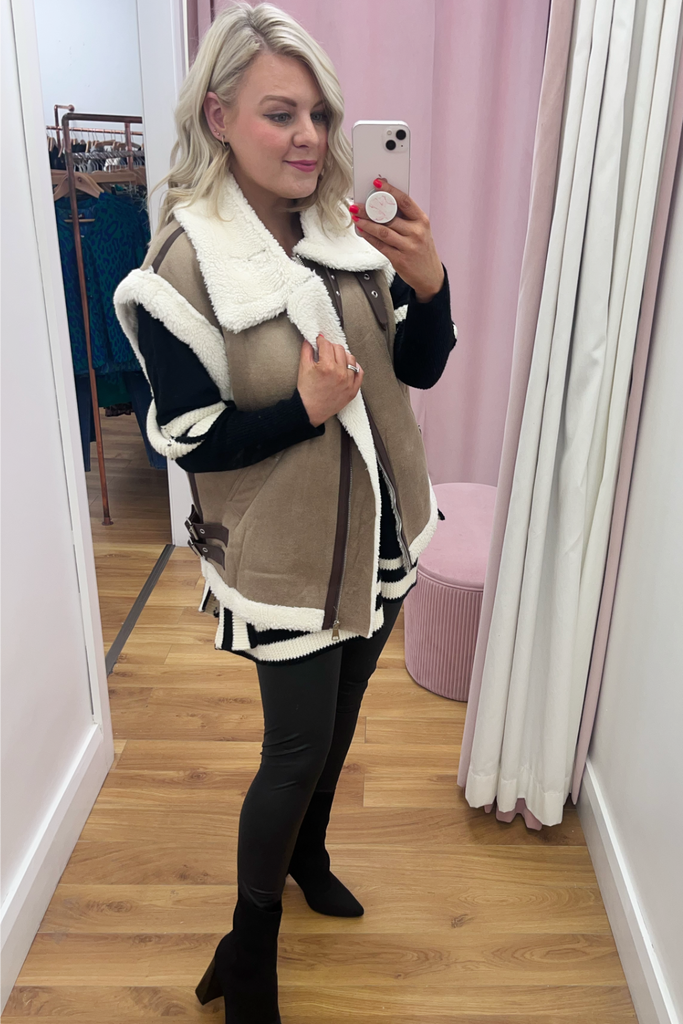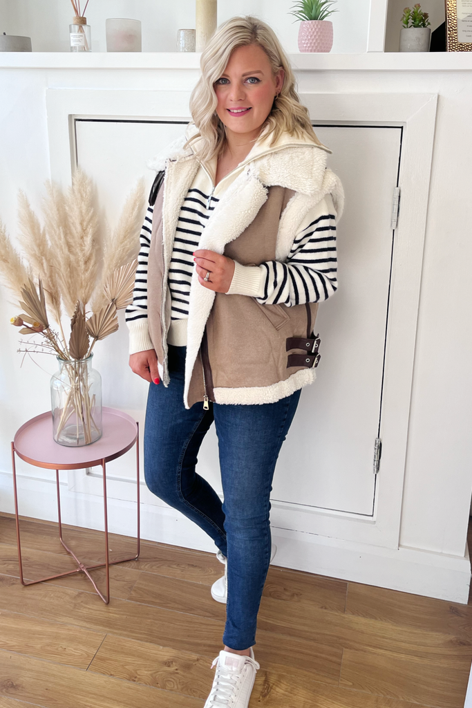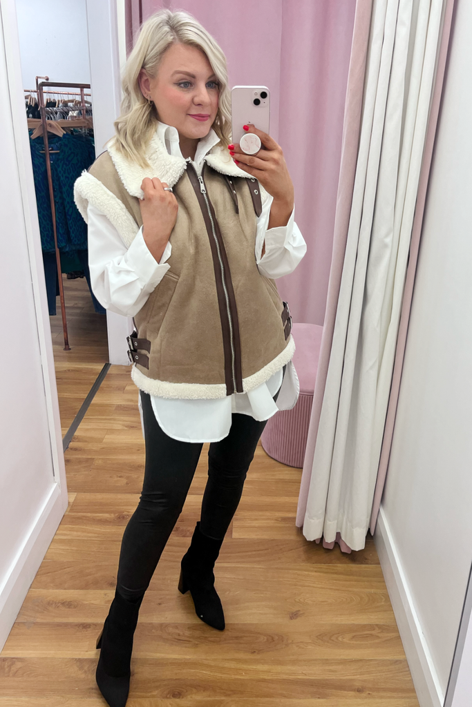 Faux suede shearling gilet with buckle detail. Features oversized fleeced collar and pockets. Closes with a zip to the front.