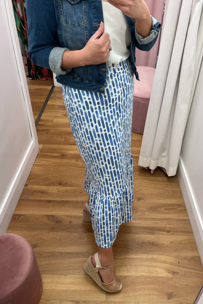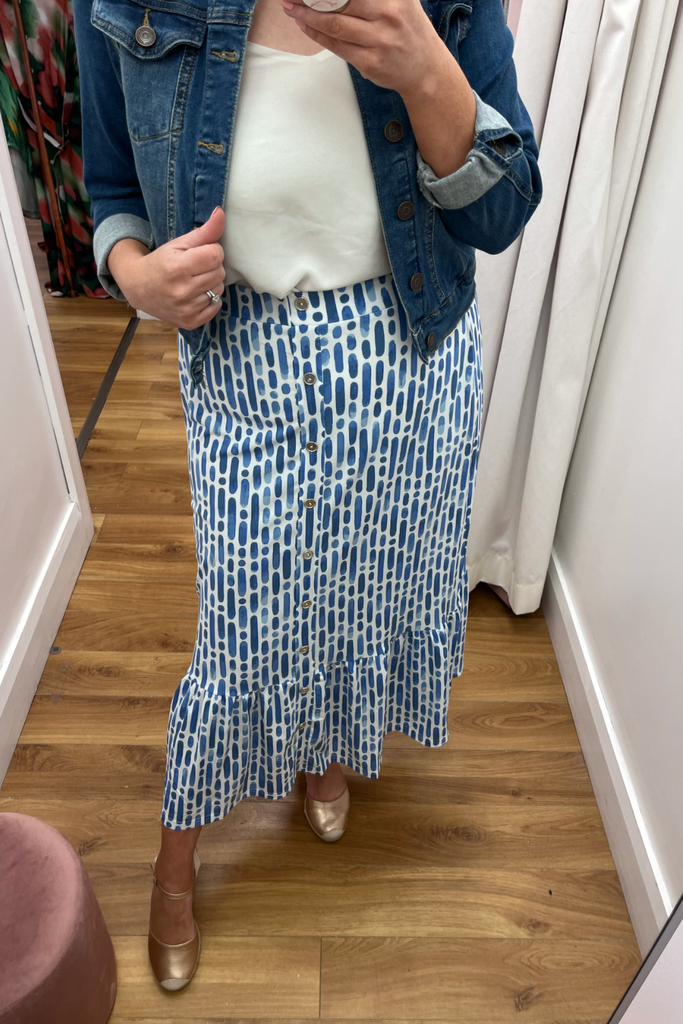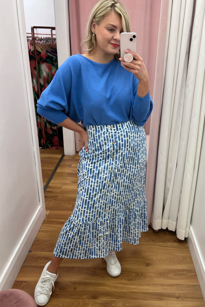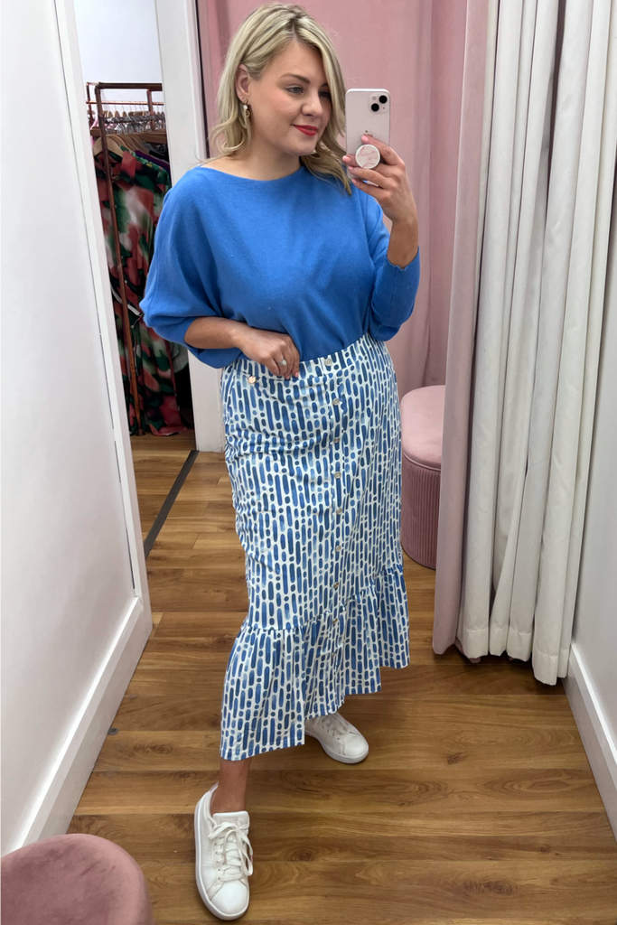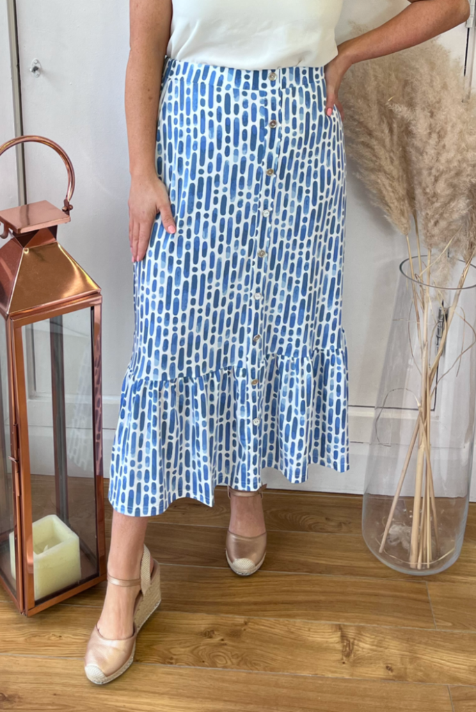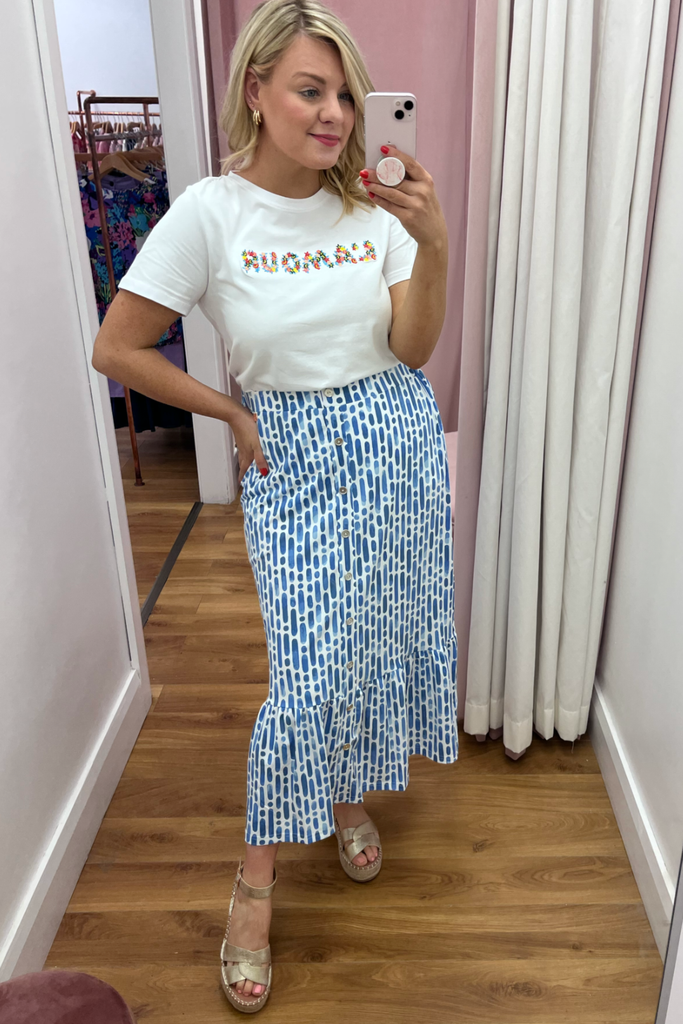 A light-weight midi skirt with a pretty blue and white abstract print, button detail and dropped hem. It’s designed in a high-waisted slip silhouette, fitted with a hidden elasticated waistband for a comfortable fit. Pair with a blouse, tee or