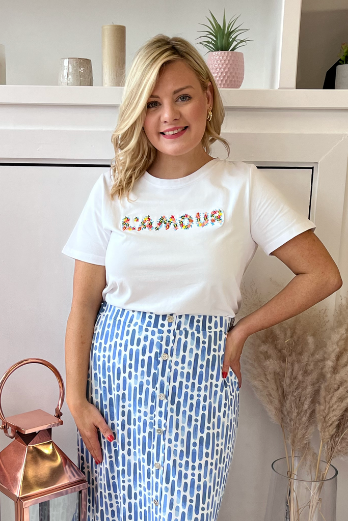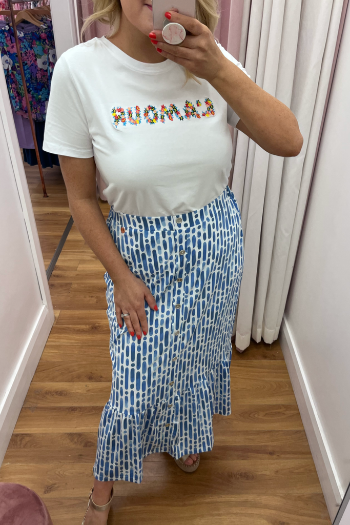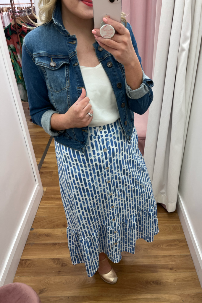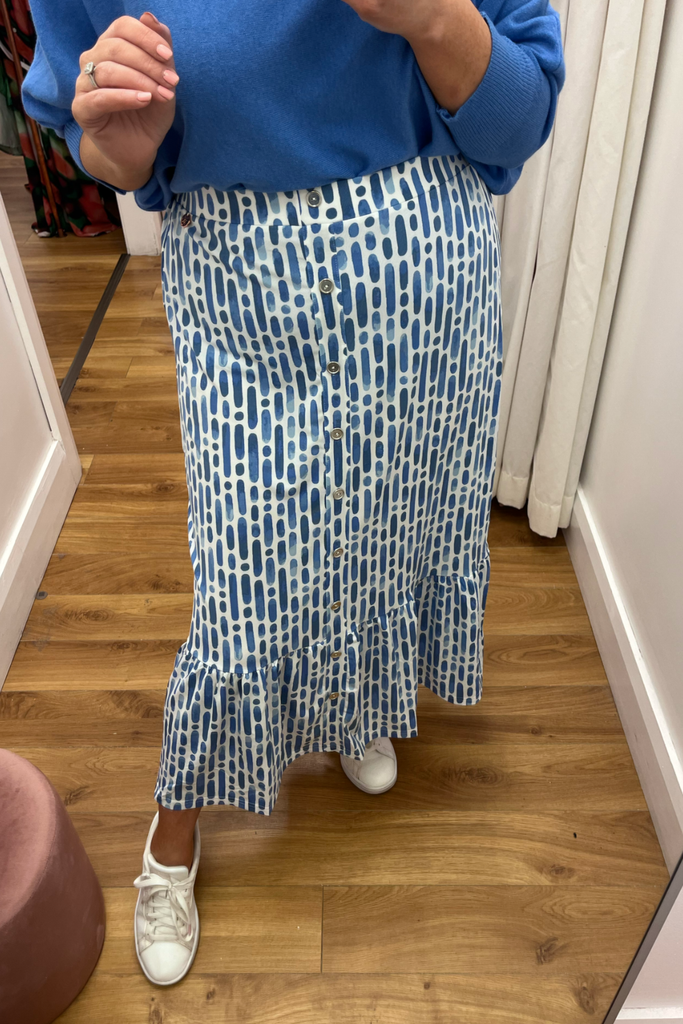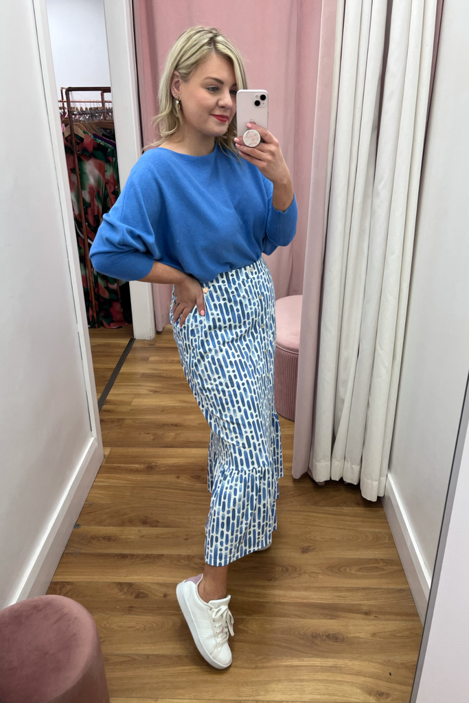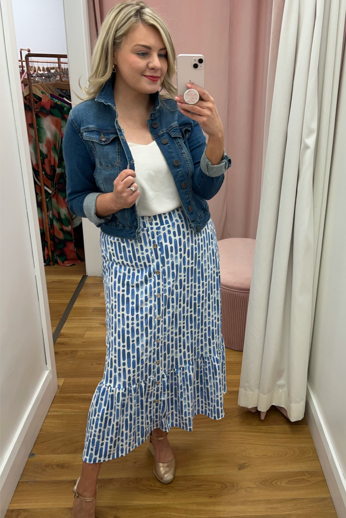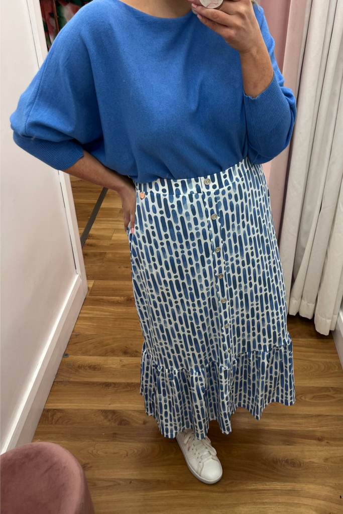 A light-weight midi skirt with a pretty blue and white abstract print, button detail and dropped hem. It’s designed in a high-waisted slip silhouette, fitted with a hidden elasticated waistband for a comfortable fit. Pair with a blouse, tee or