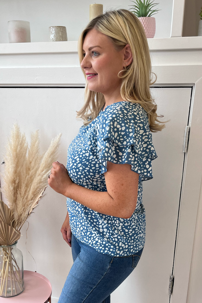Blue leopard print top with a double ruffle sleeve. The material is soft and lightweight with a relaxed fit and great length