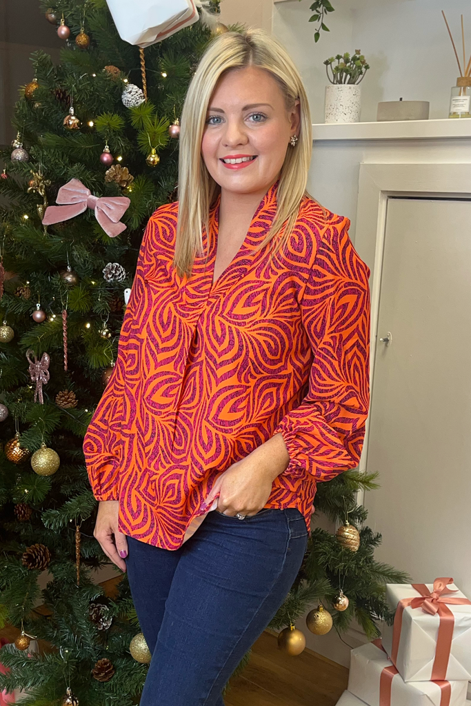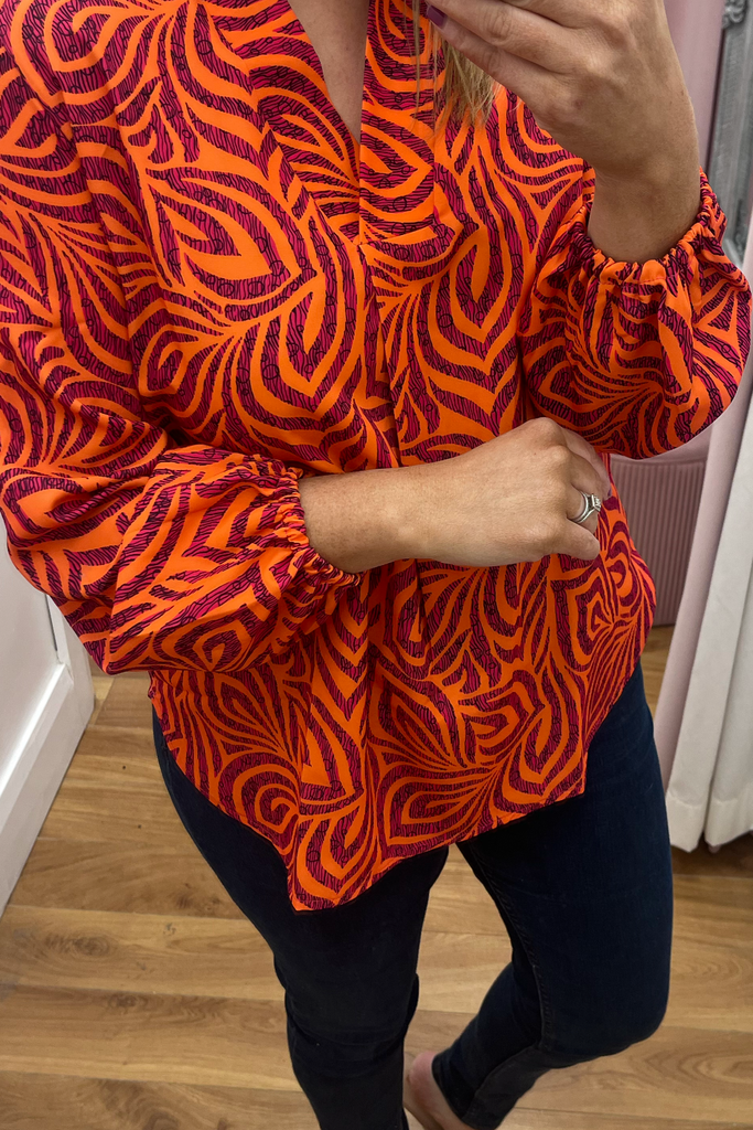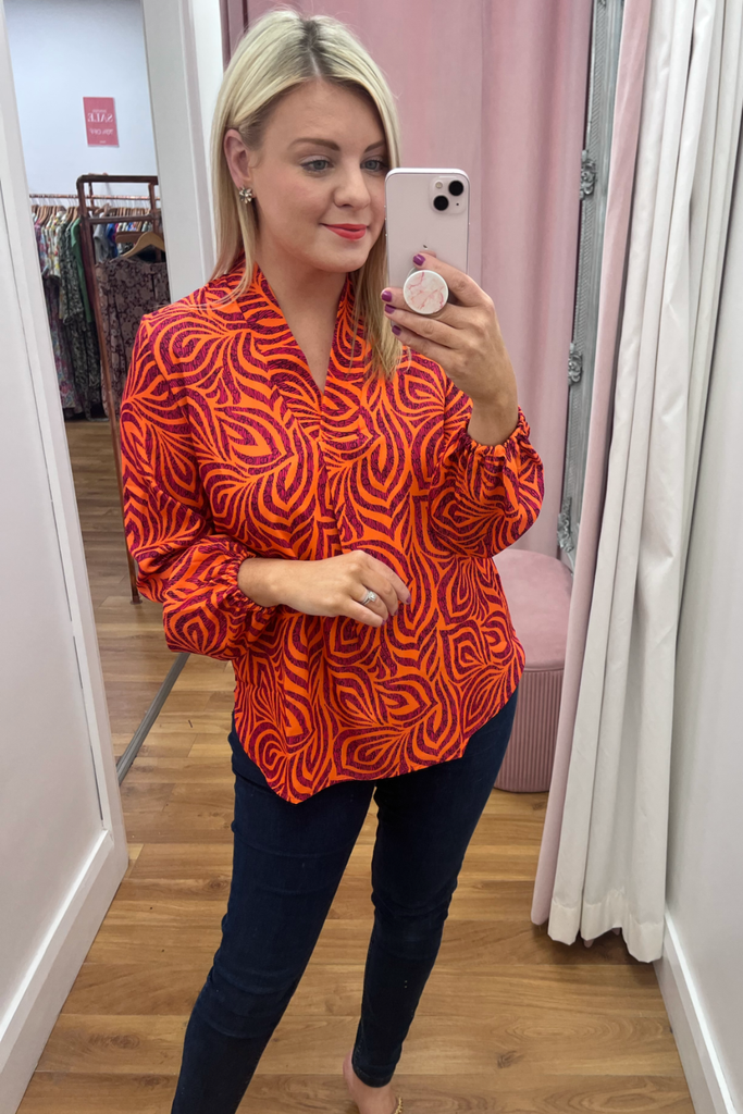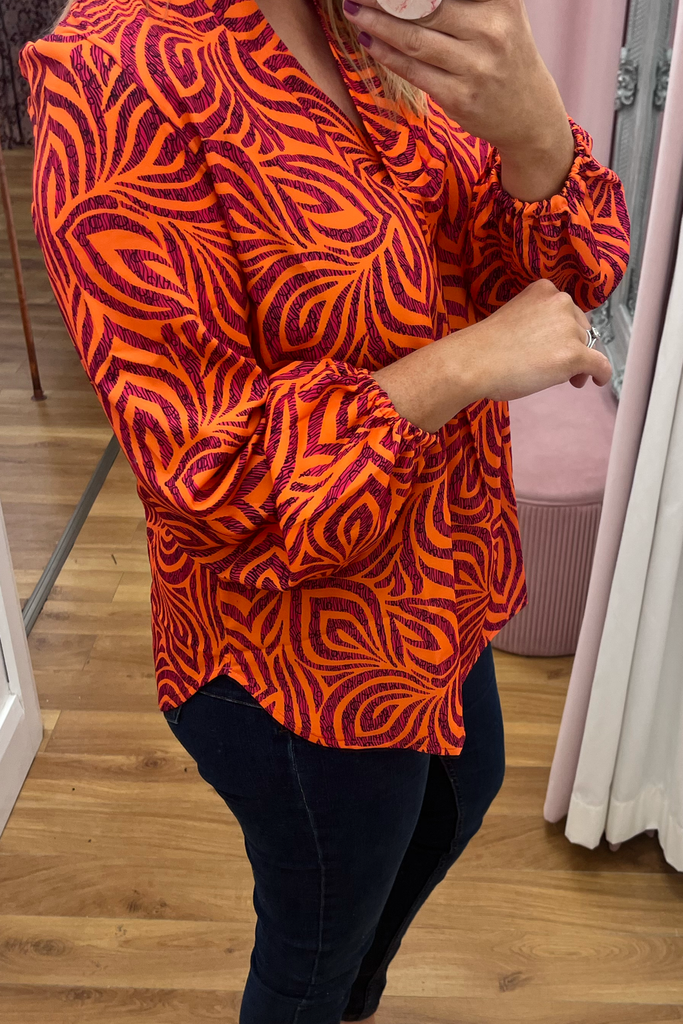 Stunning orange blouse with contrasting abstract print throughout. Features a V-neckline, full length sleeves with elasticated cuff and relaxed bodice.