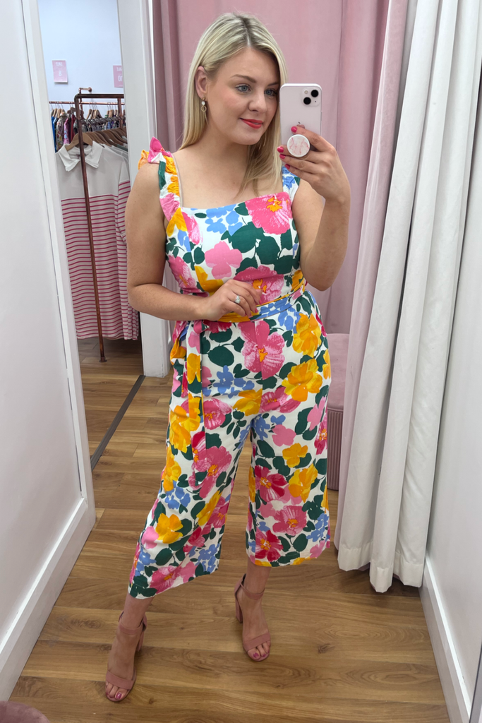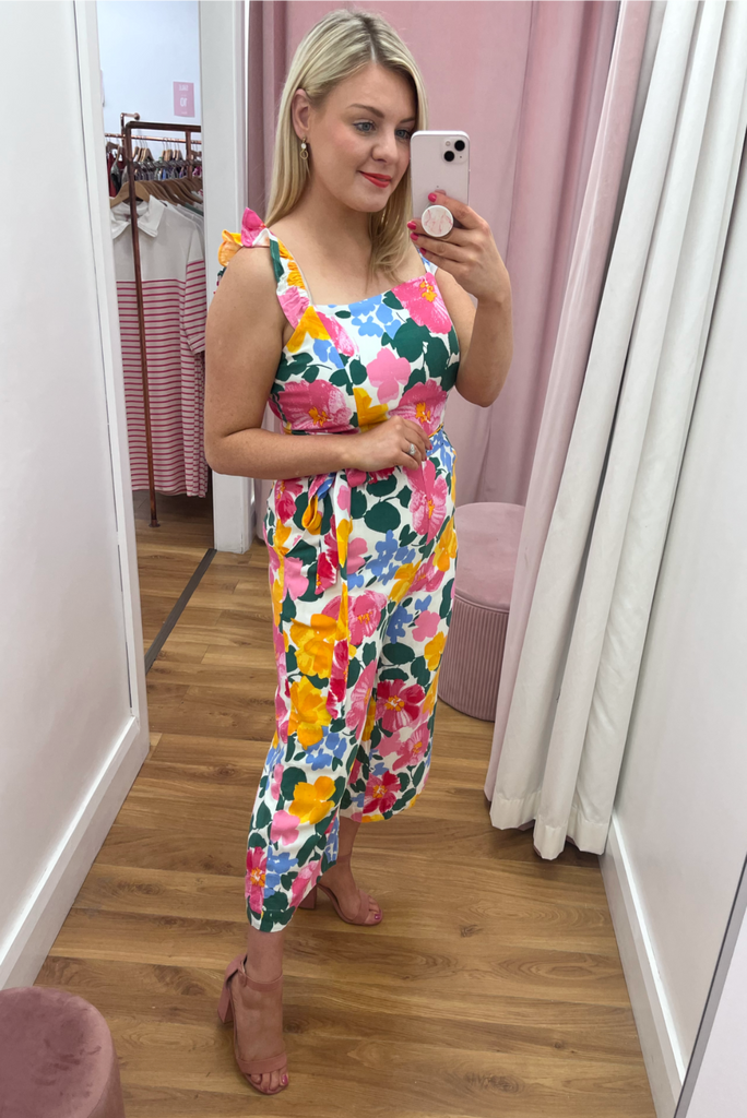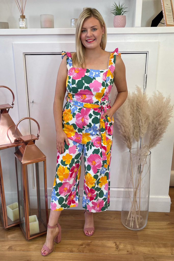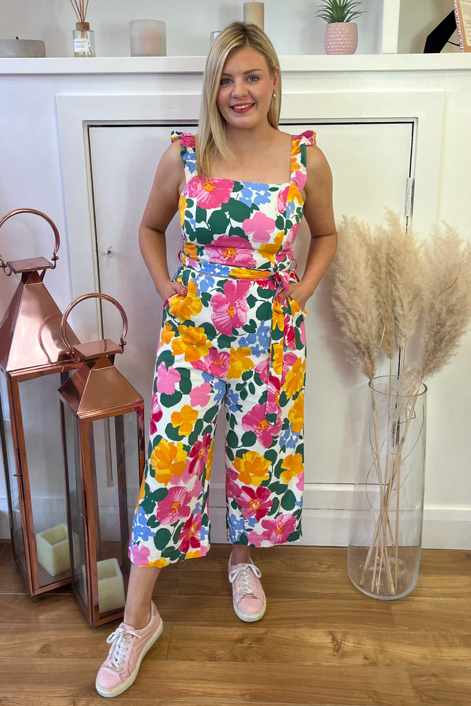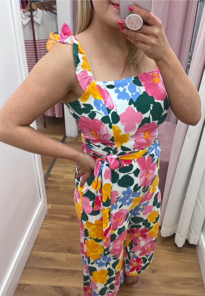 Vibrant floral jumpsuit with multicoloured print. Features a square neckline front and back, elasticated ruffled straps (bra-friendly) and elasticated back with concealed zip closure. With tie waist belt to cinch in the waist, cropped leg and it has pockets for added comfort! Fully lined.