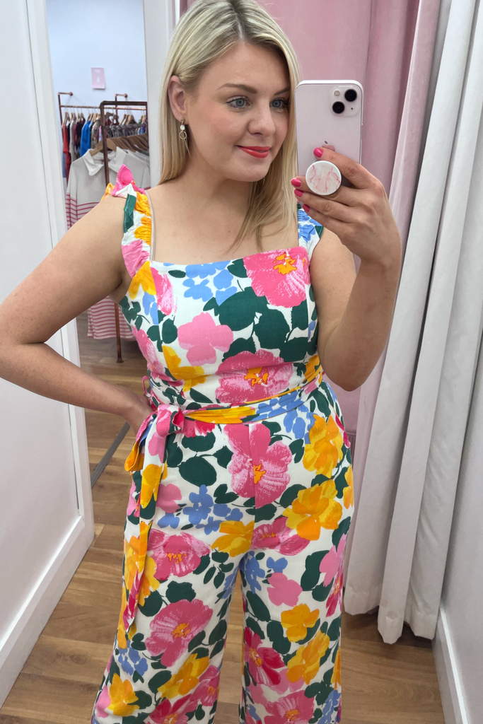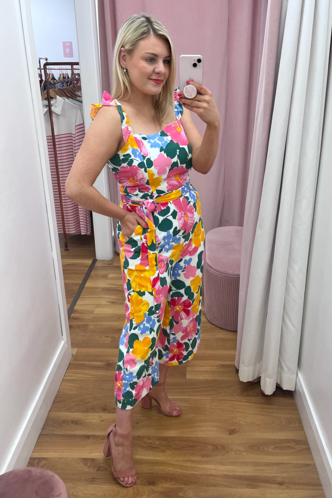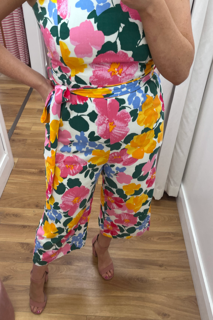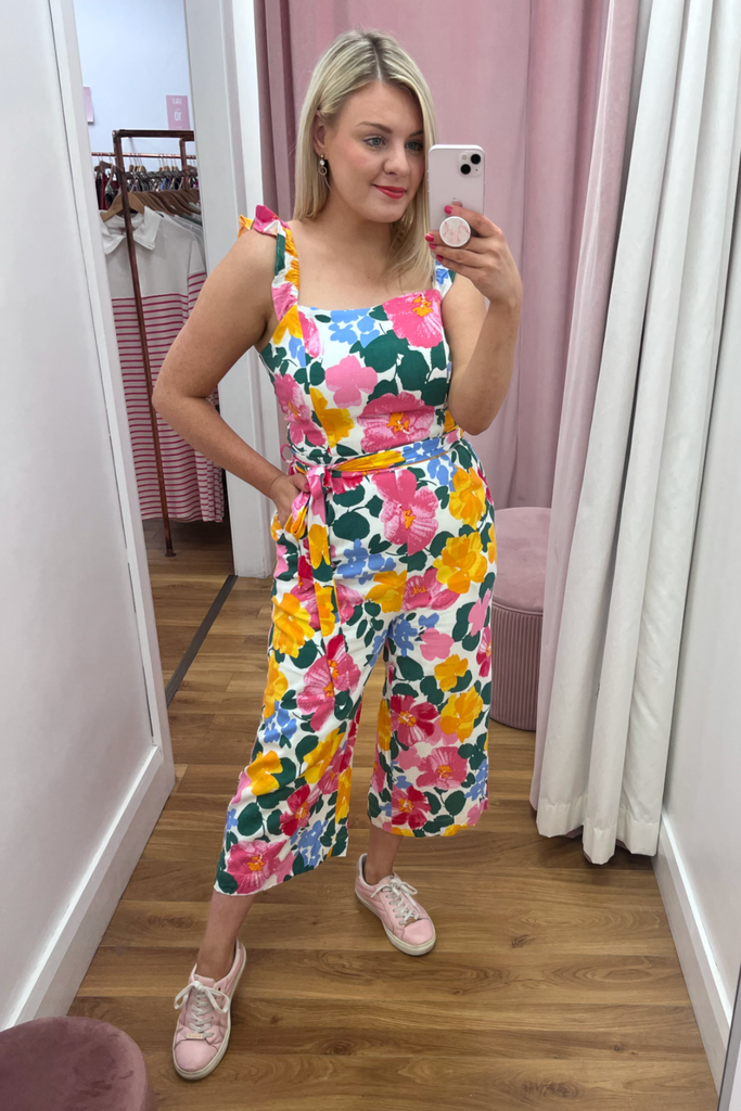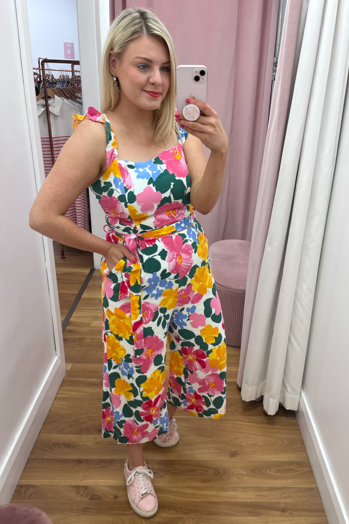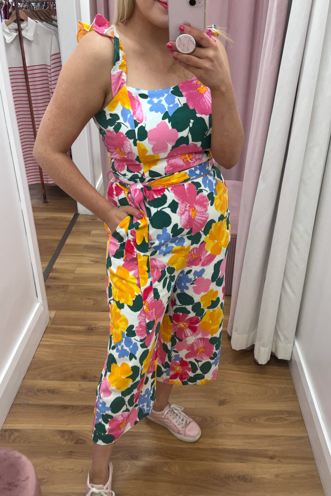 Vibrant floral jumpsuit with multicoloured print. Features a square neckline front and back, elasticated ruffled straps (bra-friendly) and elasticated back with concealed zip closure. With tie waist belt to cinch in the waist, cropped leg and it has pockets for added comfort! Fully lined.