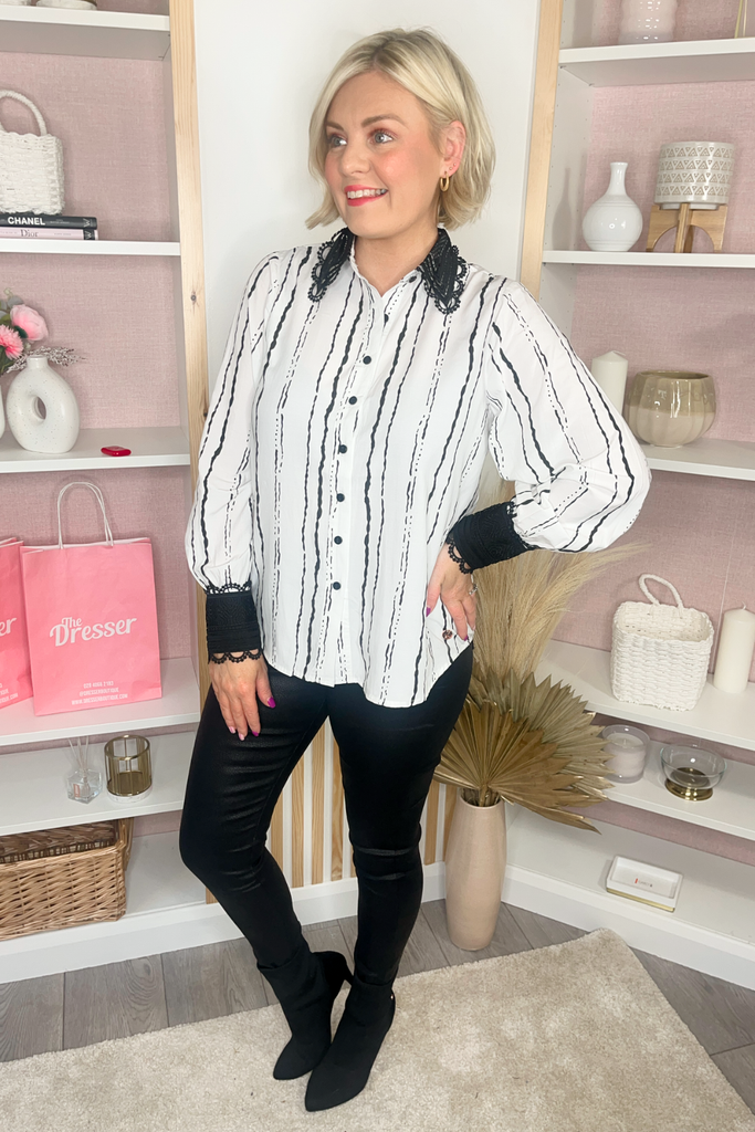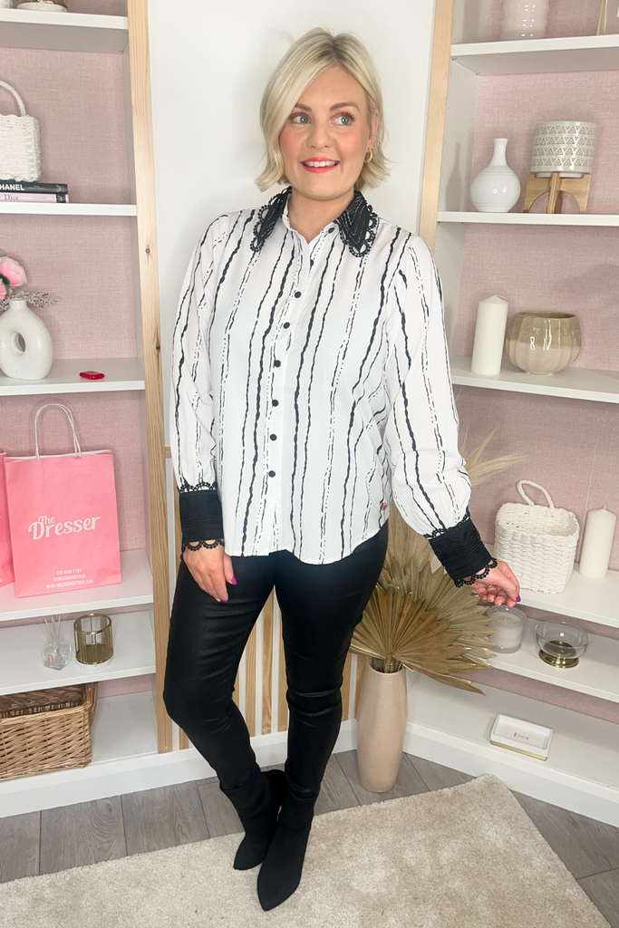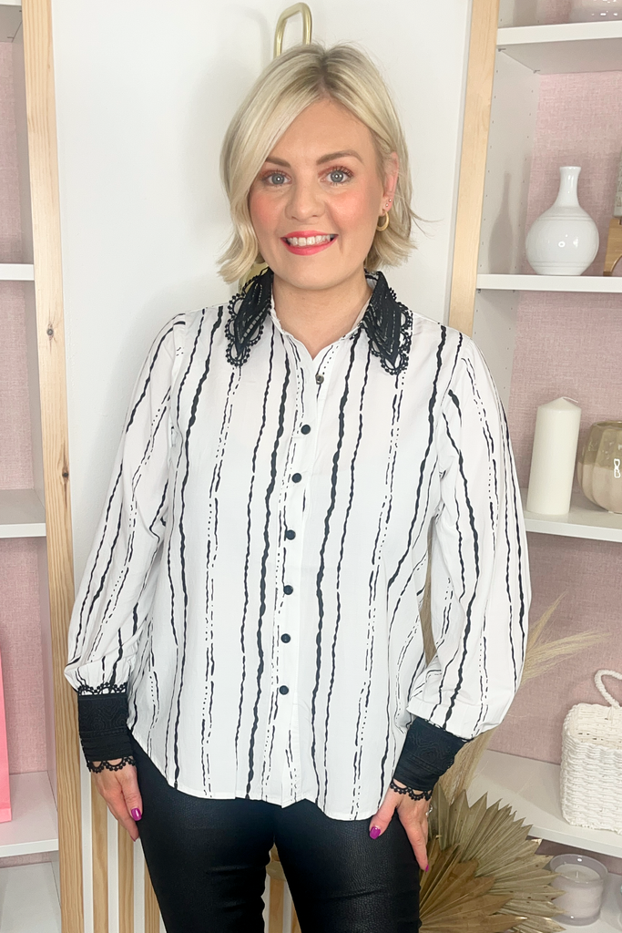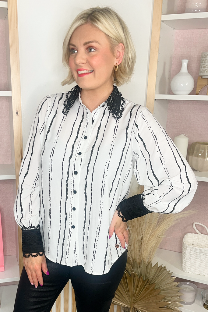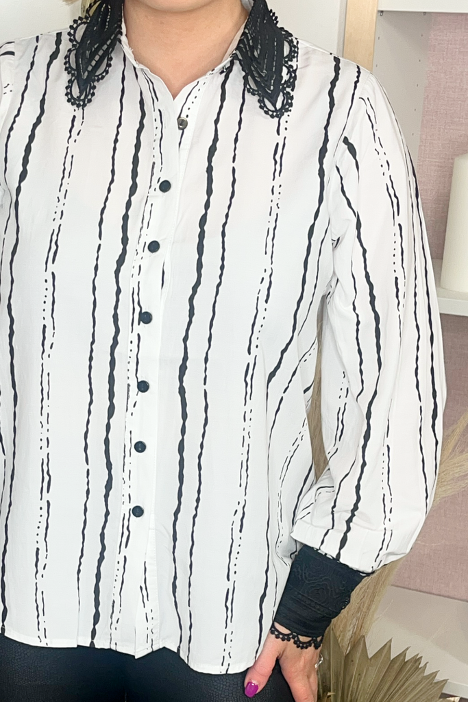 Contrasting white and black buttoned blouse with lace collar and cuff