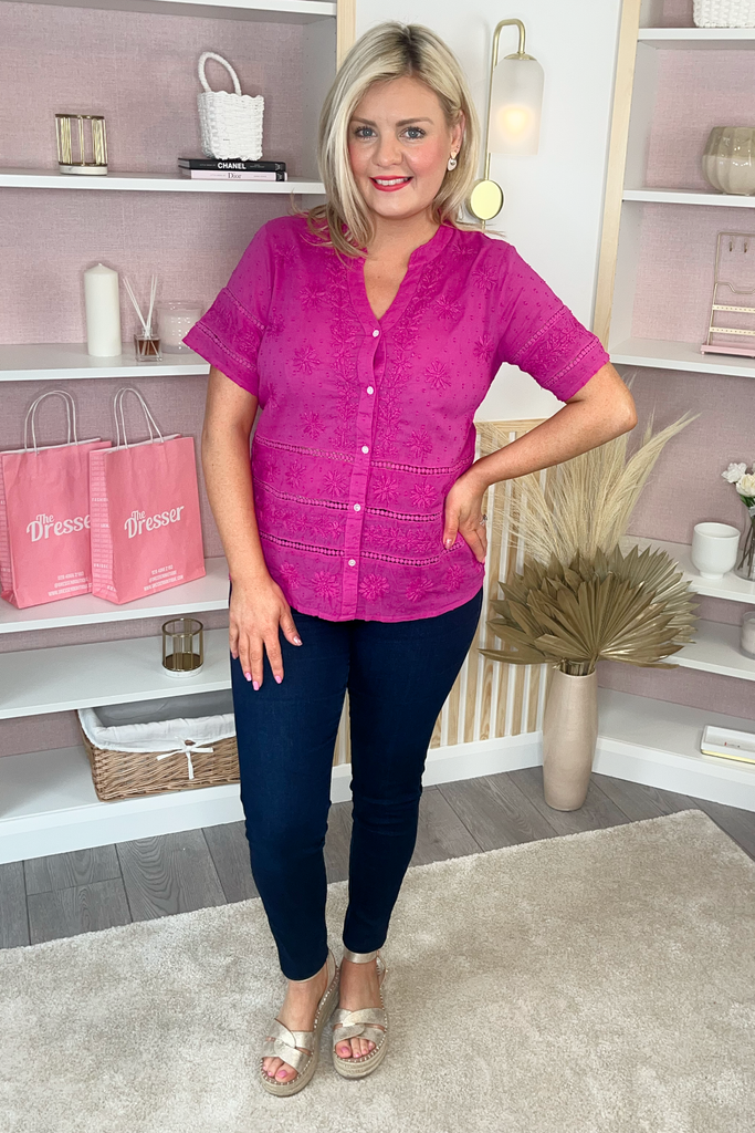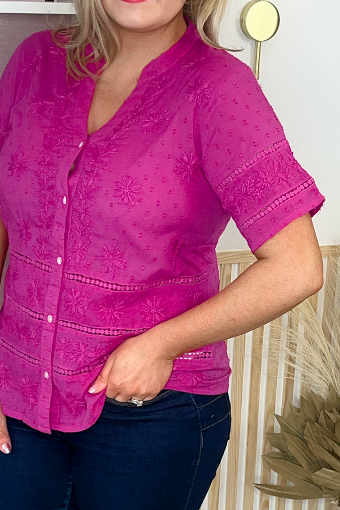 Soft blouse with V-neckline, broderie anglaise and buttoned front. With half sleeve featuring embroidered trim. Perfectly paired with denims and a trainer, wedge or heel.