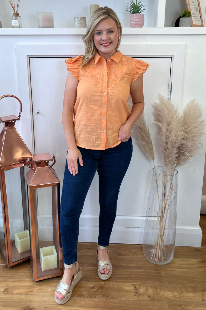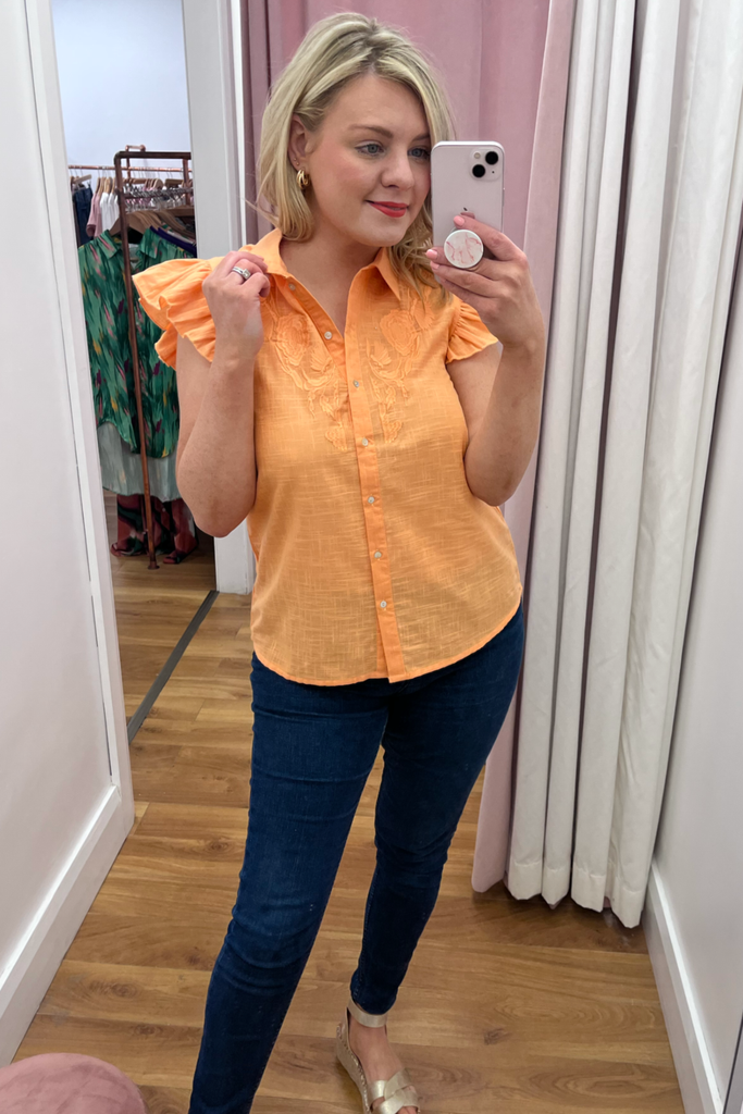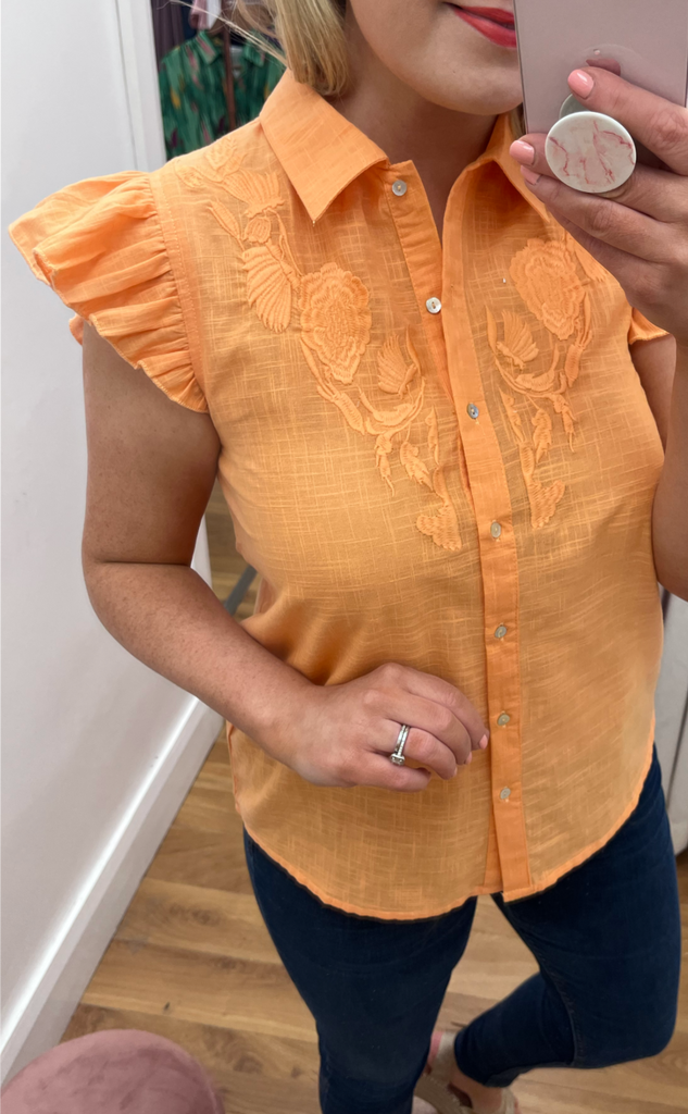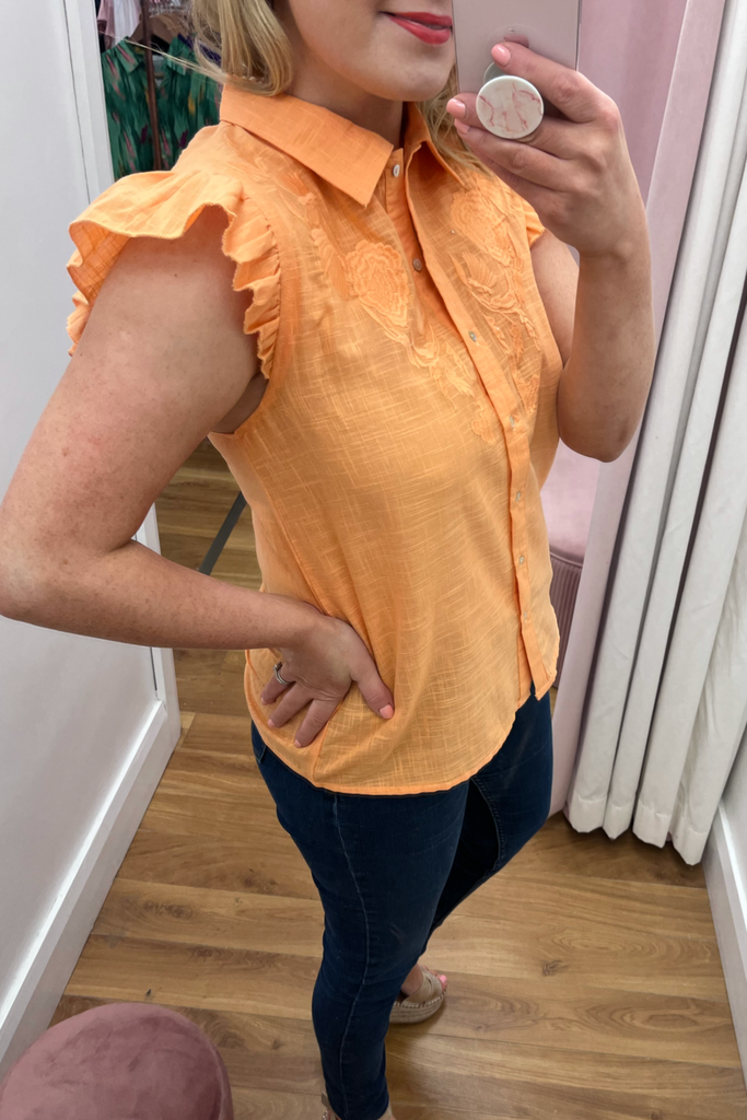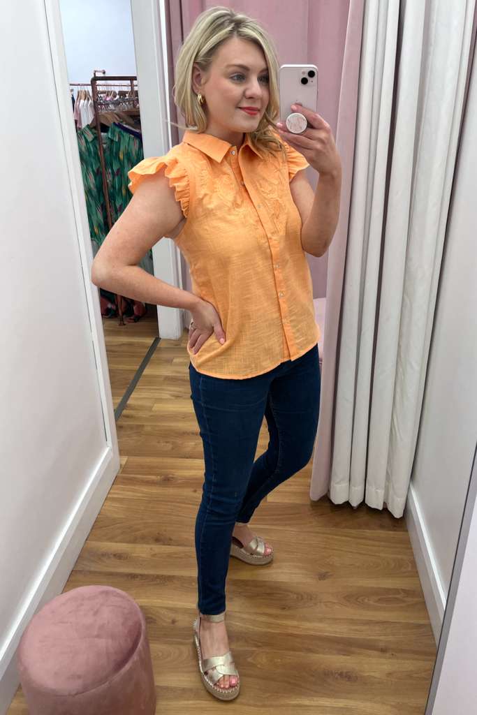 Broderie anglaise, collar and delicate ruffled cap sleeve. Perfectly paired with denims and a trainer, wedge or heel.