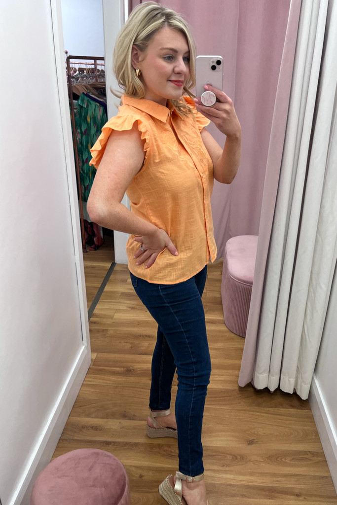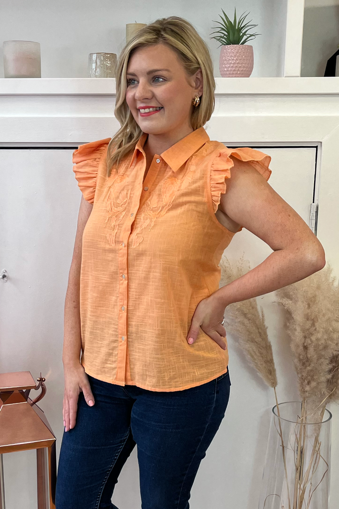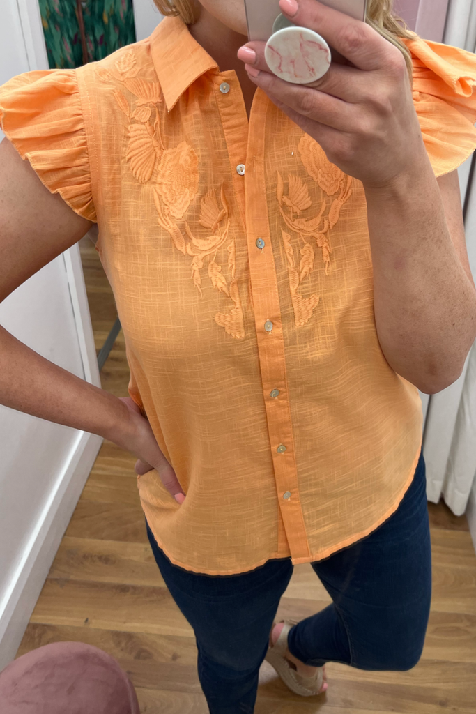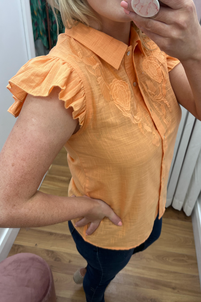 Broderie anglaise, collar and delicate ruffled cap sleeve. Perfectly paired with denims and a trainer, wedge or heel.