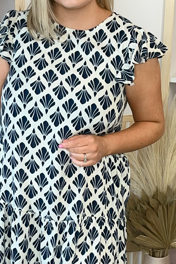Cream rand navy round neck dress with flutter cap sleeve and frilled dropped hemline. Features pockets