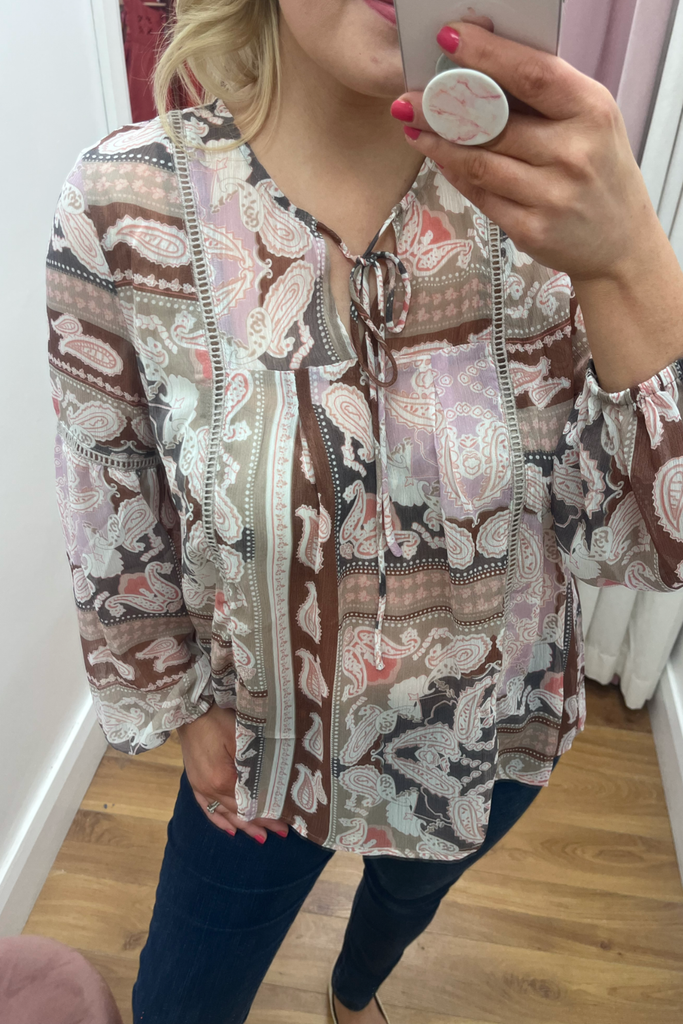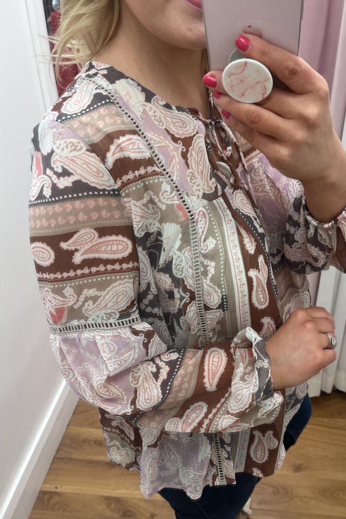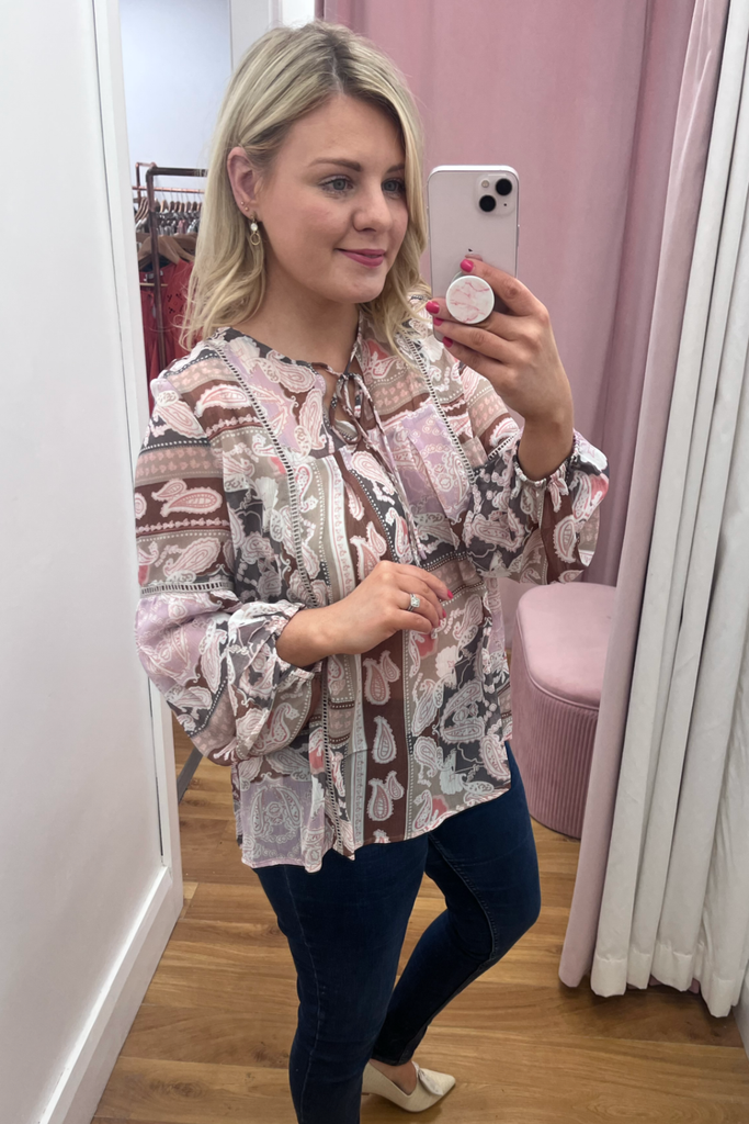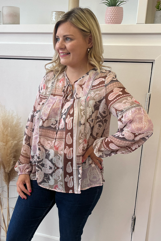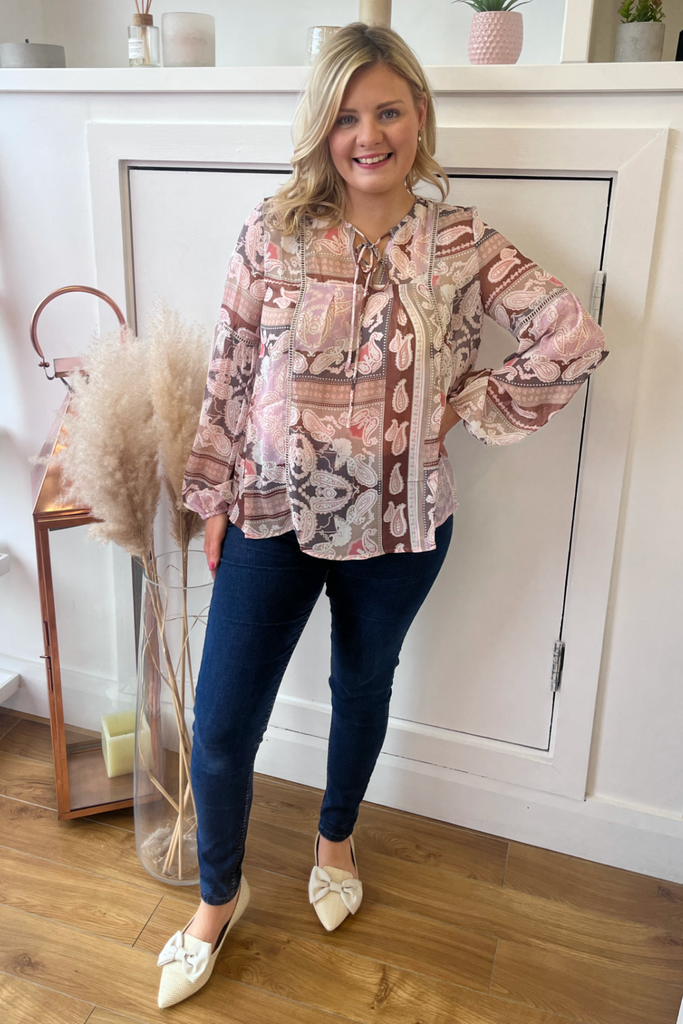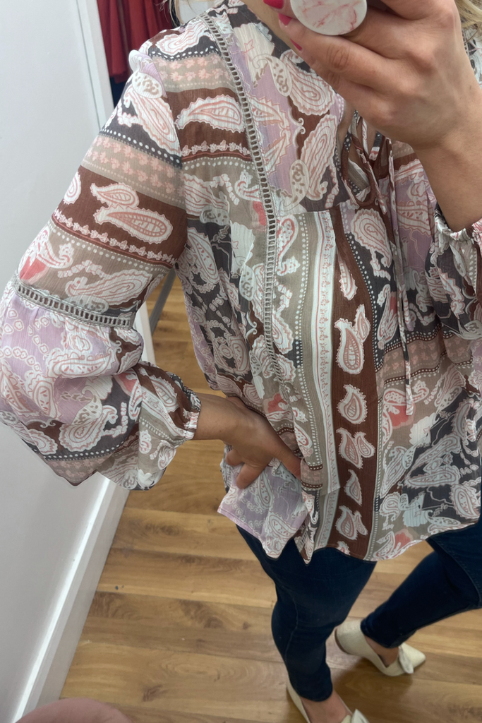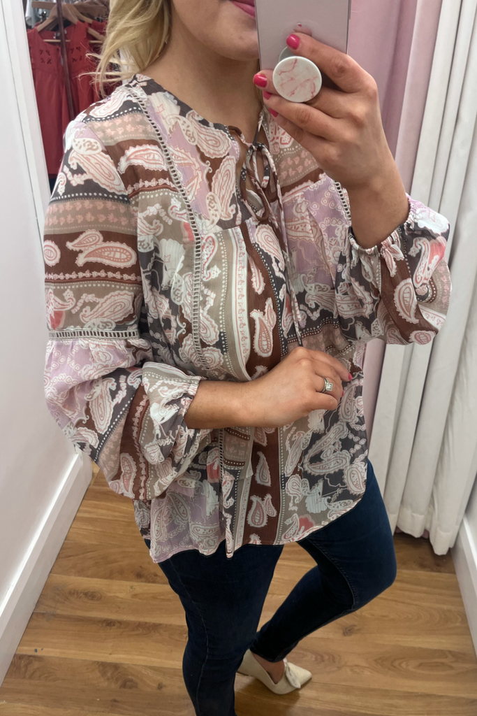 Printed blouse in a mix of pinks. Perfectly paired with denims and a trainer or wedge.