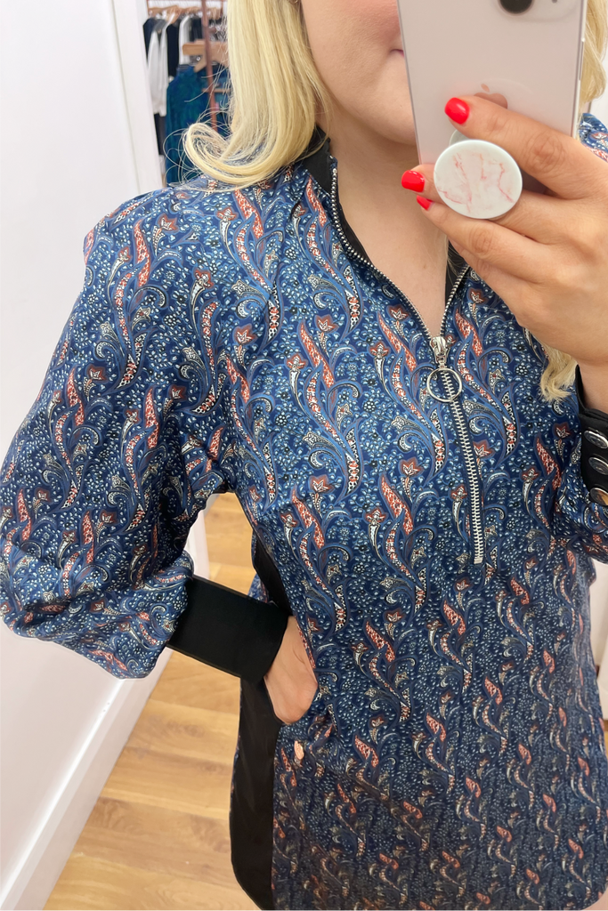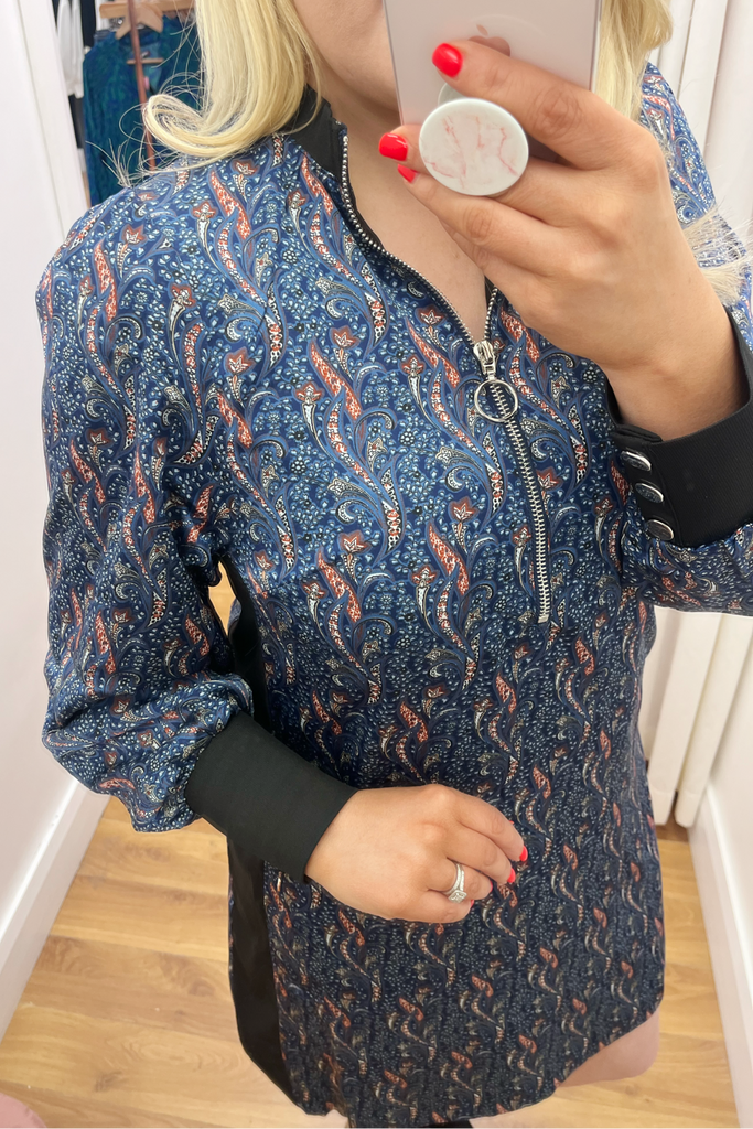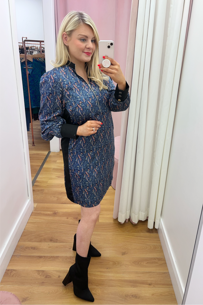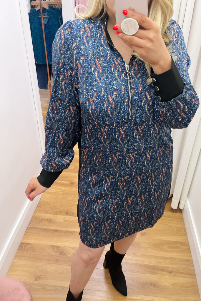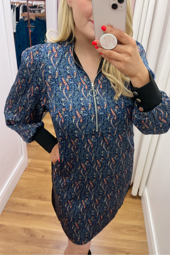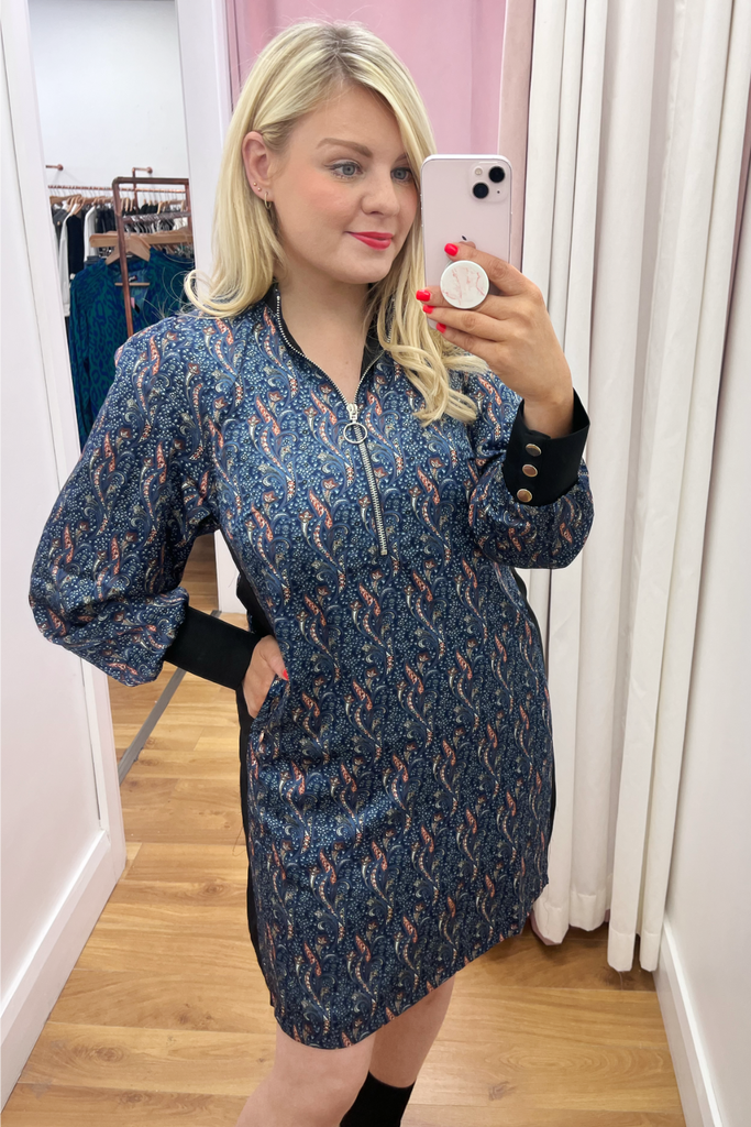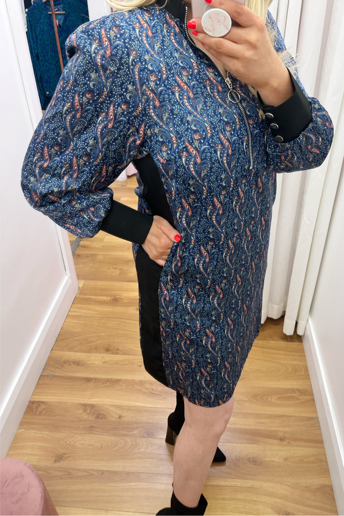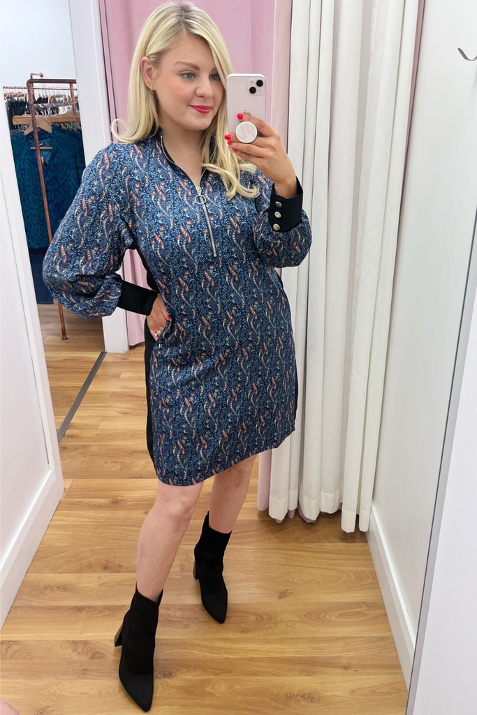 Printed all over with an abstract geometric 70’s style print, this shift dress is designed with a zipped collar neckline and long slightly blouson sleeves with sporty ribbed trims. Features contrasting panel down each side. This dress is effortless cool!! Style with biker boots and trainers alike.