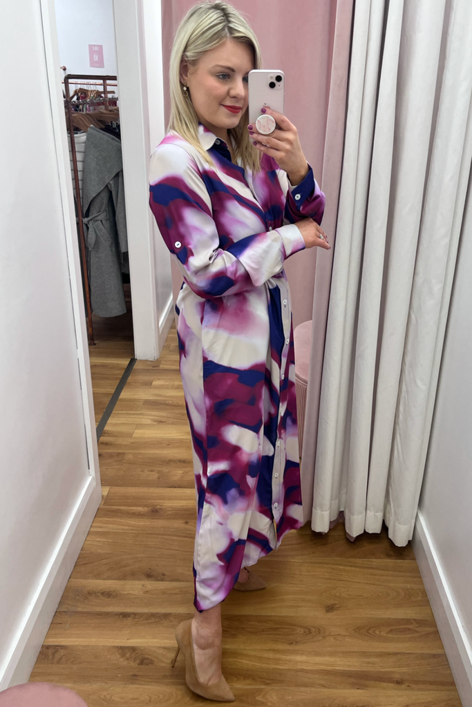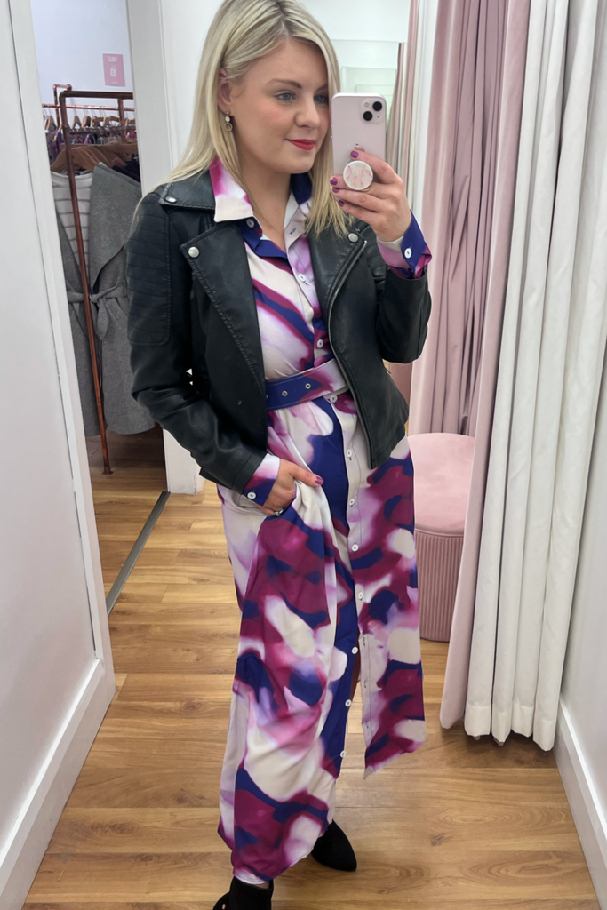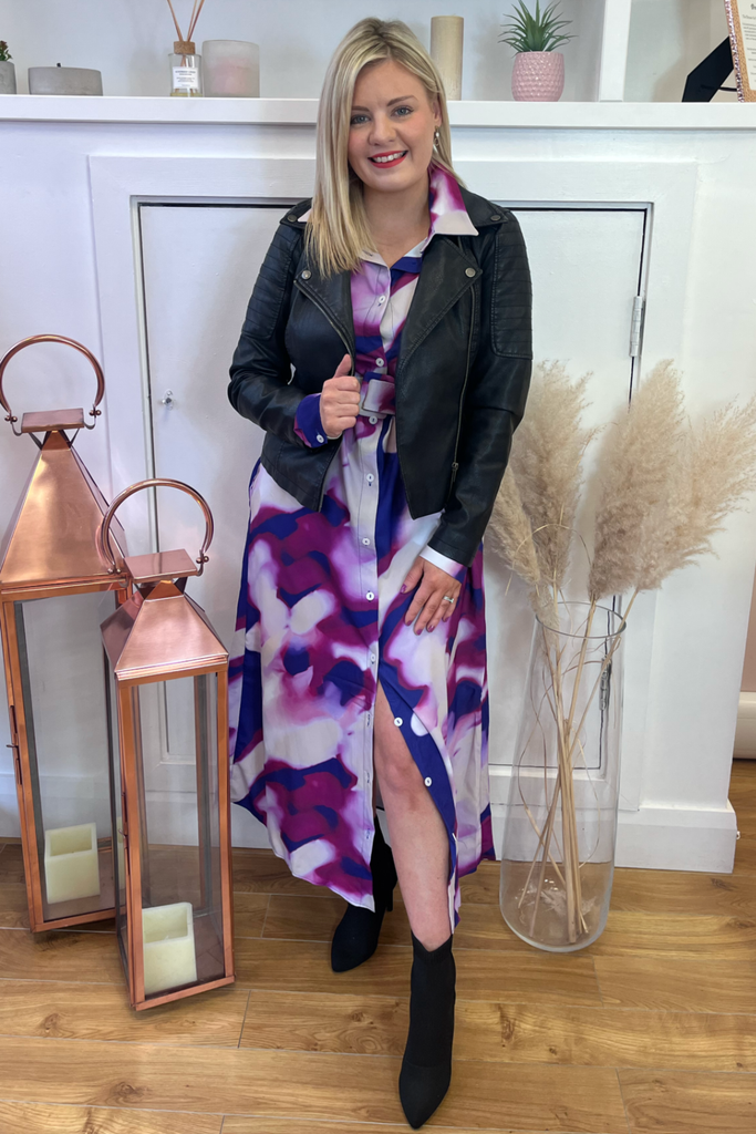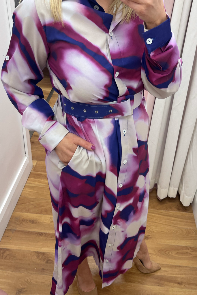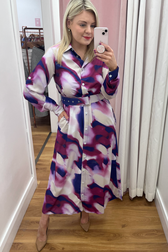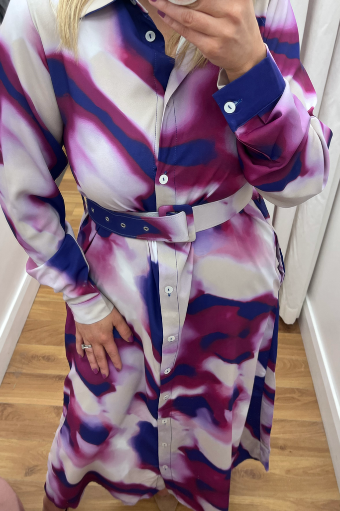 Stunning button-down collared shirt dress with statement material structured belt, and pockets. It has adjustable length sleeve with button to roll up and fix in place. In a midi length, its the perfect dress to pair with heels, boots or trainers!