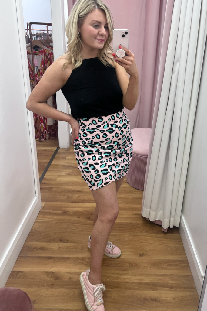 A pretty pink mini skirt with mint leopard print. In a faux wrap look with gathered detail. Dress up with a blouse or cami and a heel, or dress down with a knit and tee and trainer!