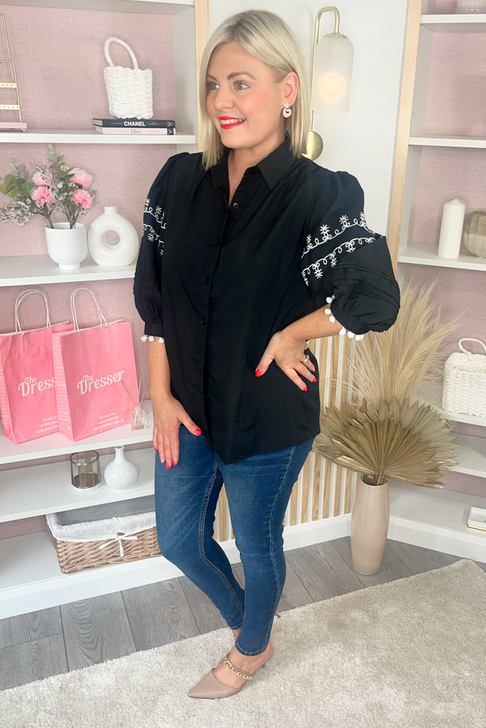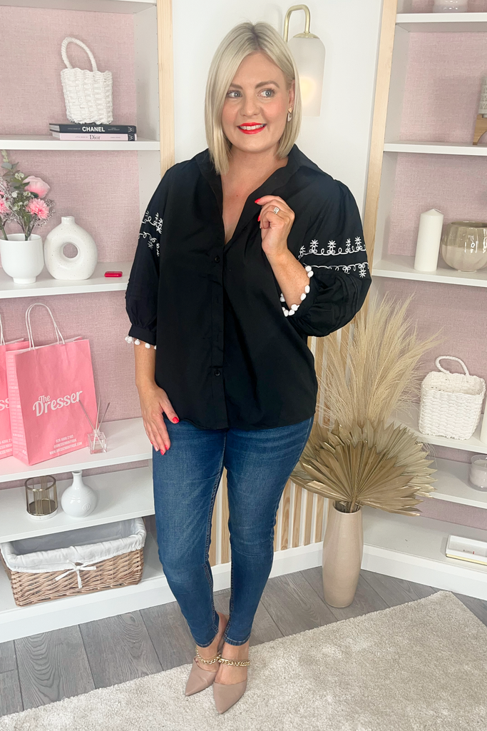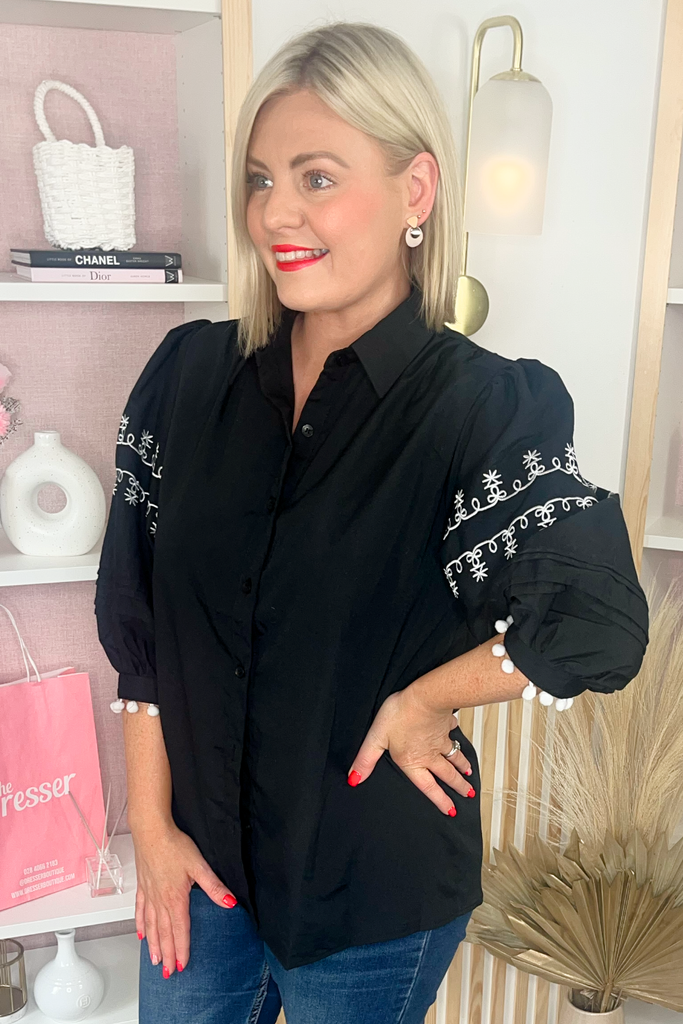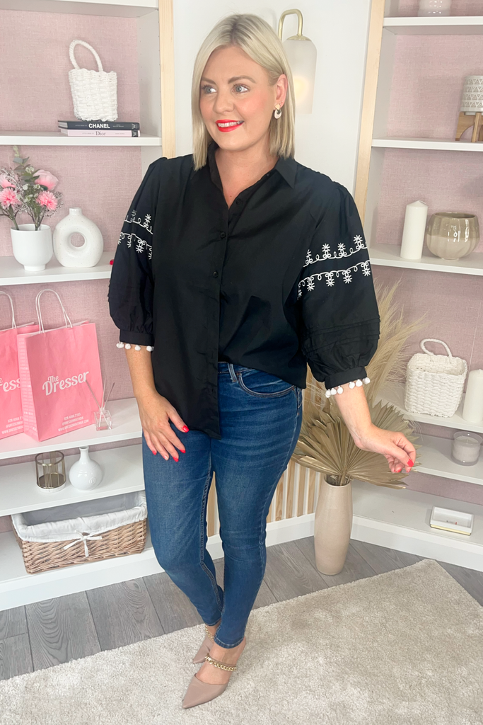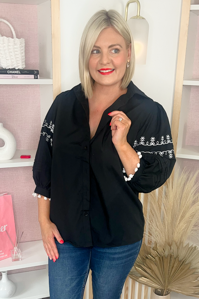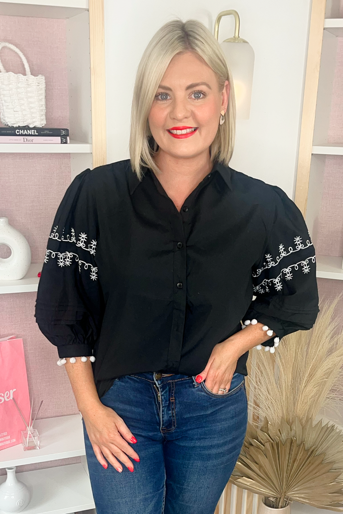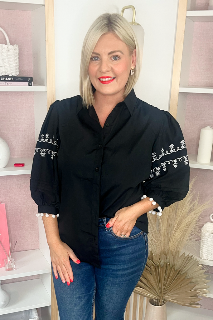 Cotton shirt with collar and balloon 3/4 length sleeves. With embroidery details, tightened cuffs with pompom finish. Button closure on the front. Relaxed fit.