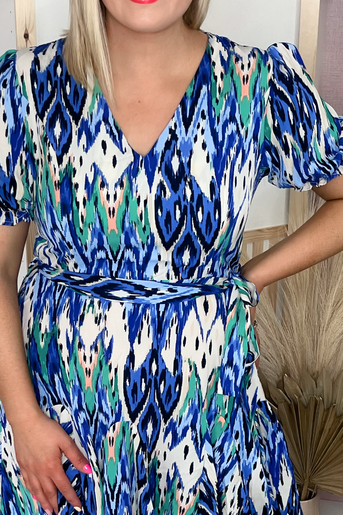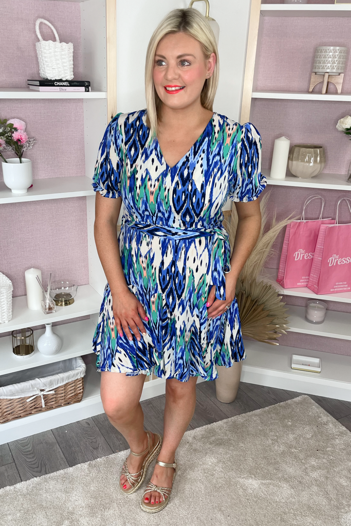 V-neck dress with bold print. With half sleeve, fitted waist, tie belt and skater skirt