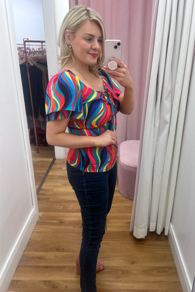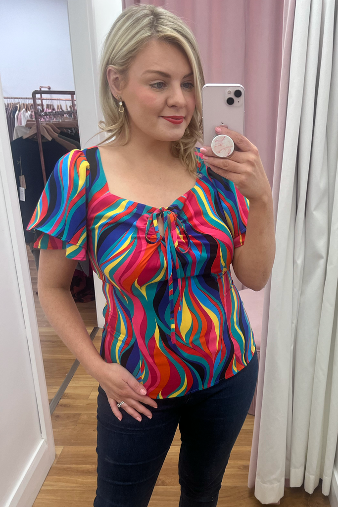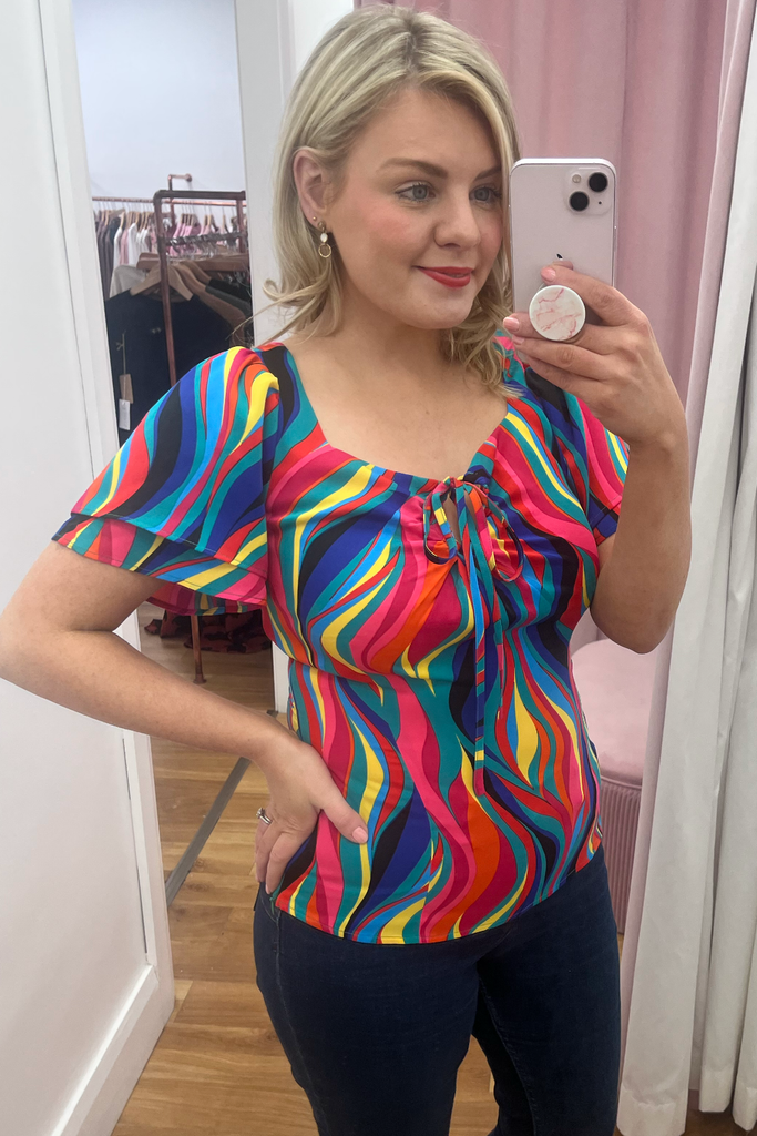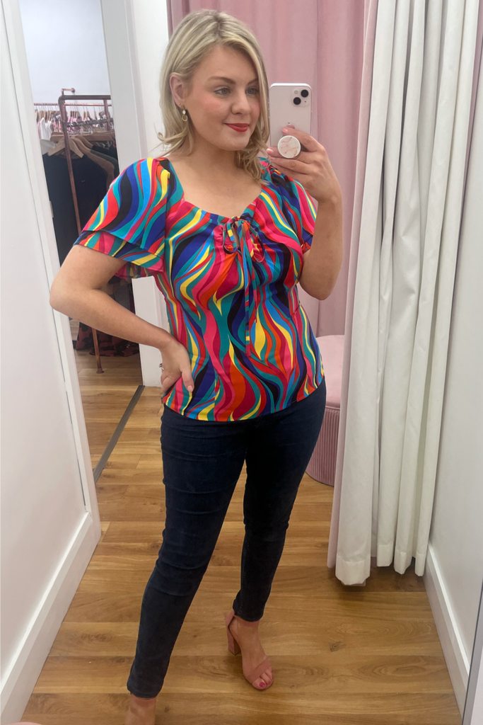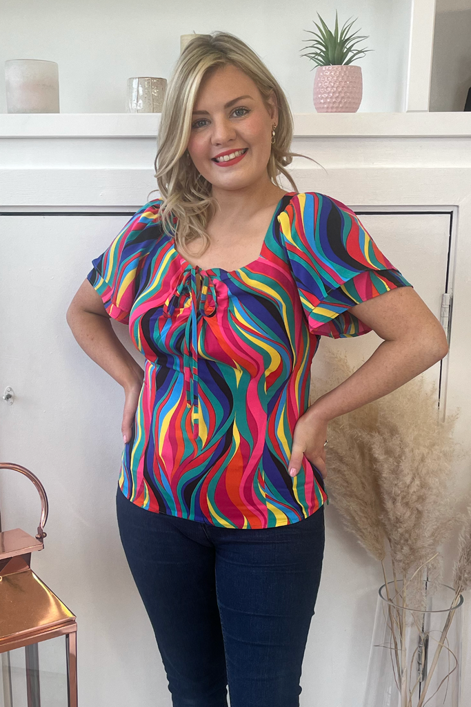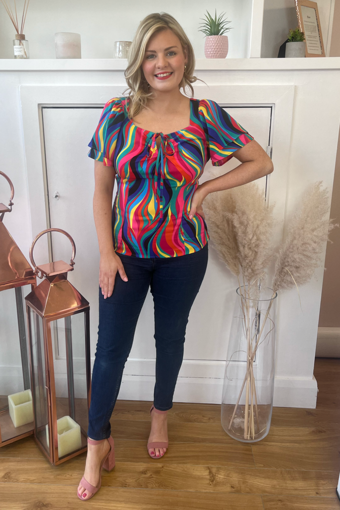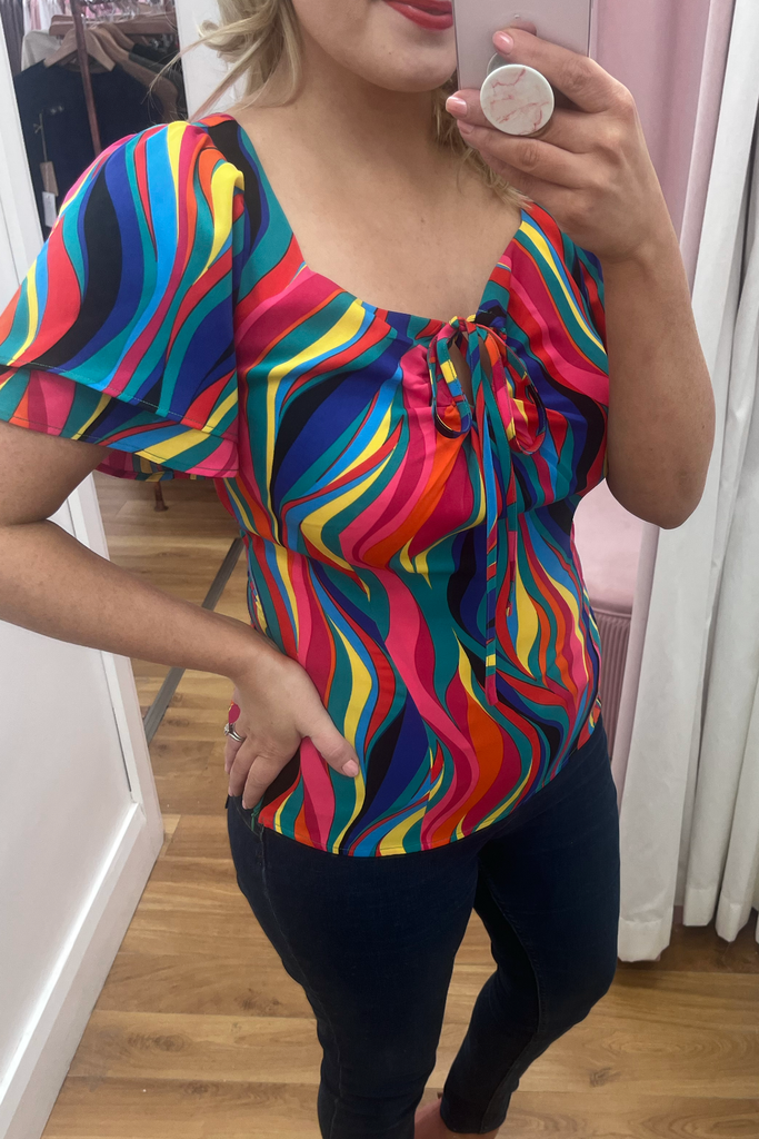 Multi-coloured rainbow print top with double half length floaty sleeve and sweetheart neckline. It has a sculpted shape on the body with side underarm zip. The tie can be styled as a bow or a halter round the neck