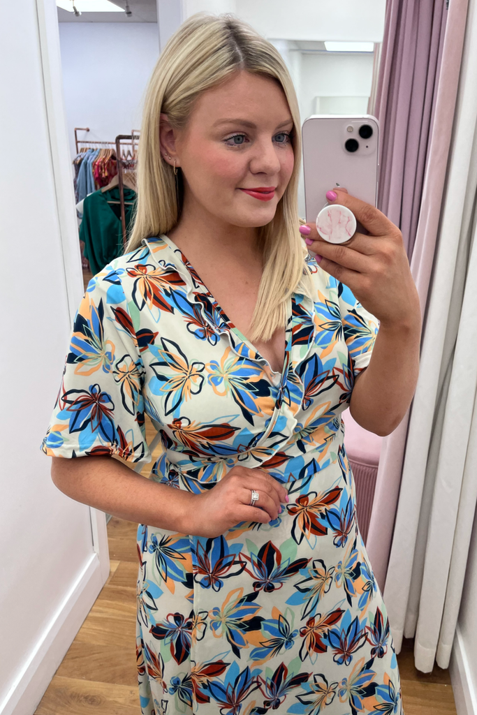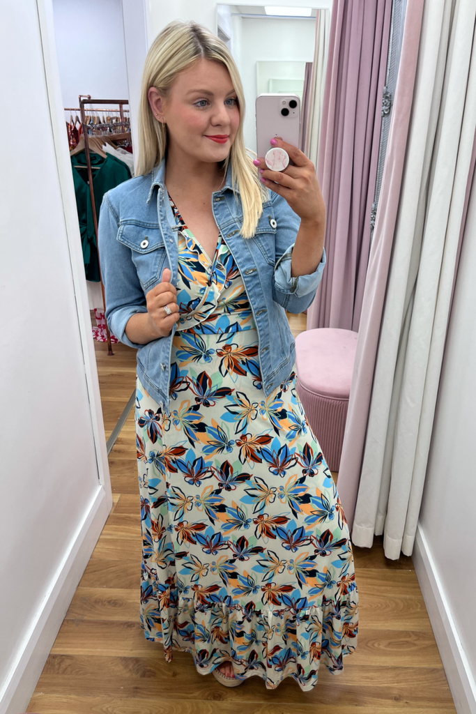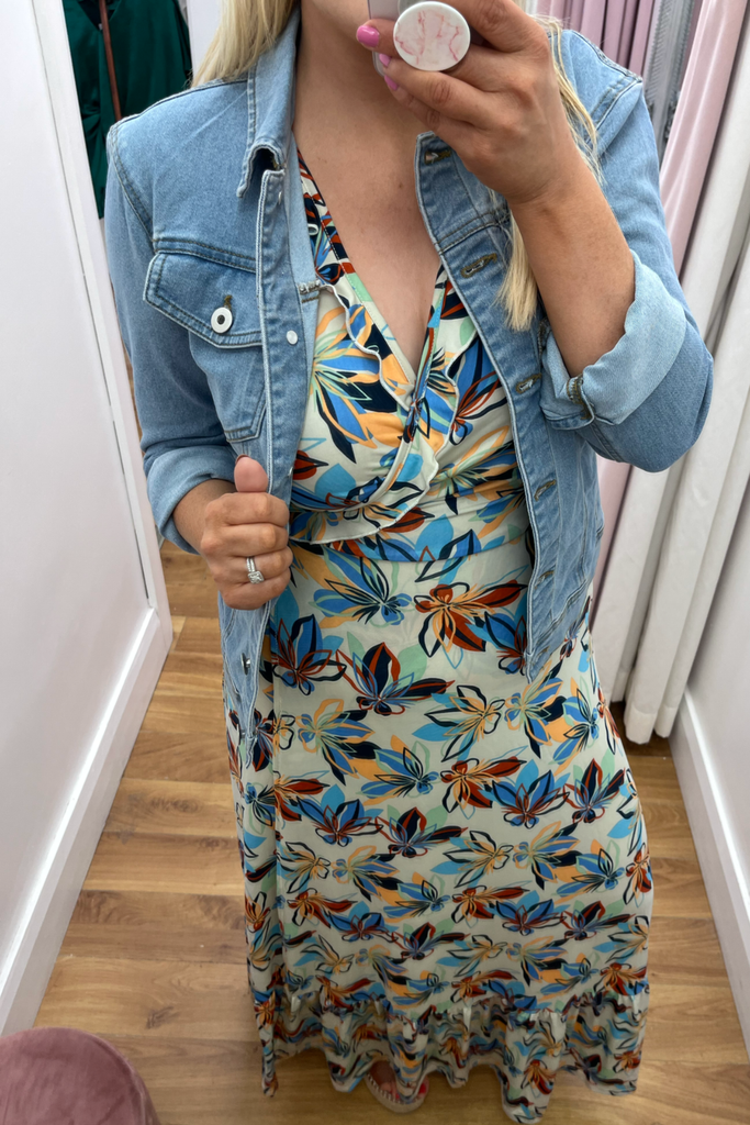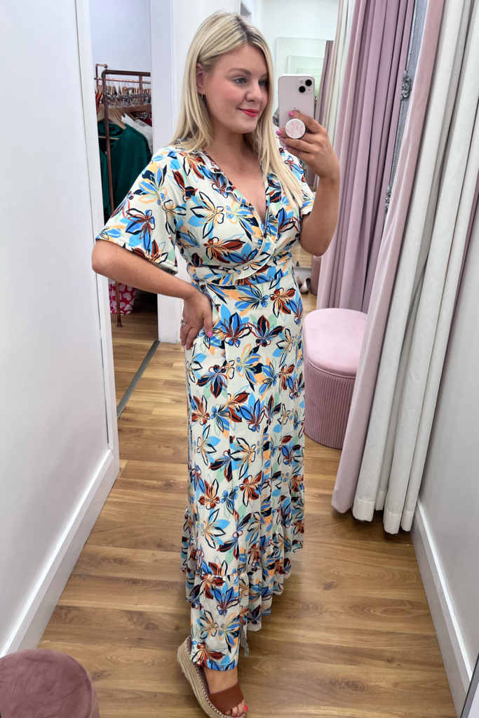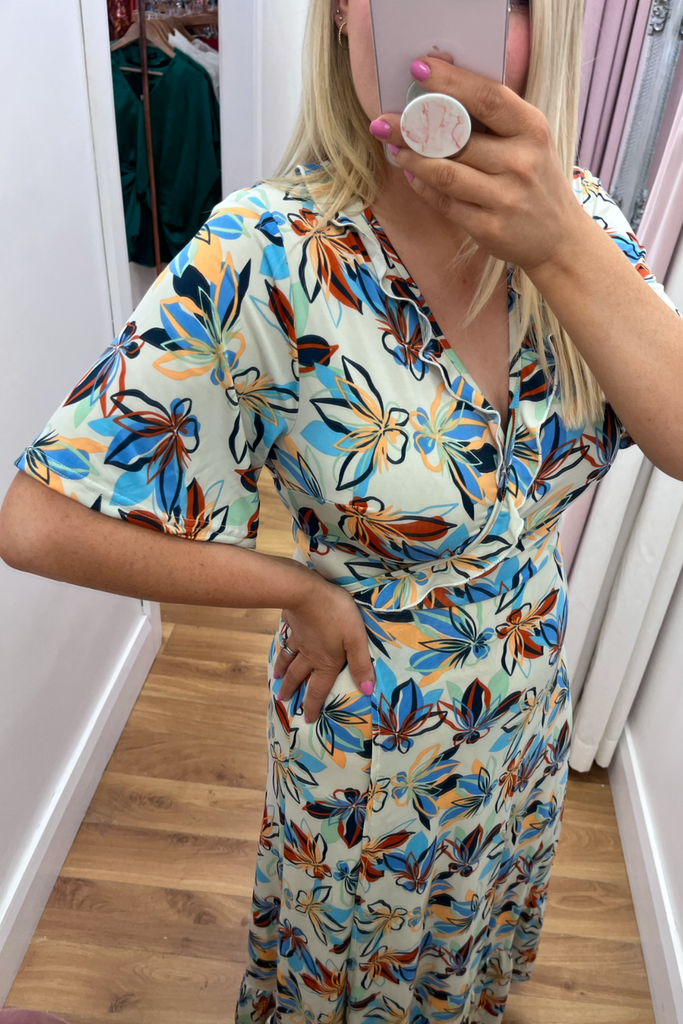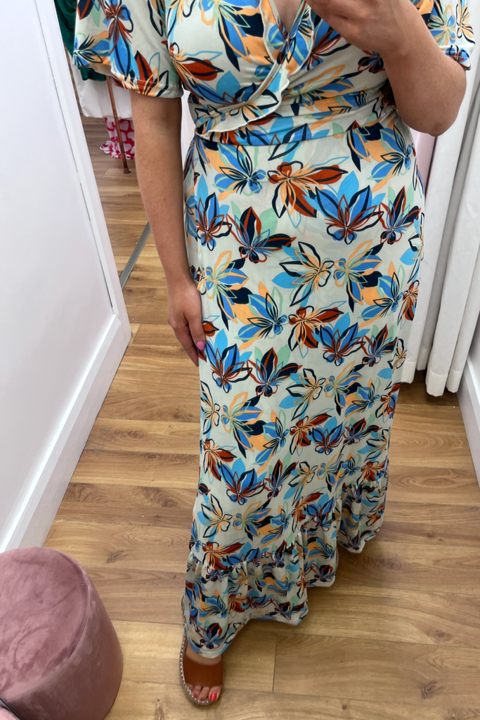 Wrap maxi length dress with frill detail along the chest and hemline and half sleeve. In a mix of blues, green and orange on a navy background. It has great stretch, comfort and amazing shape!