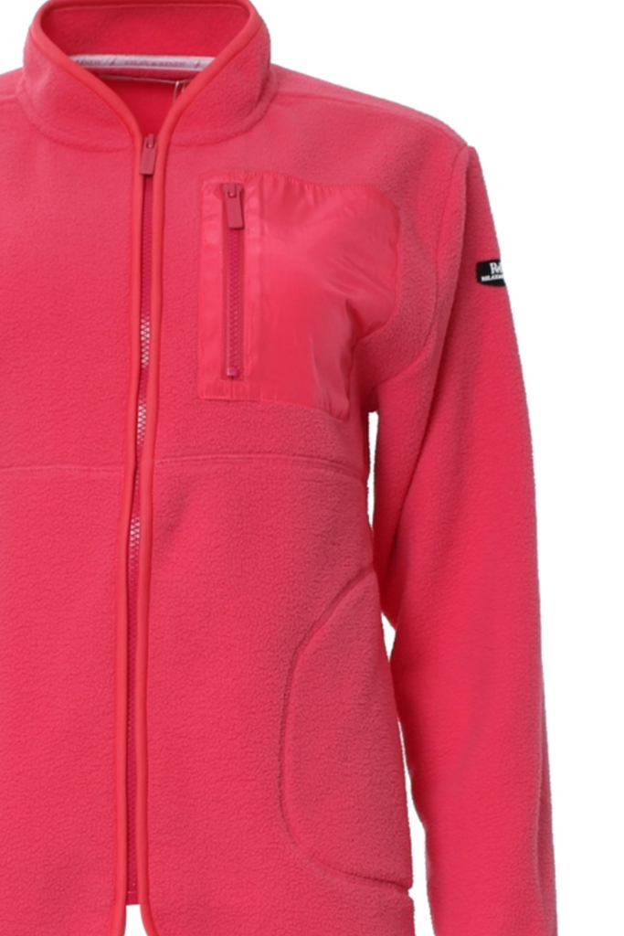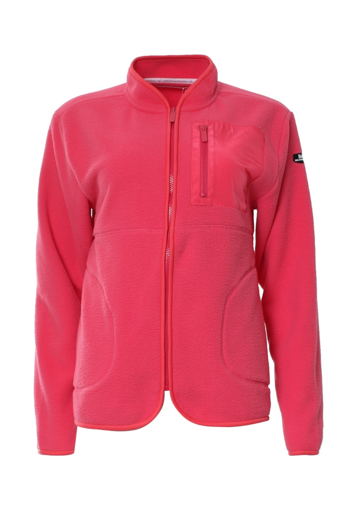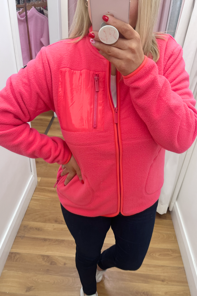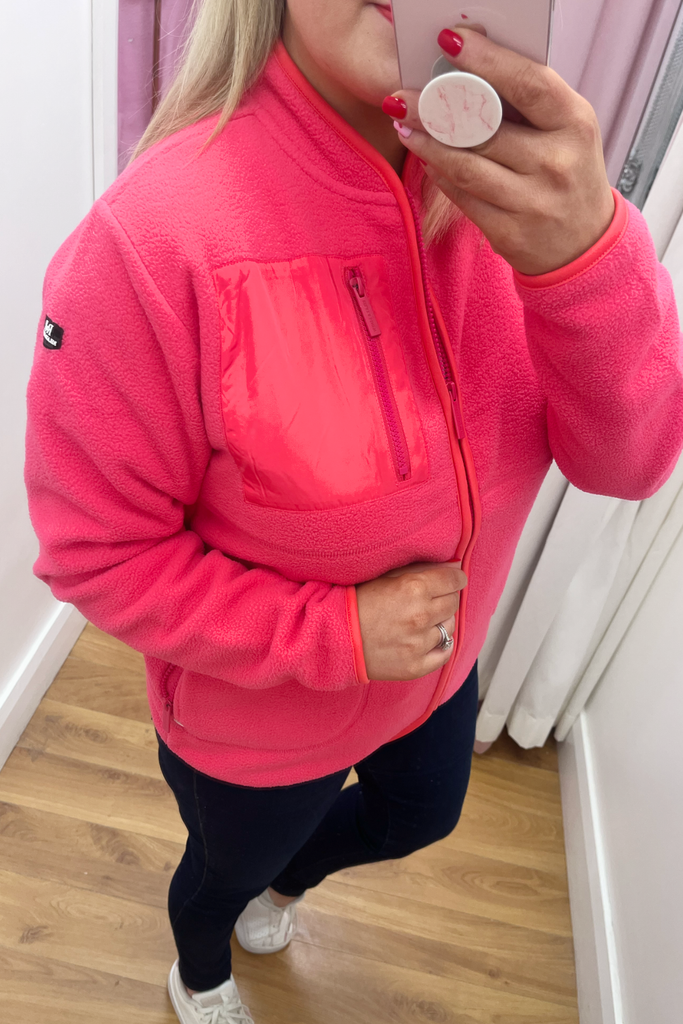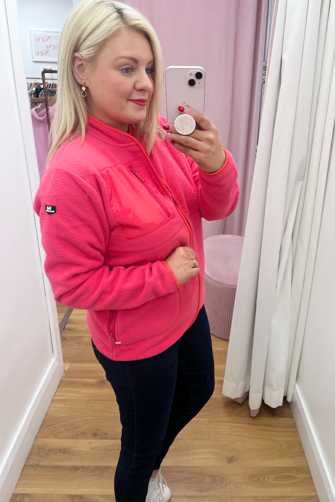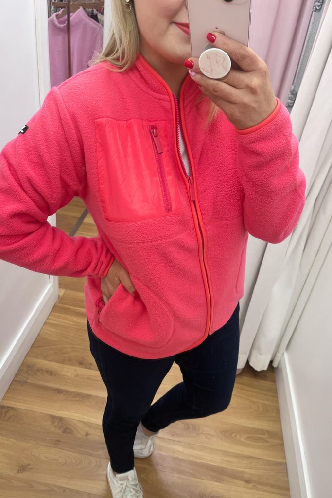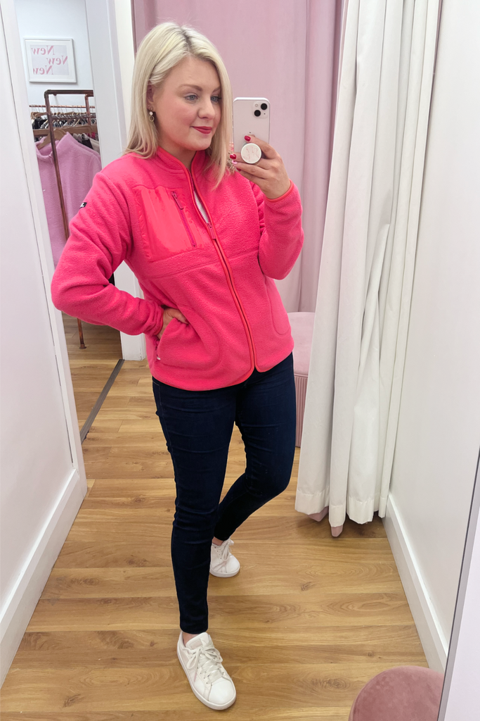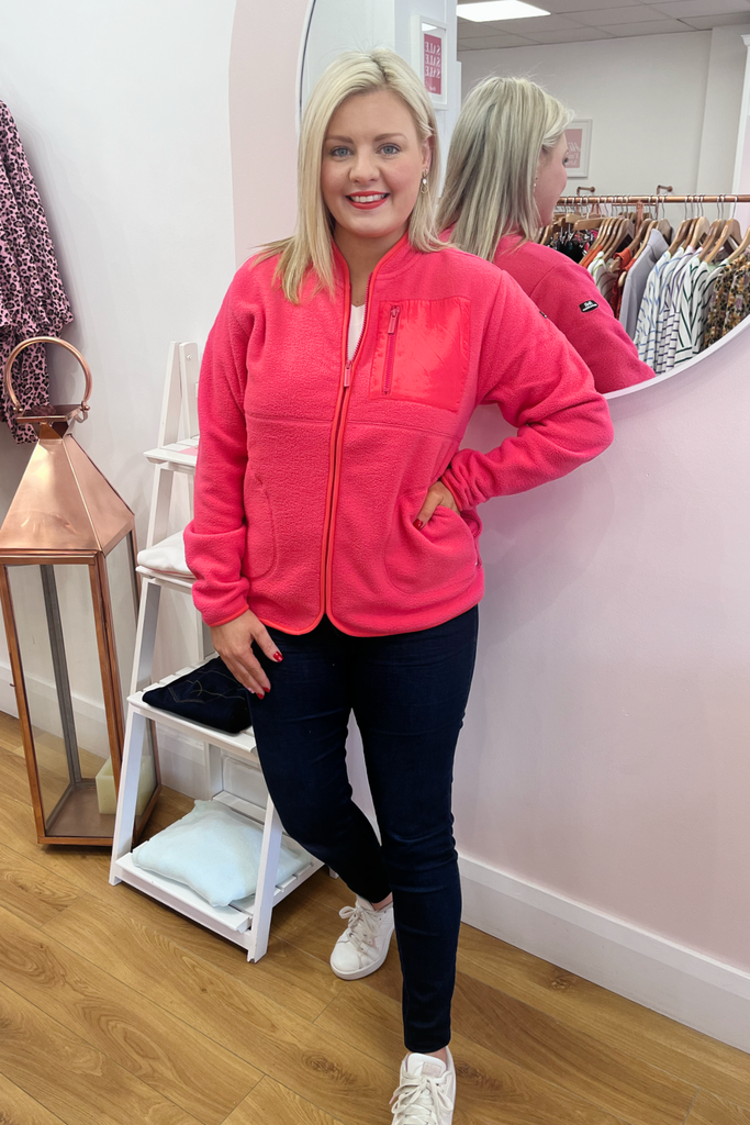 A vibrant coral pink zipped fleece, perfect for adding a bold touch to your outfit while providing functionality with the zipper closure. The Catherine also comes in a soft neutral cream colour.