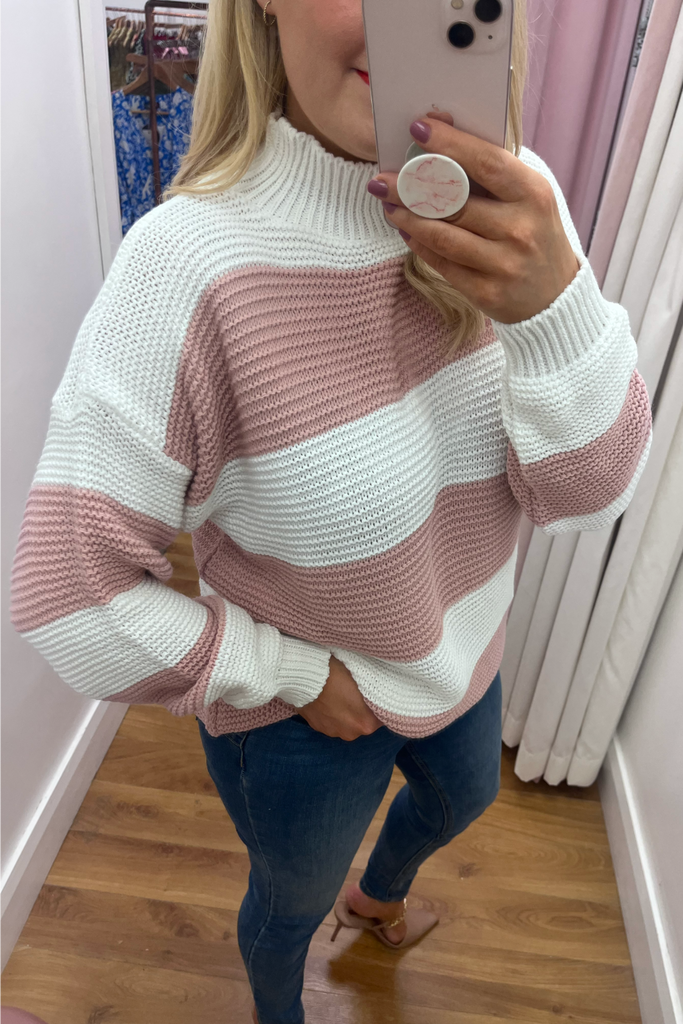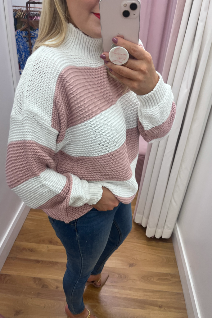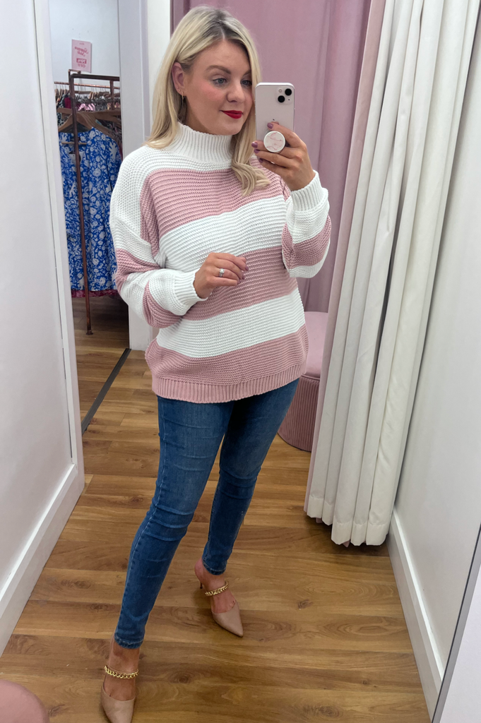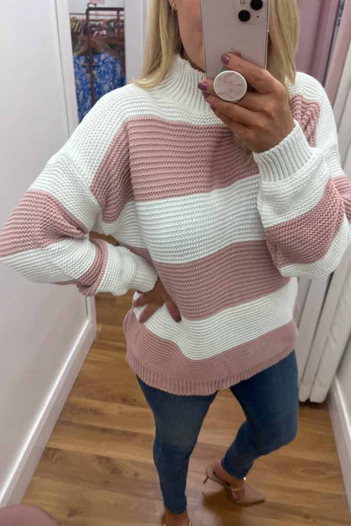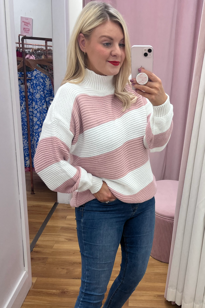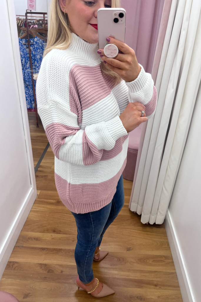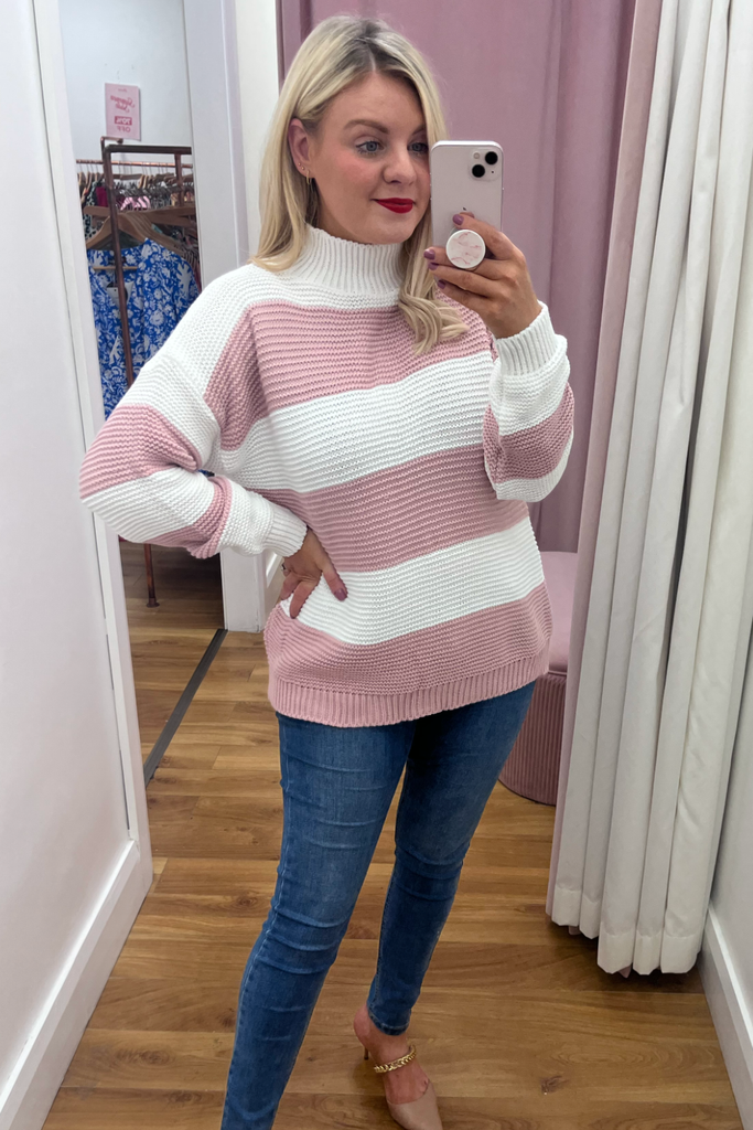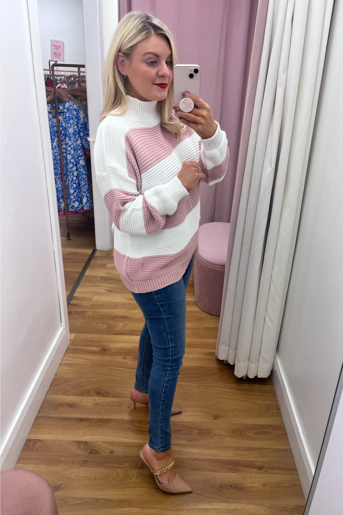 Super soft, quilted feel knit in white with a soft pink stripe. Features a raised neckline and lovely length