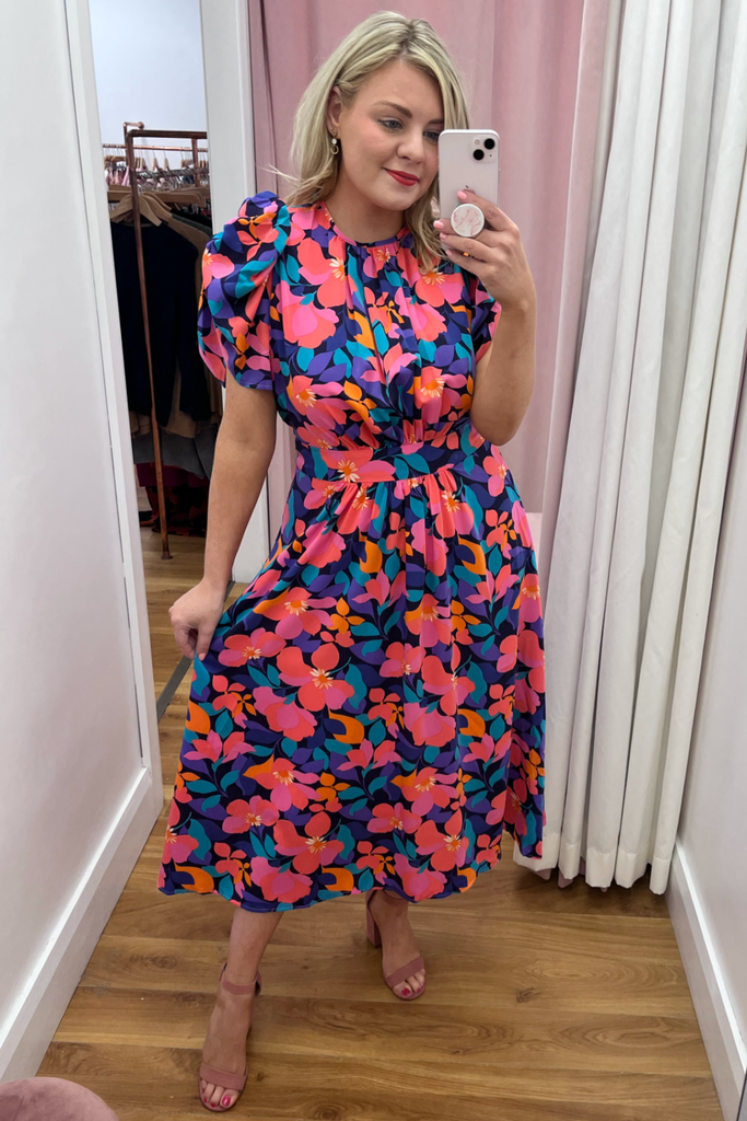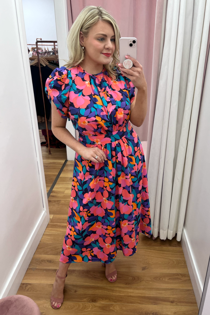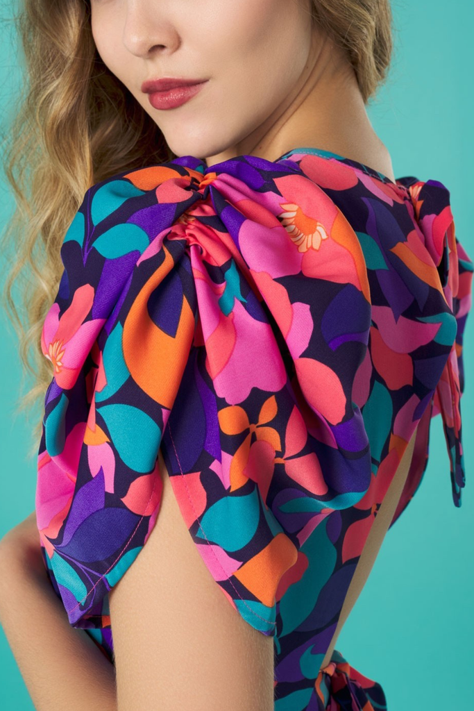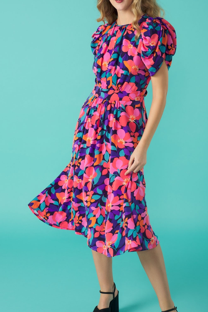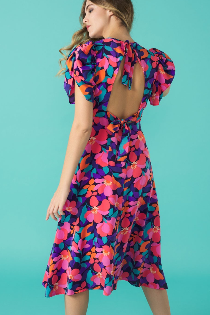 Vibrant floral midi with half puff sleeve, gathering at the bust and fitted waistband. Features back cut-out detail which ties both at the back of the back and lower back. Perfect for your Summer events!