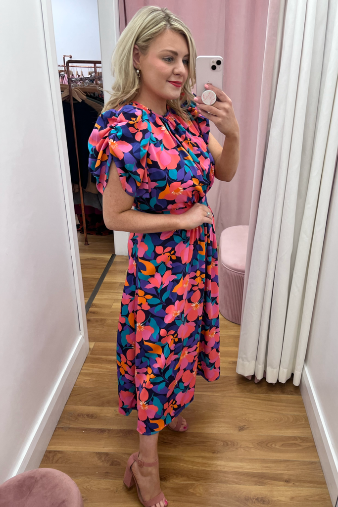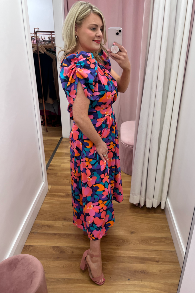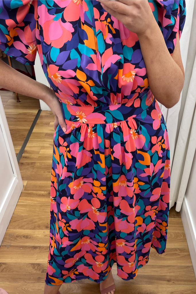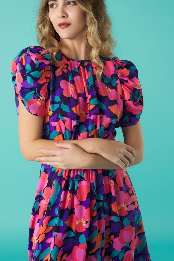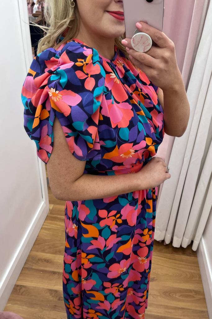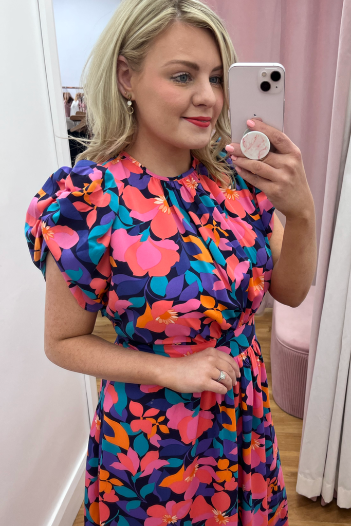 Vibrant floral midi with half puff sleeve, gathering at the bust and fitted waistband. Features back cut-out detail which ties both at the back of the back and lower back. Perfect for your Summer events!