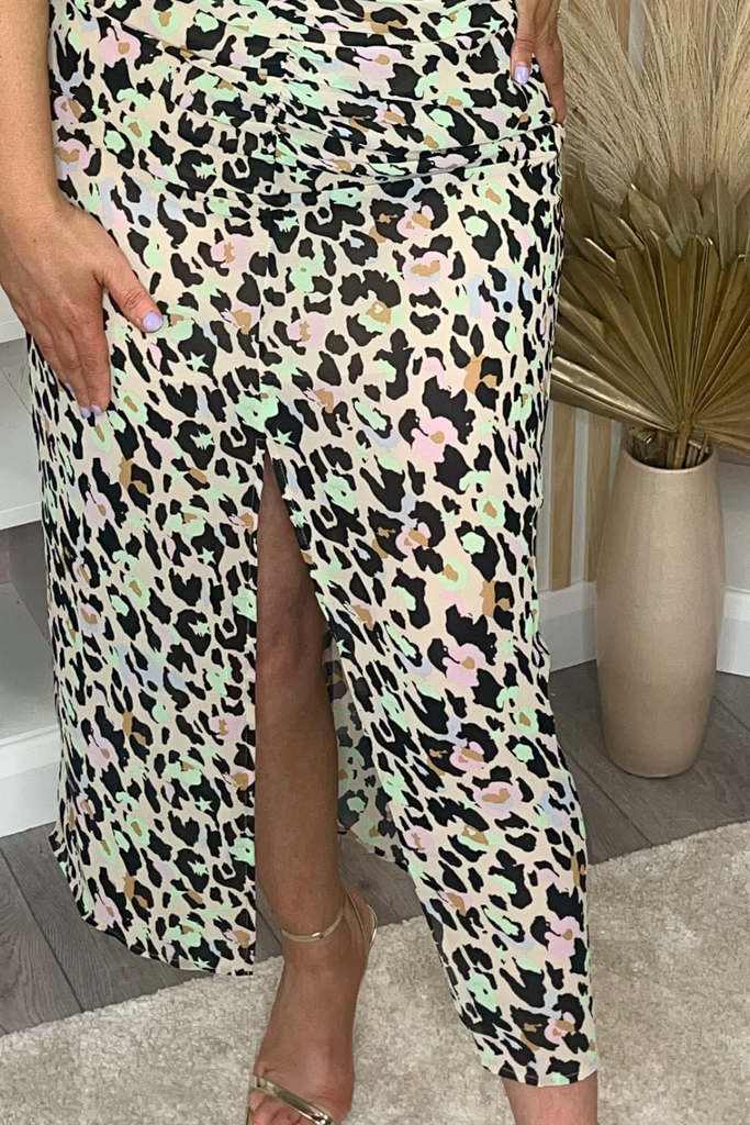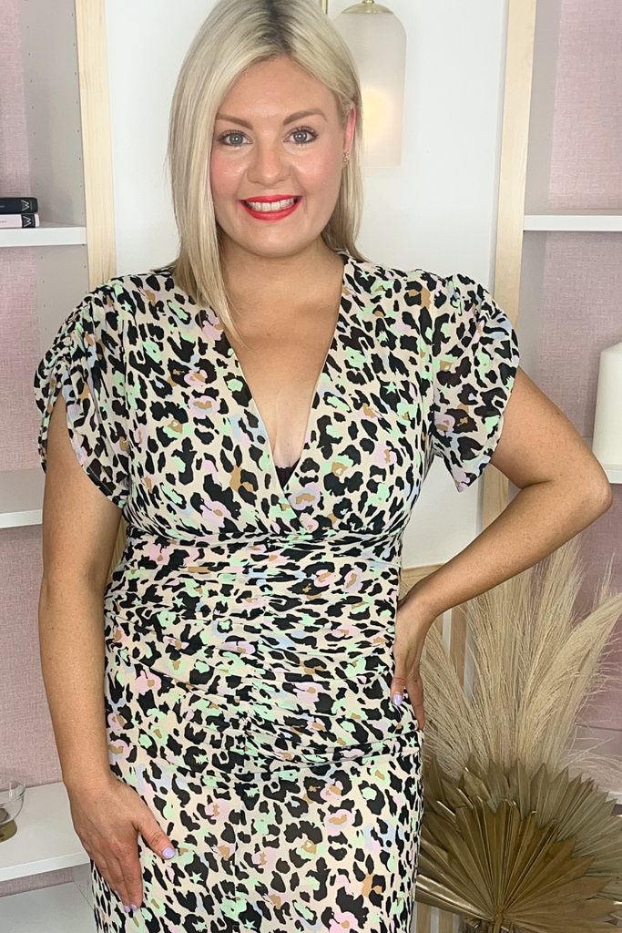 Multi printed animal dress with deep V-neckline. This style features a ruched half sleeve, ruched front and statement split at the front of the skirt. It is lined to the knee and zips to the back